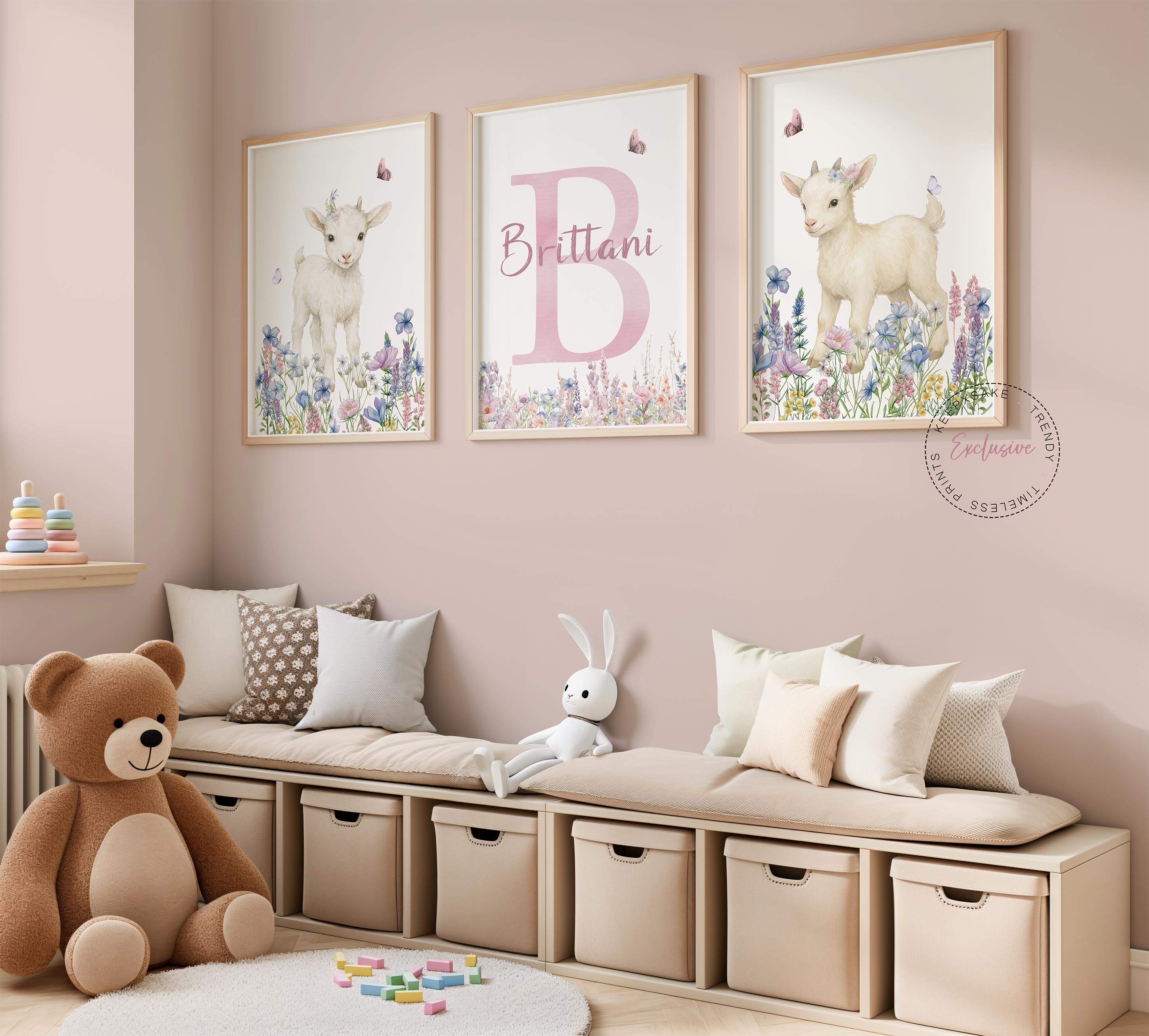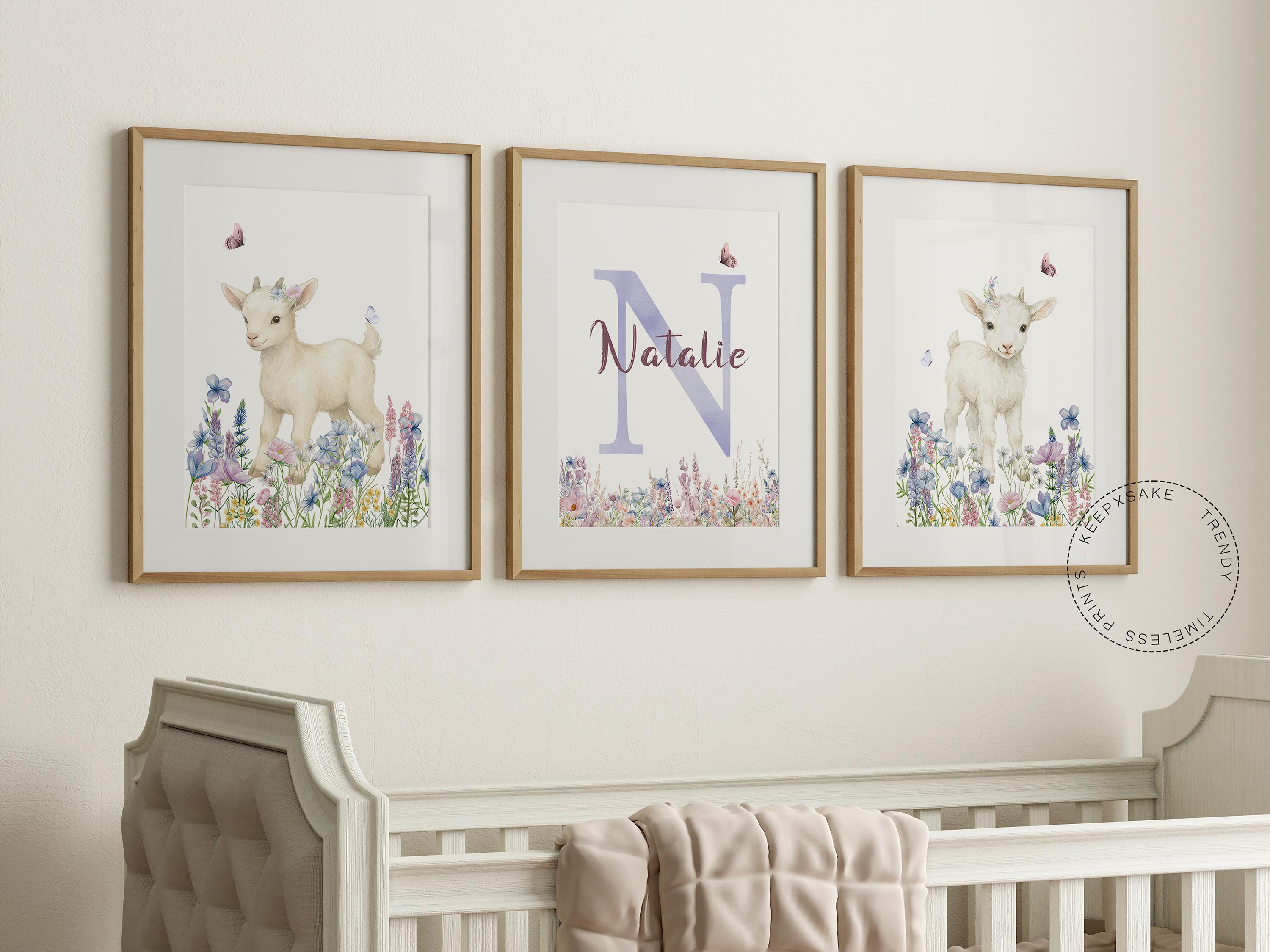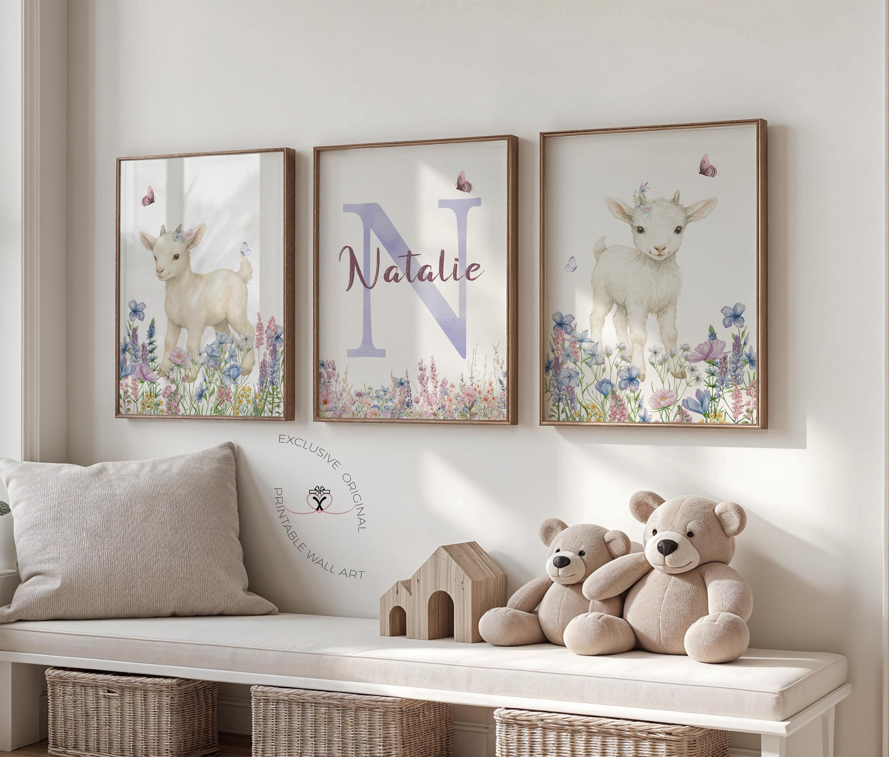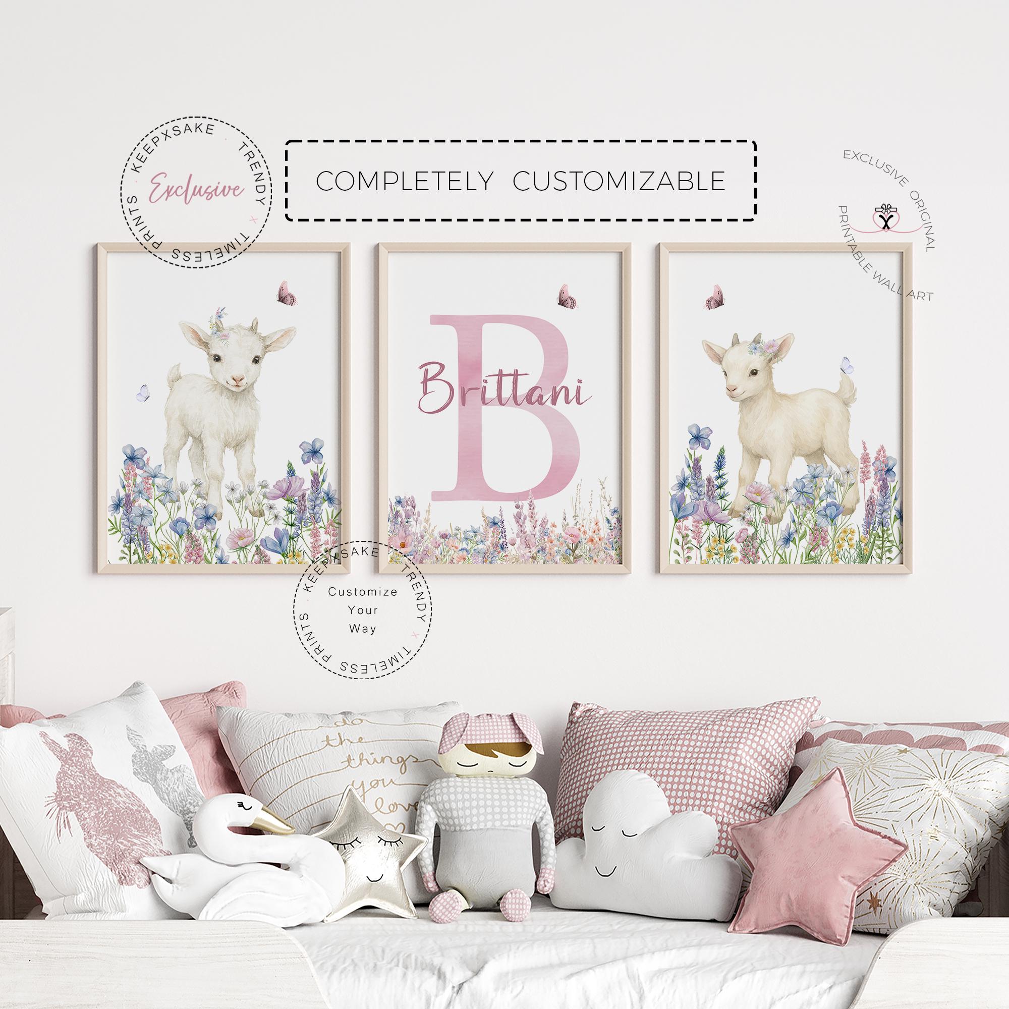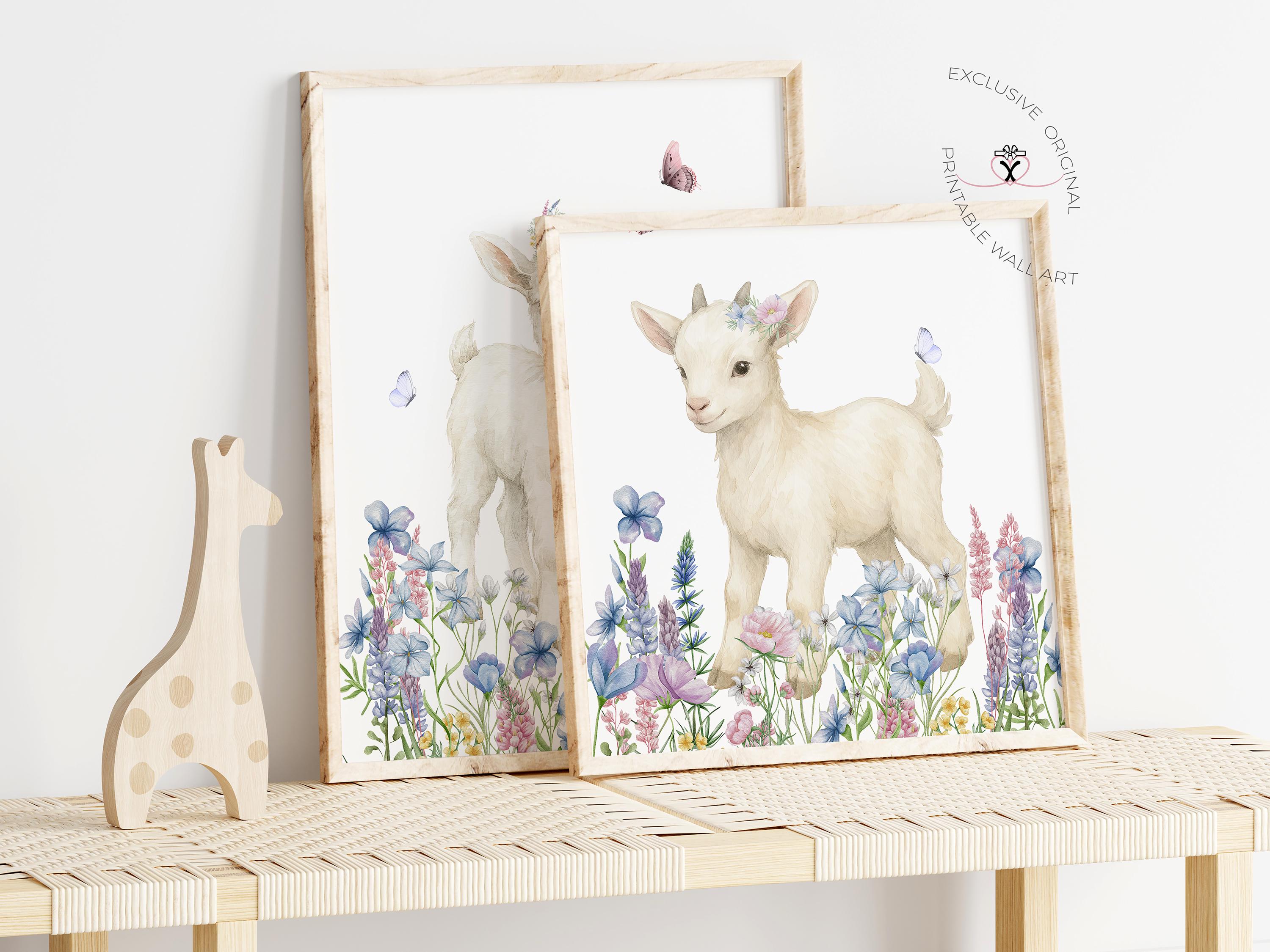 Bring a touch of soft country charm to your little one’s room with this adorable baby goat wall art set, surrounded by delicate wildflowers and butterflies. Perfect for a nursery, playroom, or baby shower gift, each print is lovingly designed to feel timeless, sweet, and completely personal to your child.