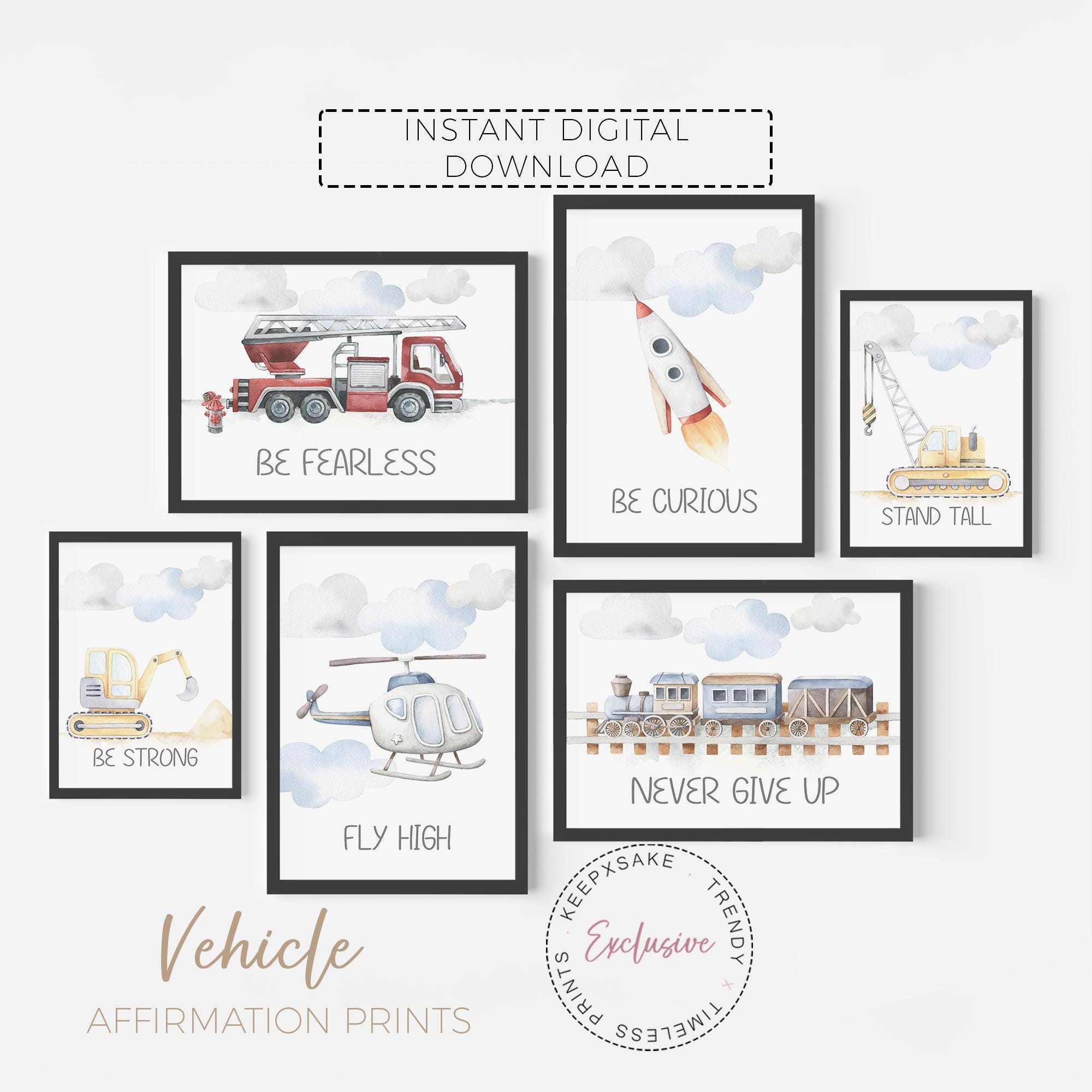 This adorable Vehicle Affirmation Print Set inspires courage, curiosity, and confidence — perfect for nurseries, playrooms, or kids’ bedrooms. Each design features a watercolor vehicle paired with a positive message to remind your little one to dream big every day.