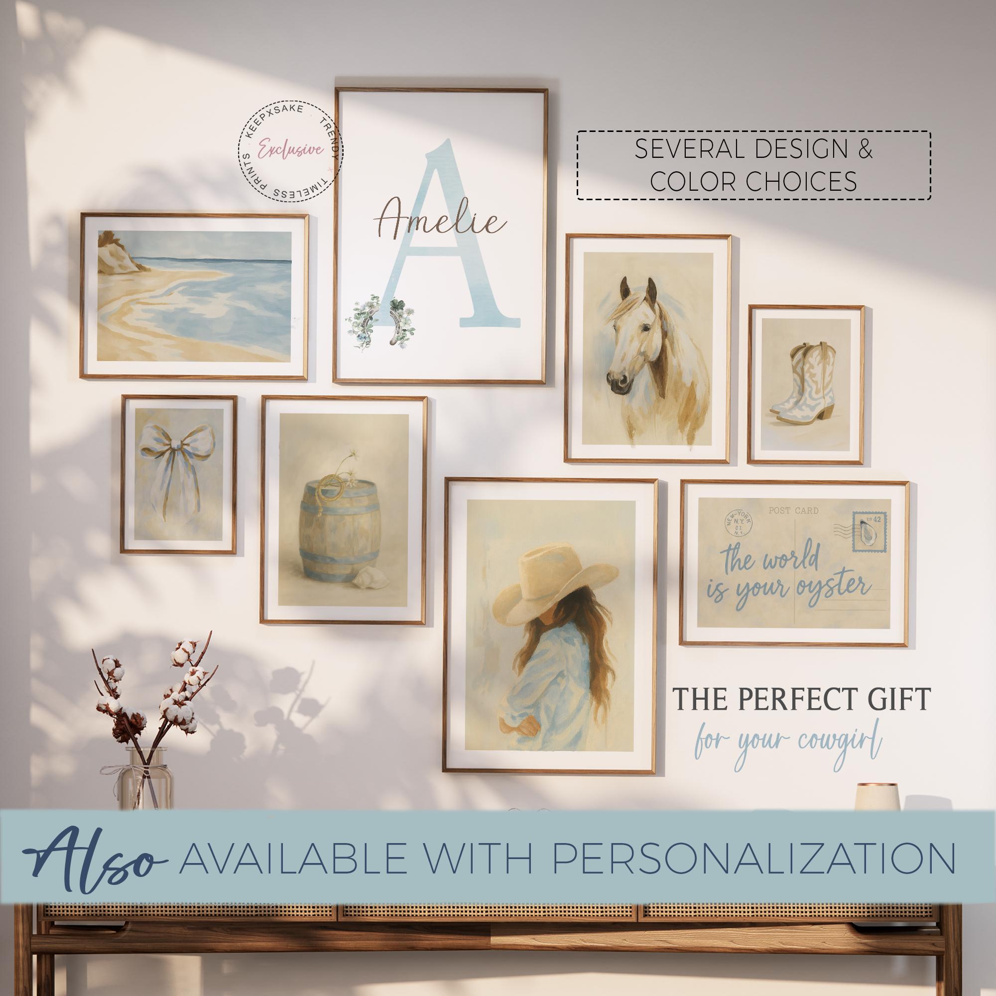 Bring warmth, wanderlust, and a touch of soft western charm into your home with this Coastal Cowgirl Gallery Wall Set — a curated collection of seven painterly digital prints featuring a cowgirl, horse, beach landscape, boots, barrel, bow, and an inspiring “The world is your oyster” quote. Designed in calming beige, ivory, and muted blue tones, this set blends western soul with coastal serenity — perfect for bedrooms, living rooms, and modern boho spaces.