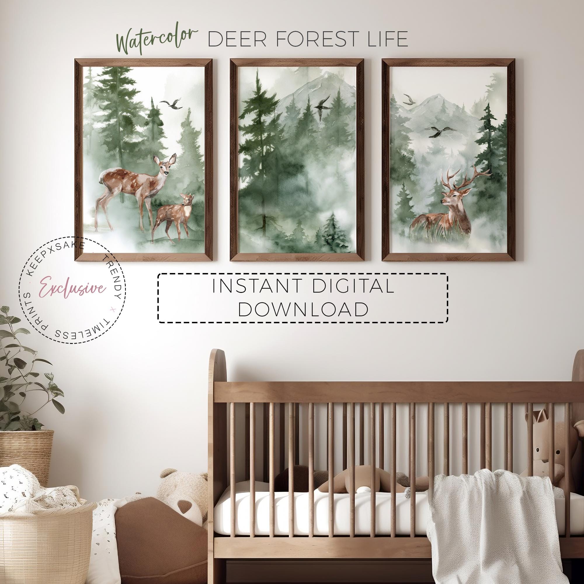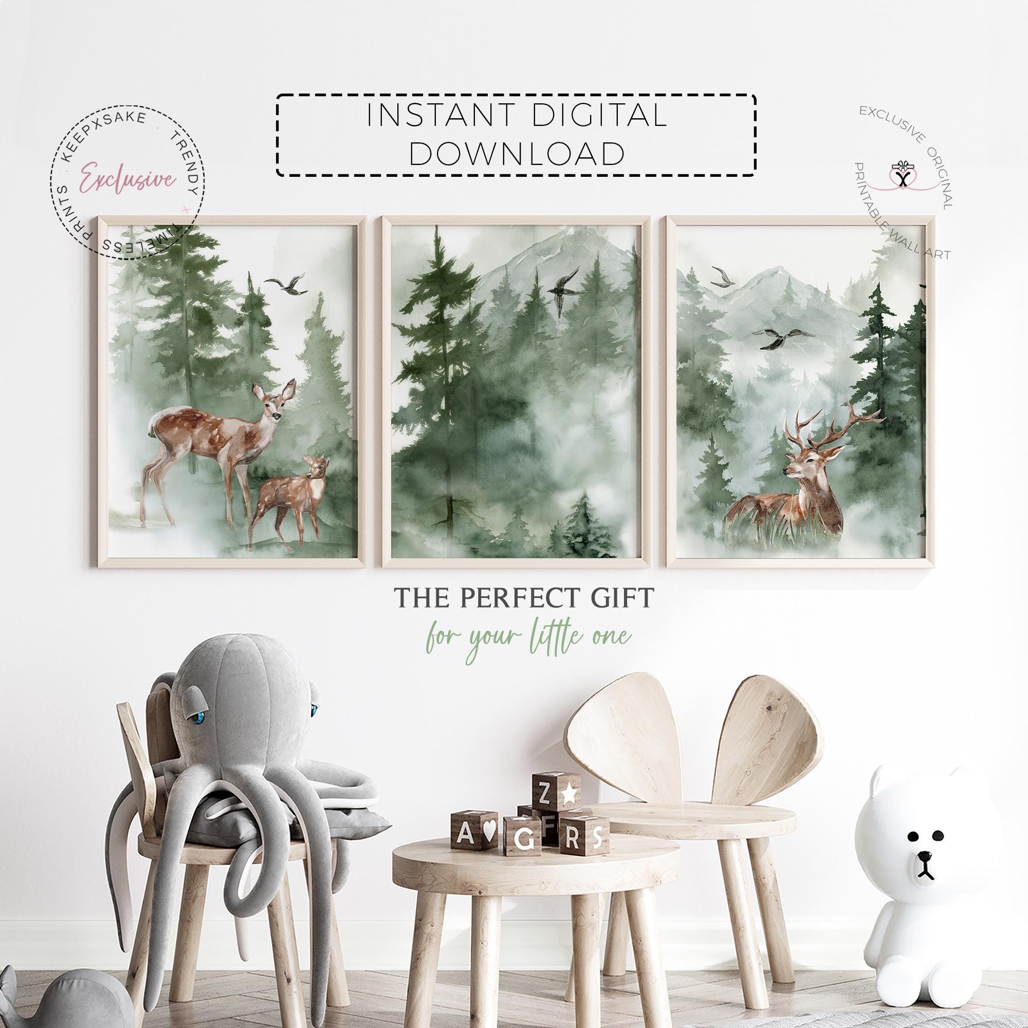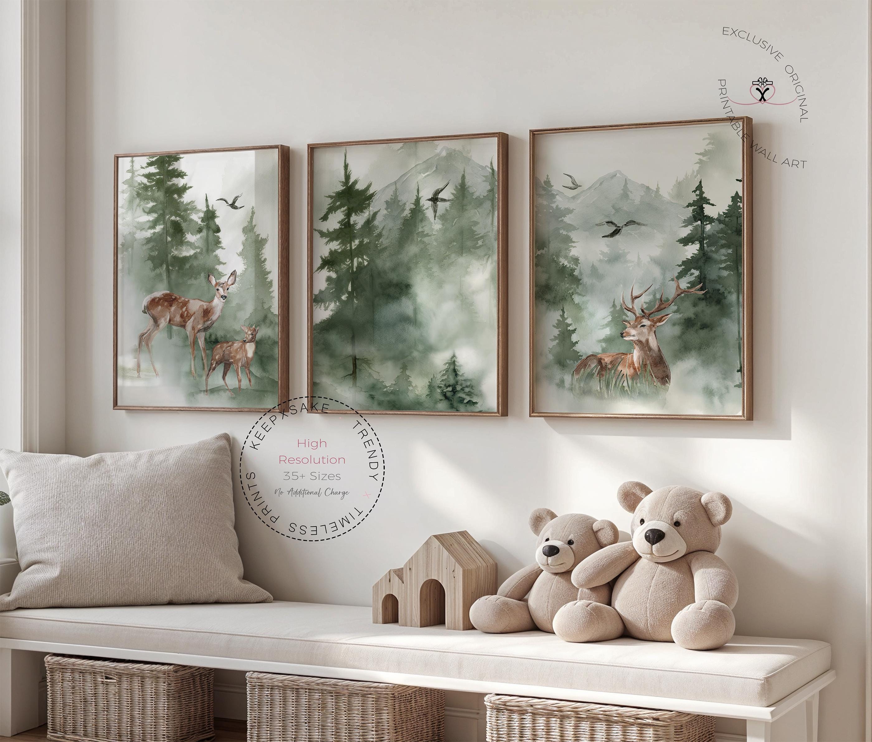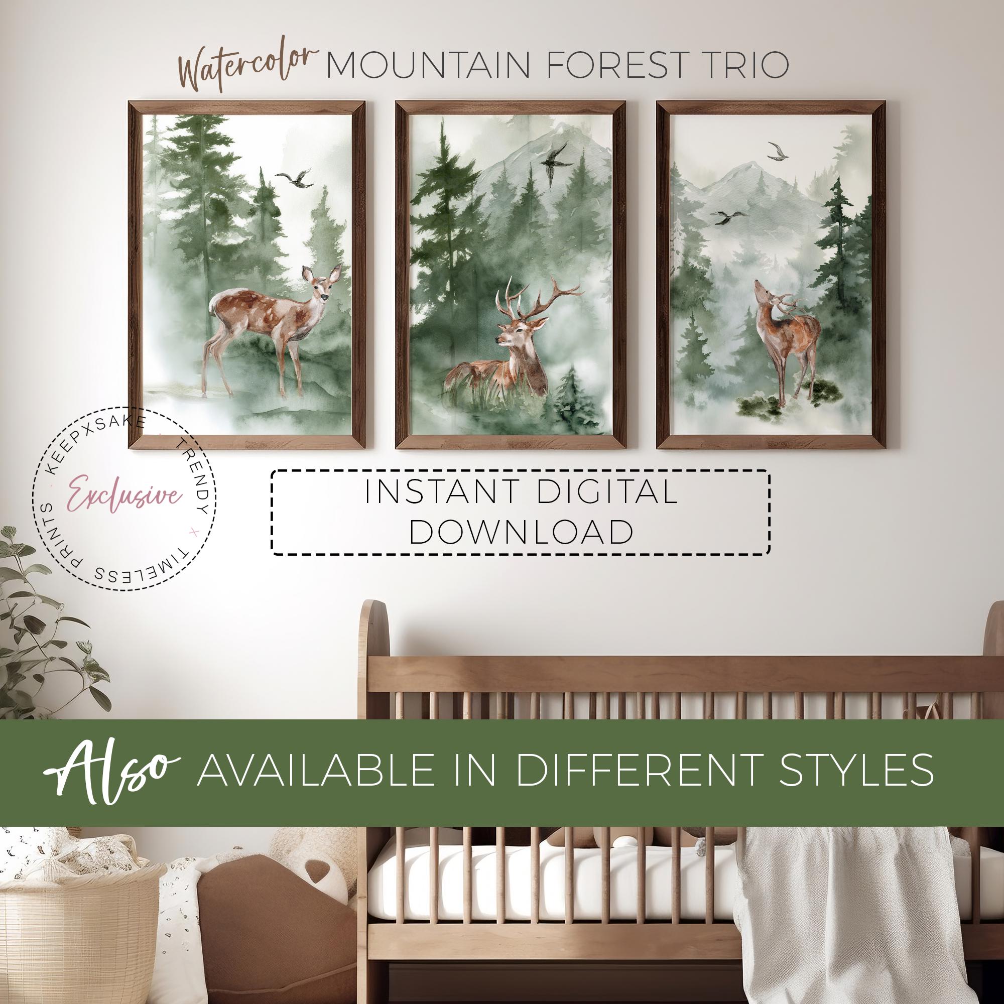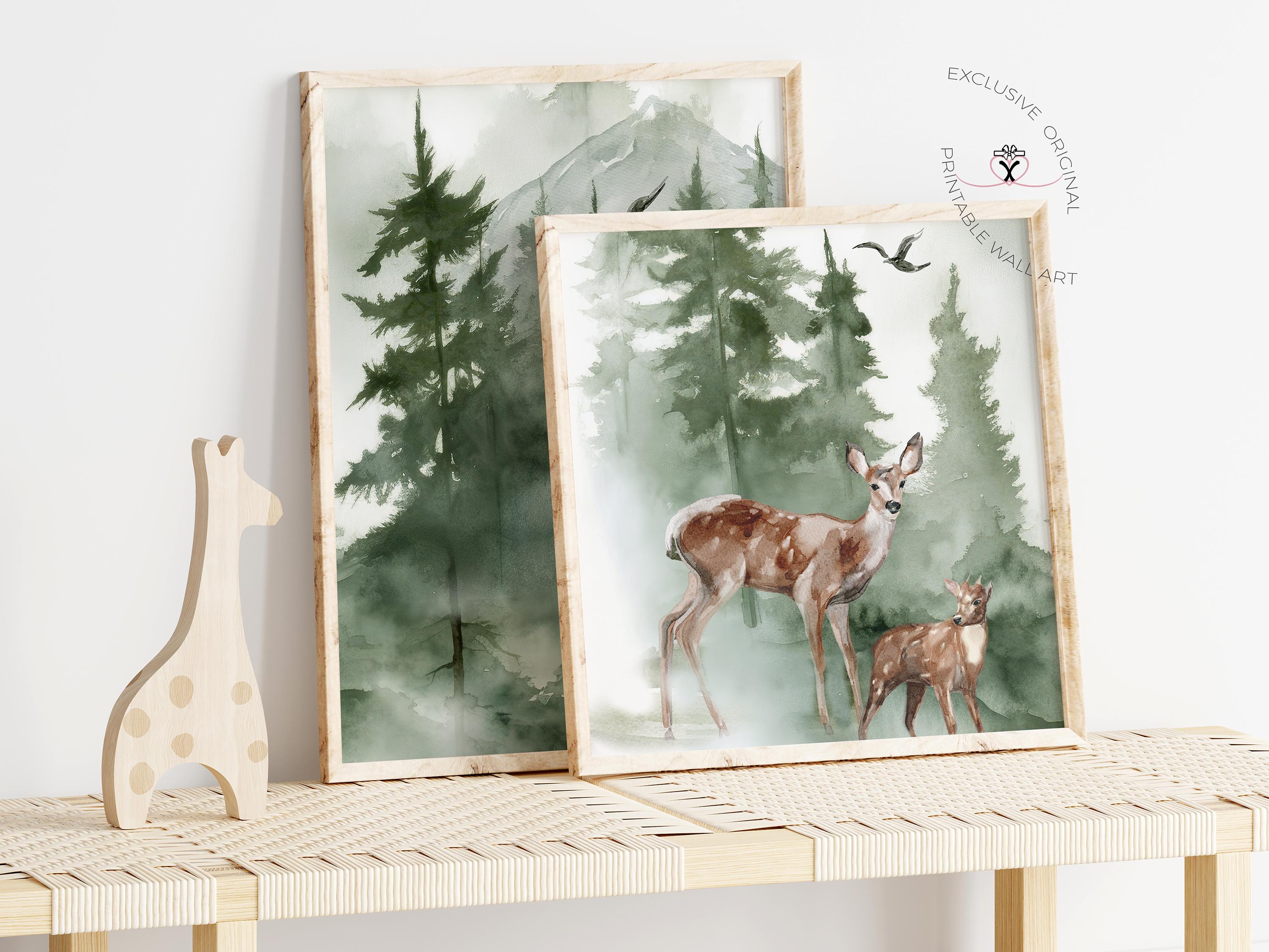Bring the calm of the forest into your nursery with this Woodland Deer Family Wall Art Set — a beautifully illustrated trio of digital prints featuring gentle deer, pine trees, and misty green mountains. Perfect for neutral nurseries, baby shower gifts, or nature-inspired children’s rooms, this collection captures the peaceful beauty of the wilderness in soft, earthy watercolor tones.