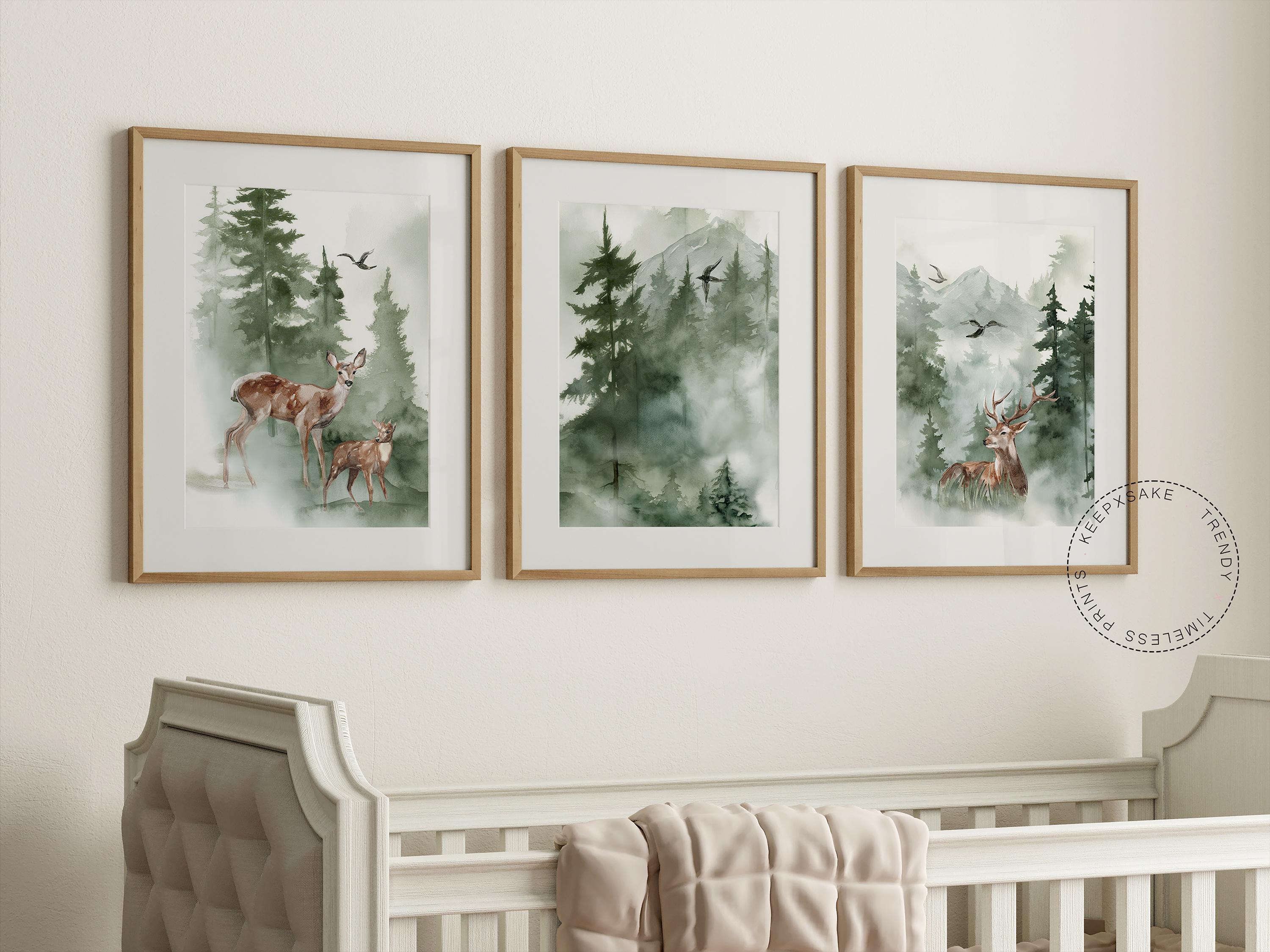 Exclusive Woodland Deer Family Nursery Prints — soft green forest wall art set for baby room or playroom. Neutral digital download.