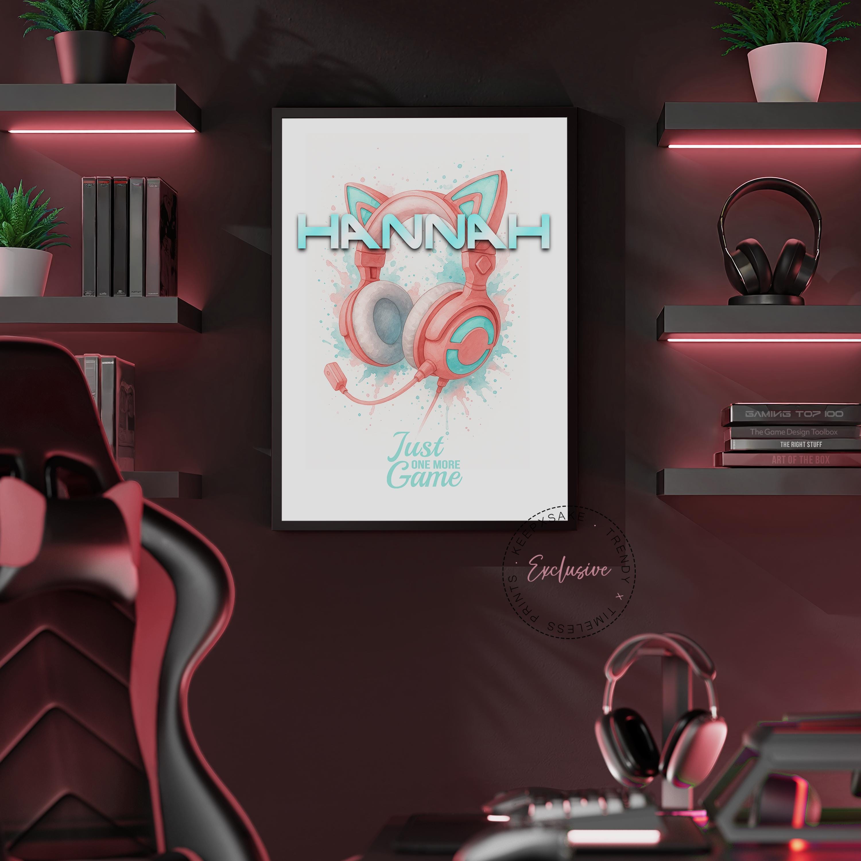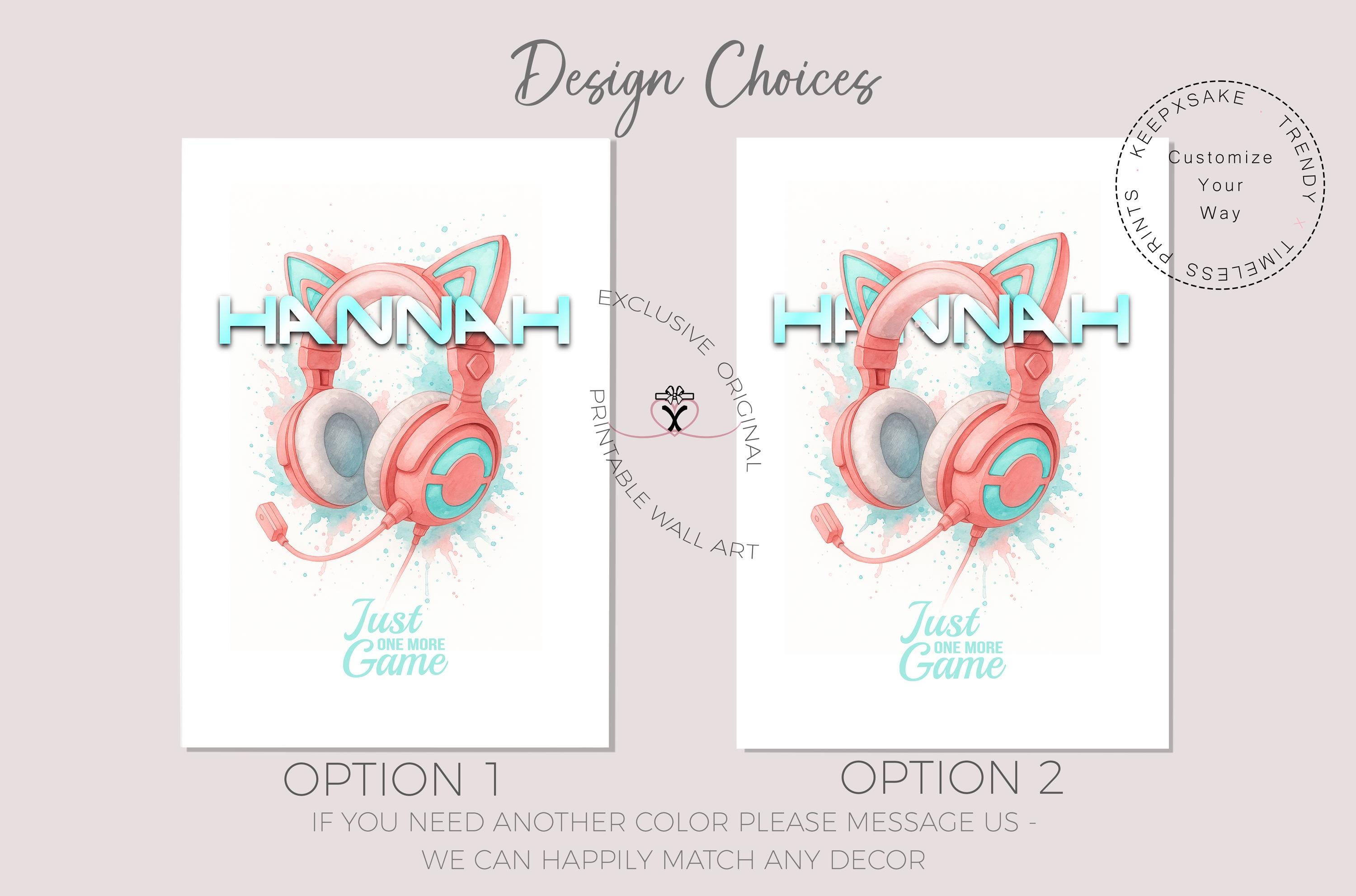 Level up your space with this Personalized Gamer Girl Wall Art — featuring pastel pink cat-ear headphones and the phrase “Just One More Game.” Perfect for gamers of all ages, this custom name print makes an amazing gift for teen girls, gaming setups, or kids’ rooms. Each design combines soft watercolor textures with modern typography for a unique look that’s both playful and stylish.