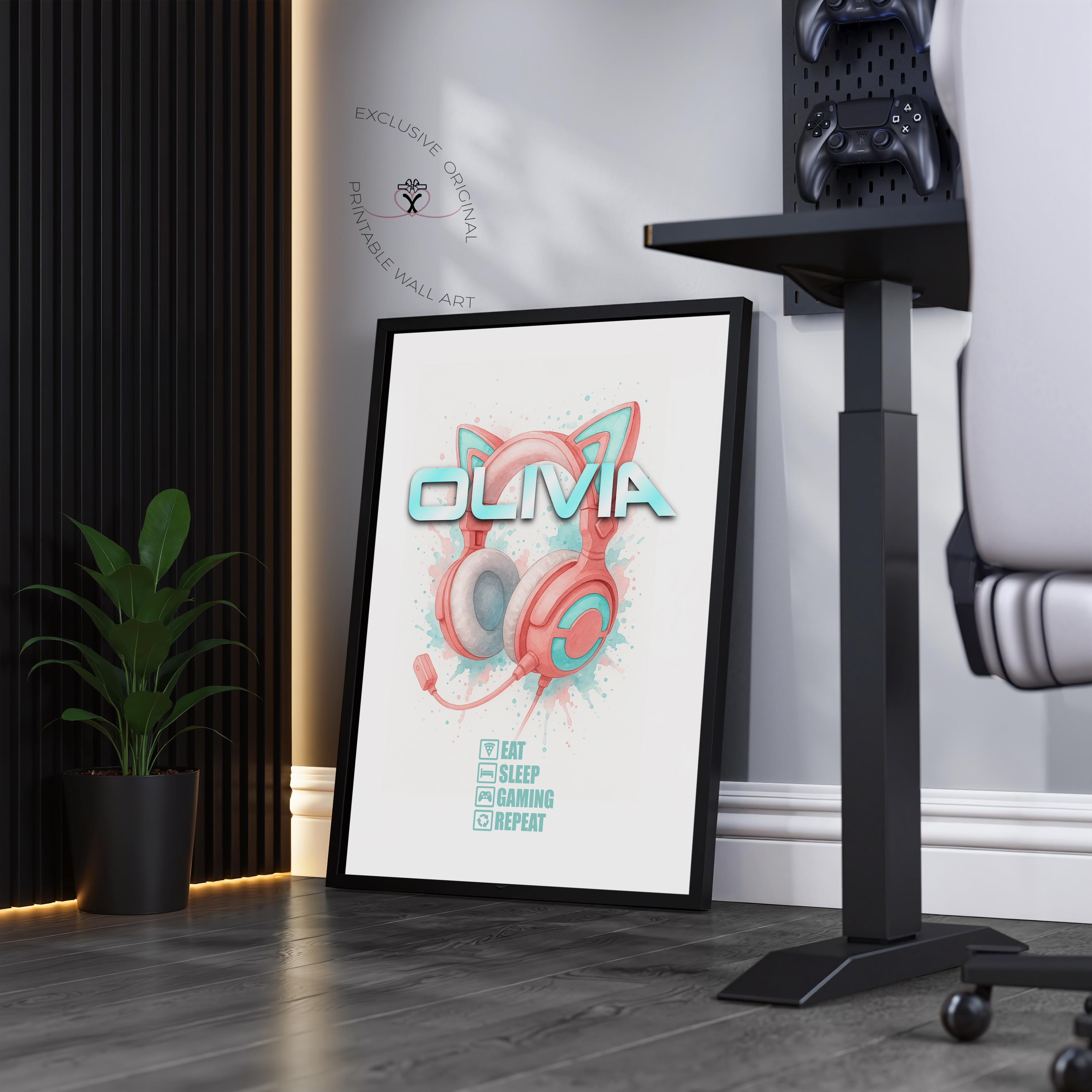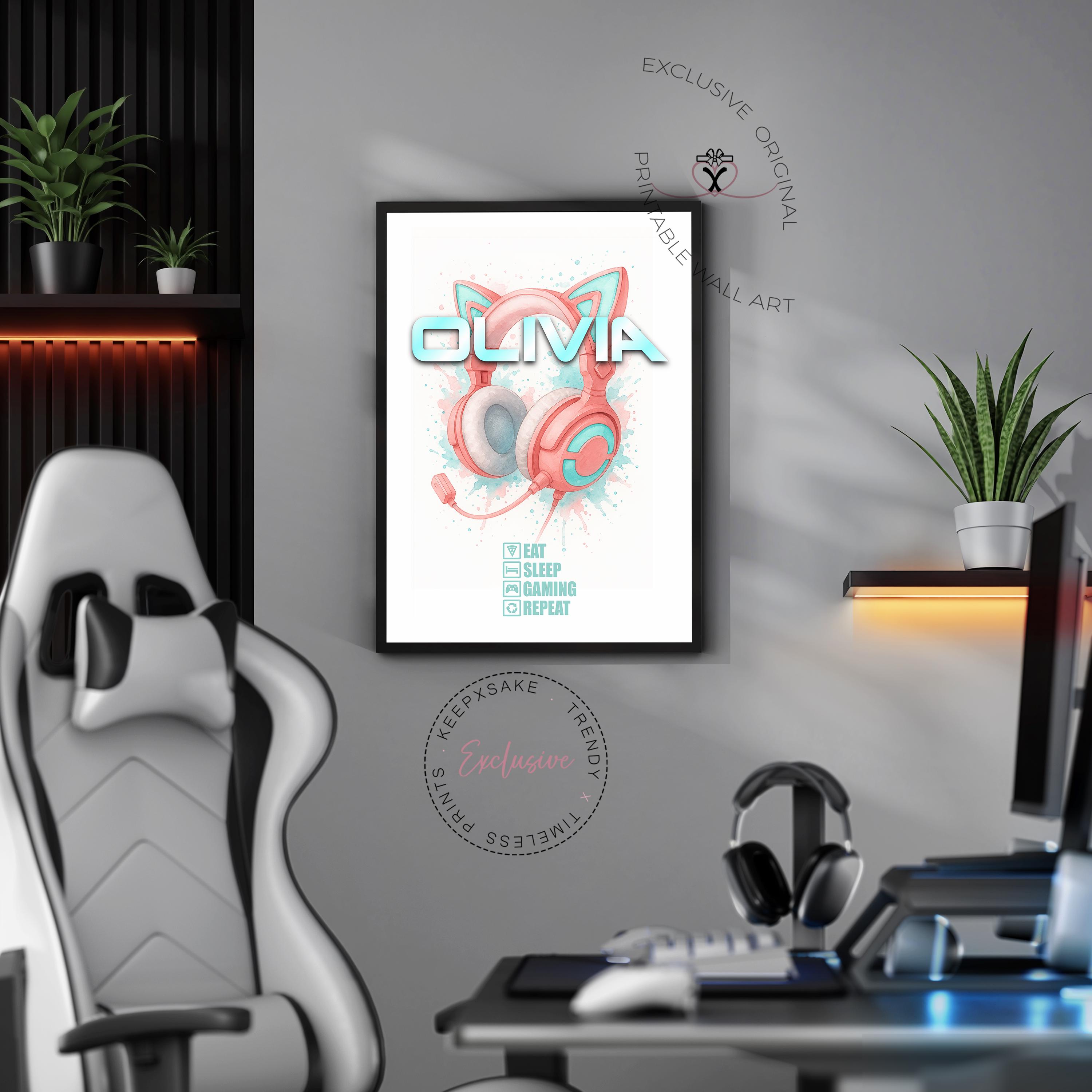 Personalized Gamer Girl Wall Art with cat ear headphones — custom name digital print for gaming rooms or teen girl décor