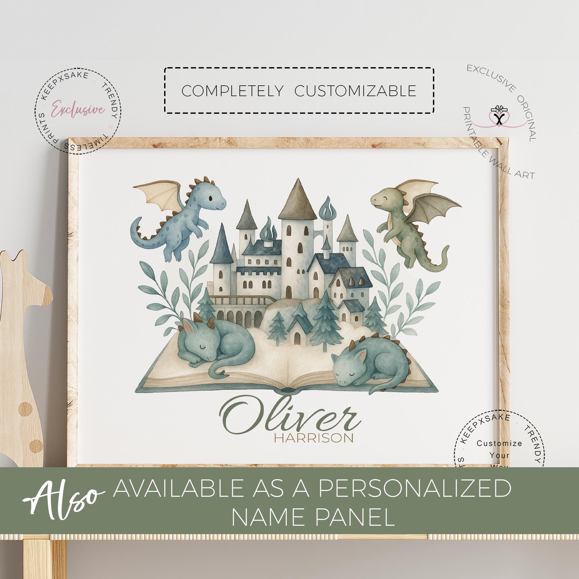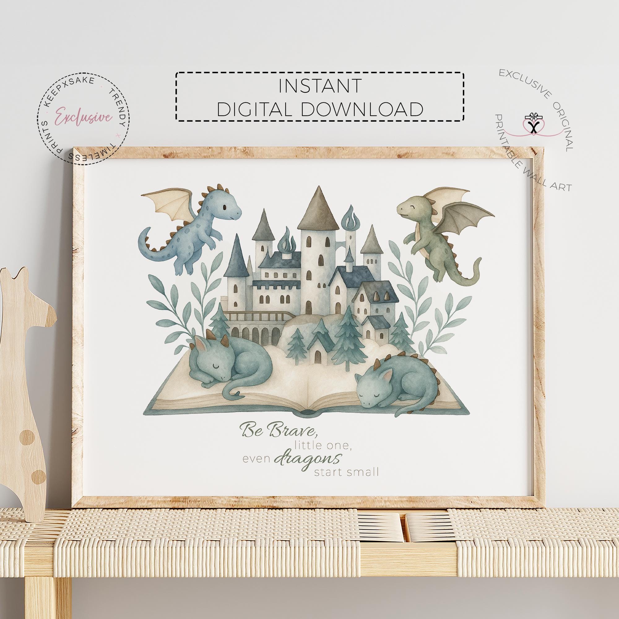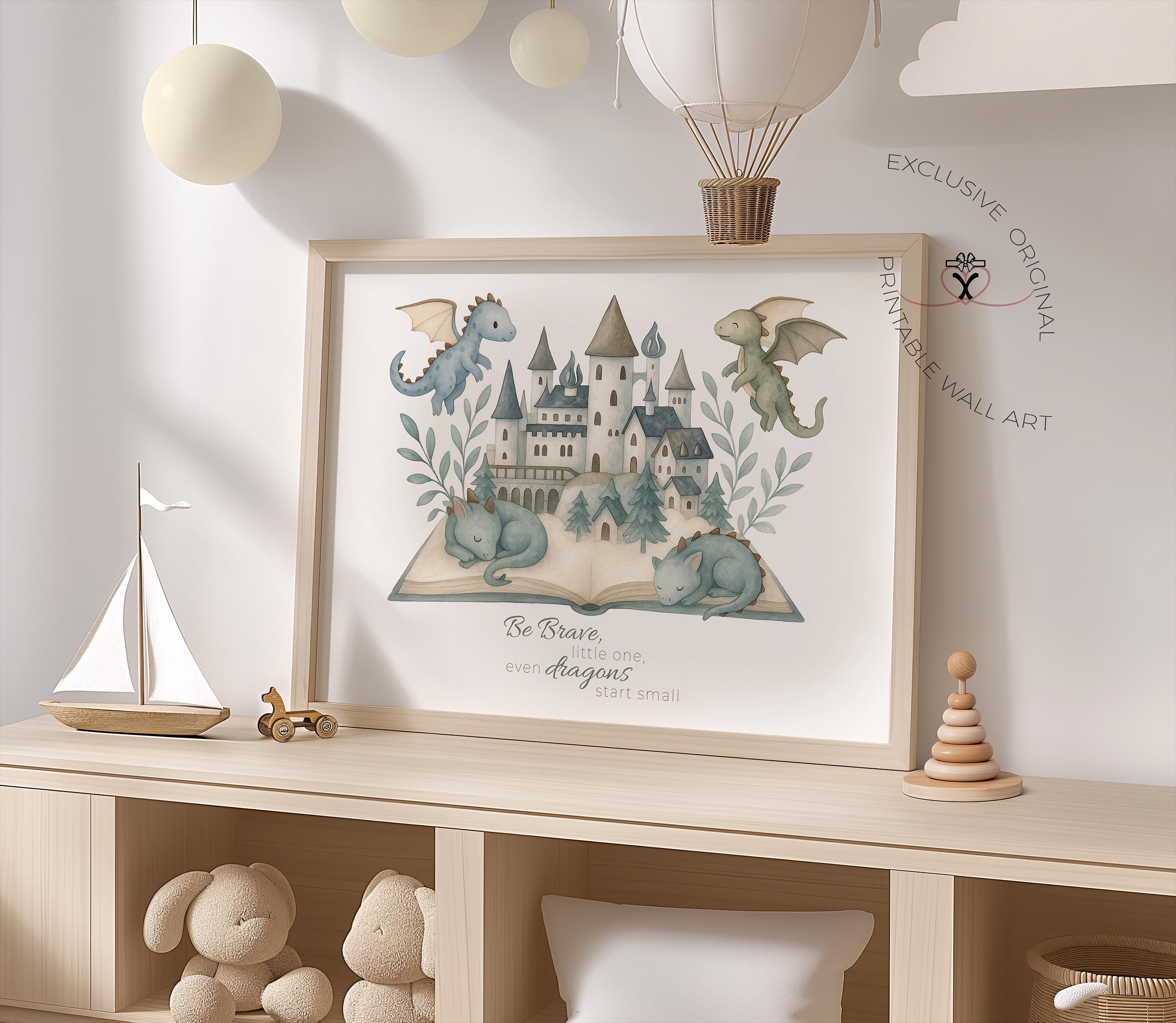 Featuring a watercolor castle surrounded by friendly dragons and the heartwarming quote “Be Brave, little one — even dragons start small,” this piece is perfect for nurseries, kids’ rooms, and storybook-themed spaces. With soft neutral tones of blue, green, and beige, it blends beautifully into both boys’ and girls’ rooms, adding a touch of magic and courage to your little one’s space.