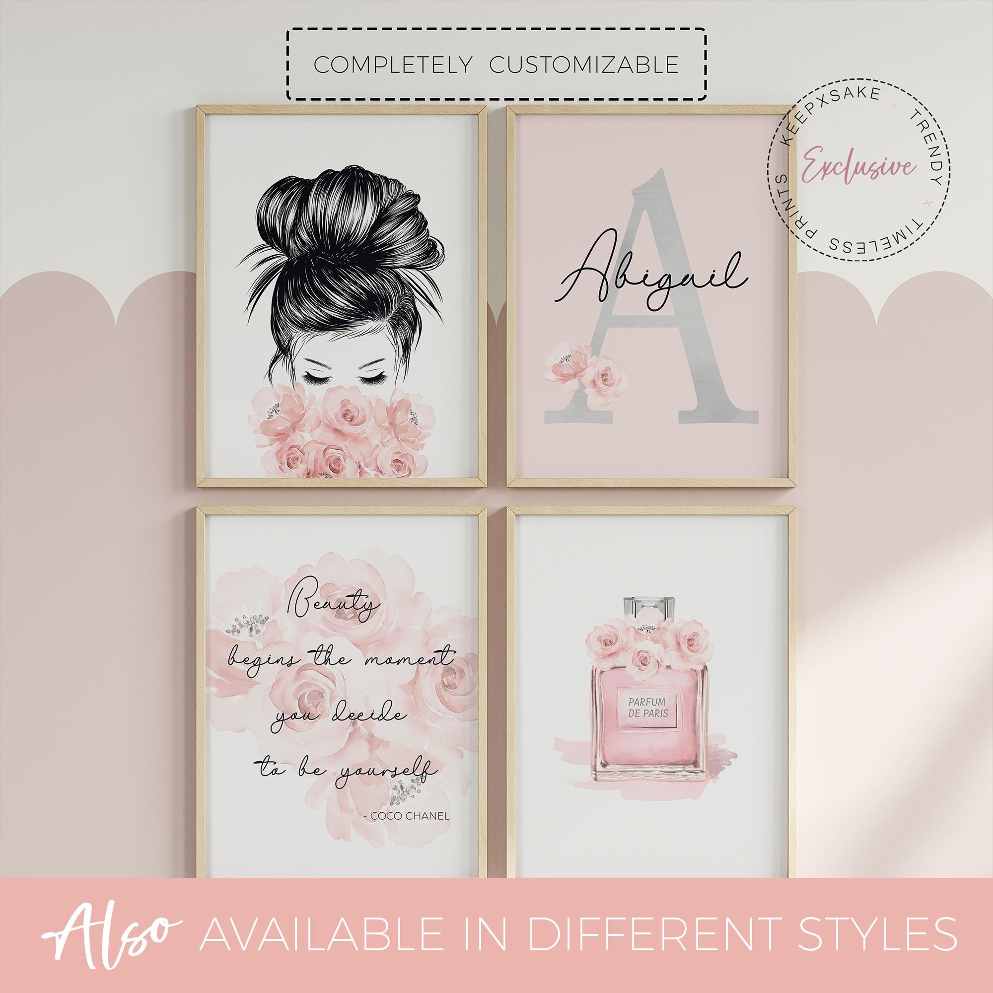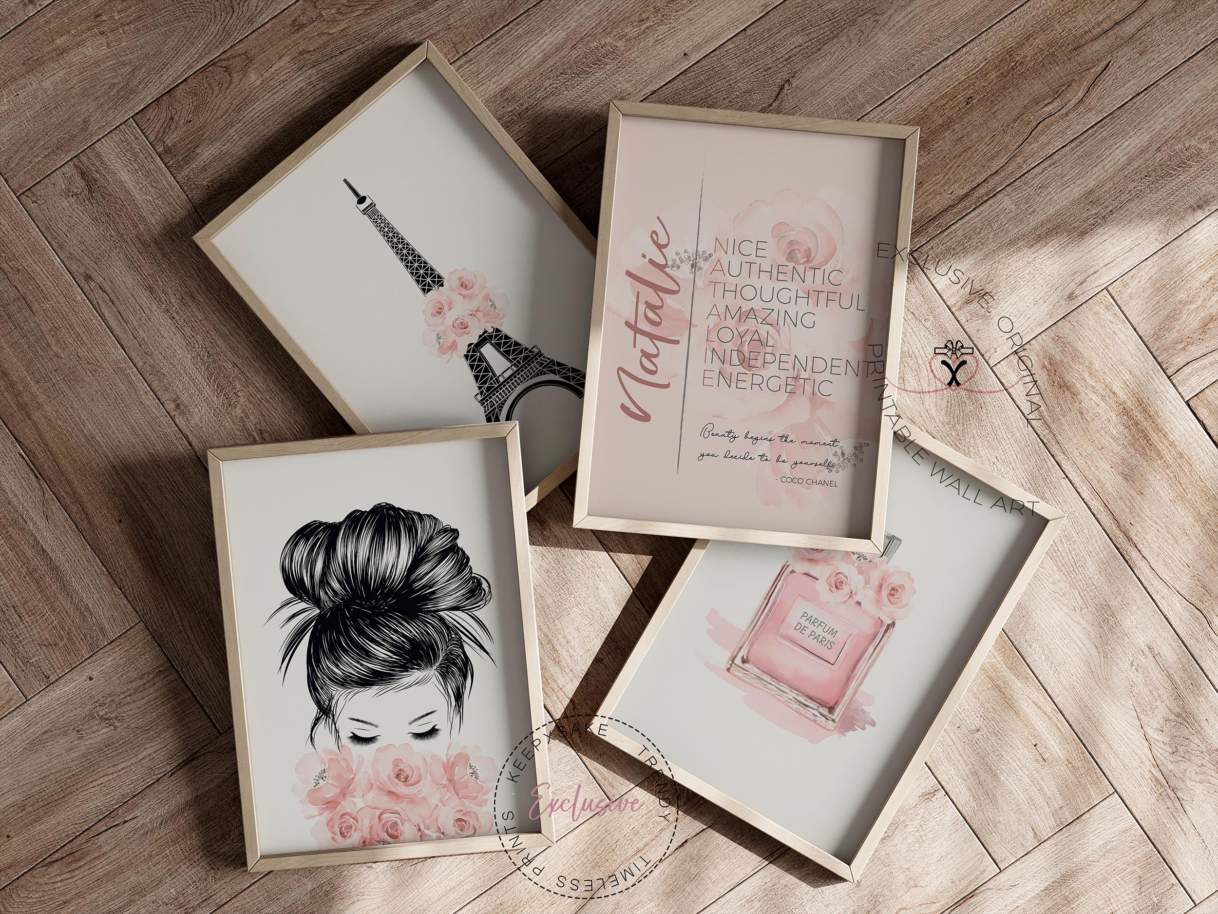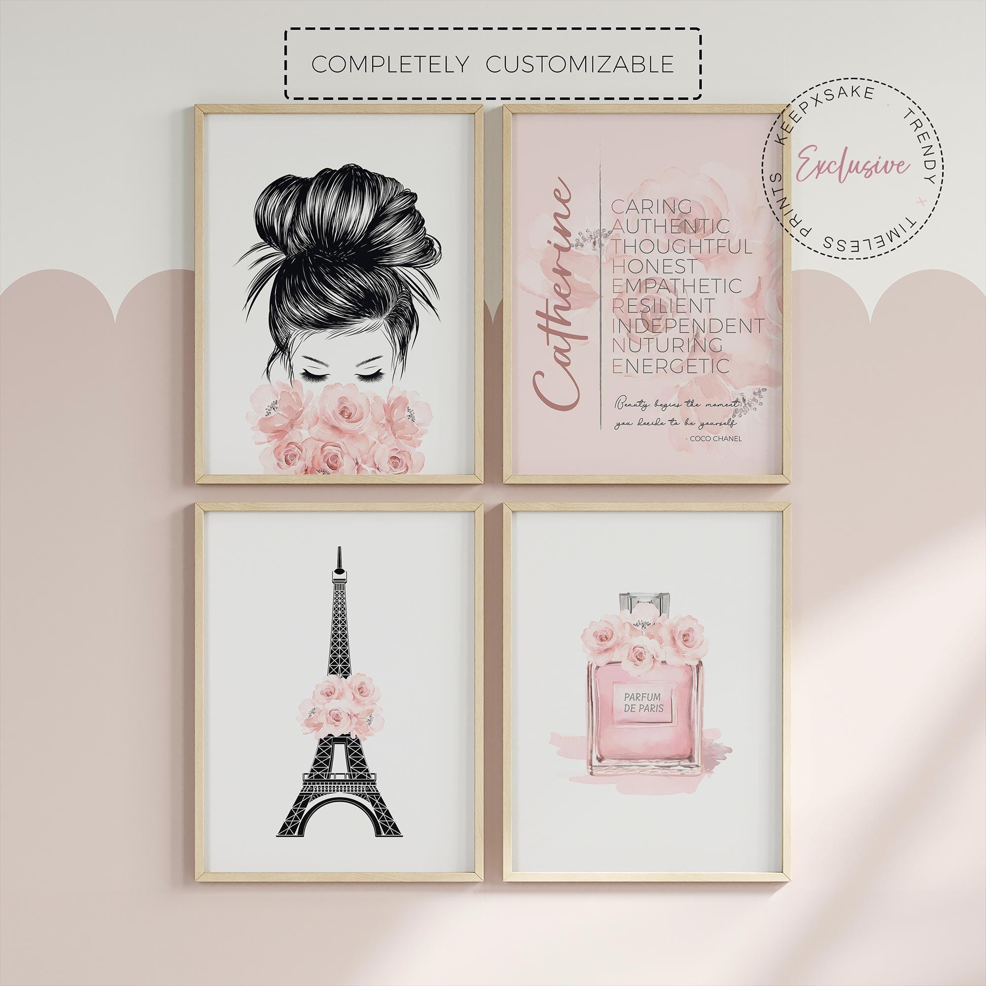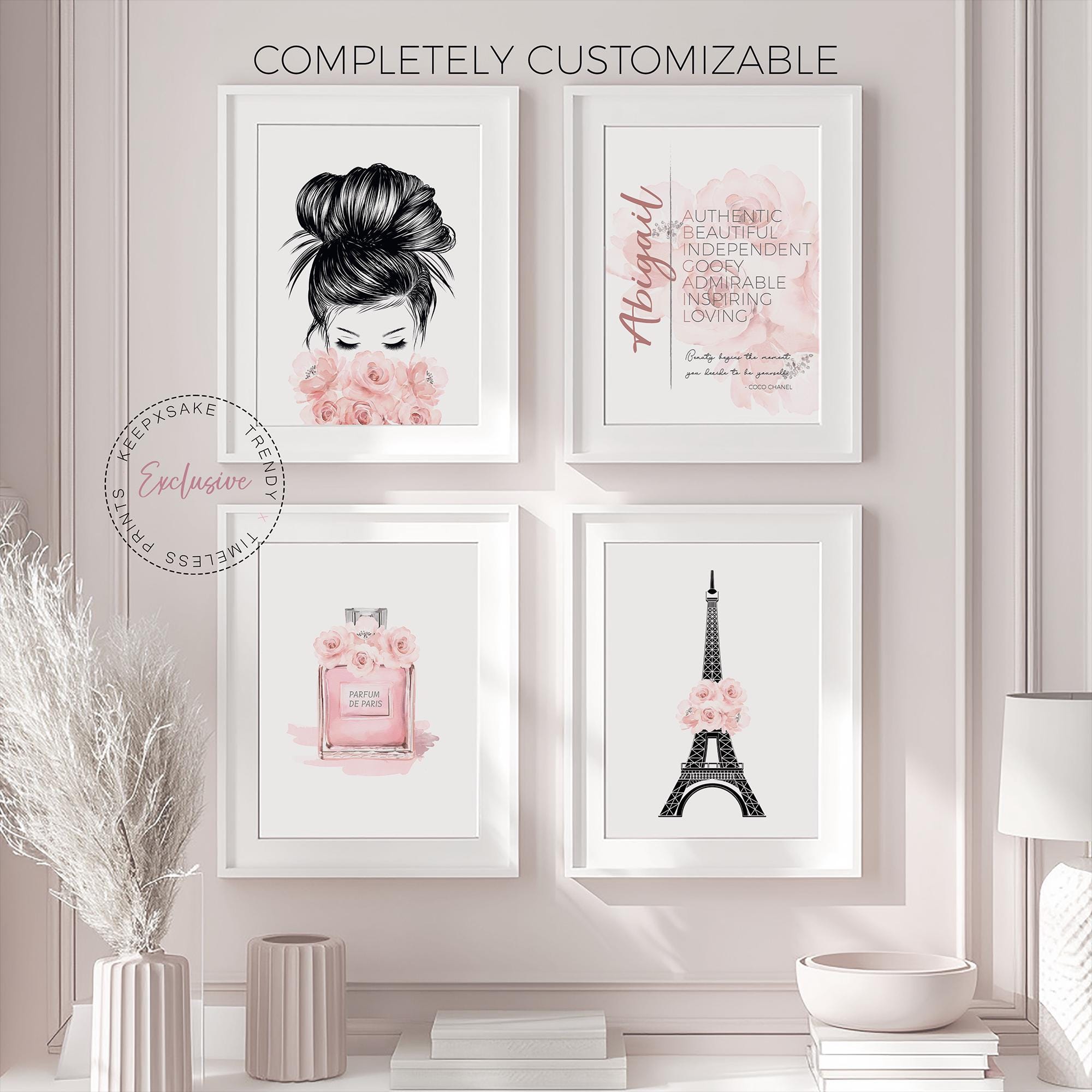 Custom Paris Wall Art Set – blush pink fashion affirmation prints with Eiffel Tower, perfume & floral designs Personalize with any name for elegant decor