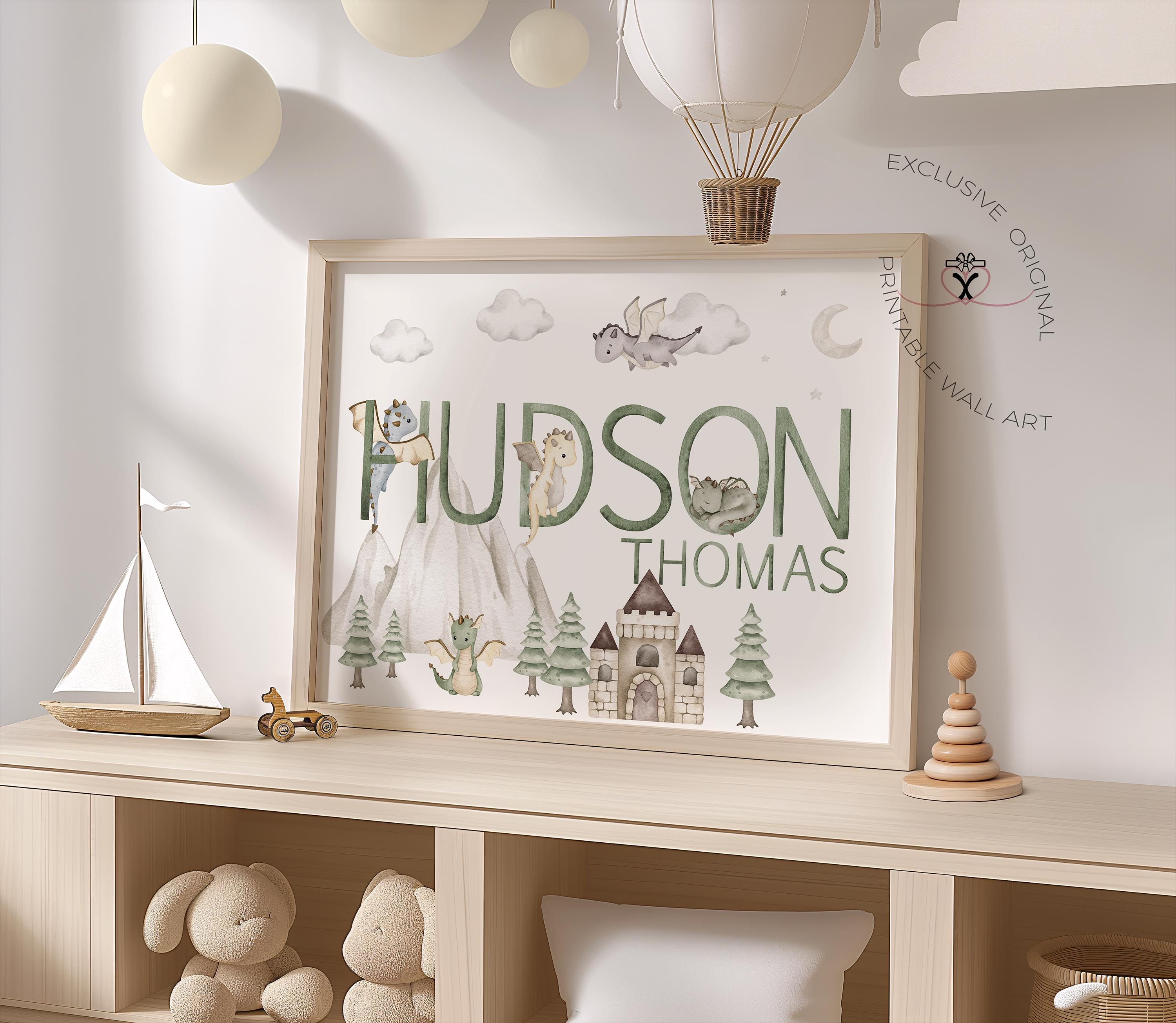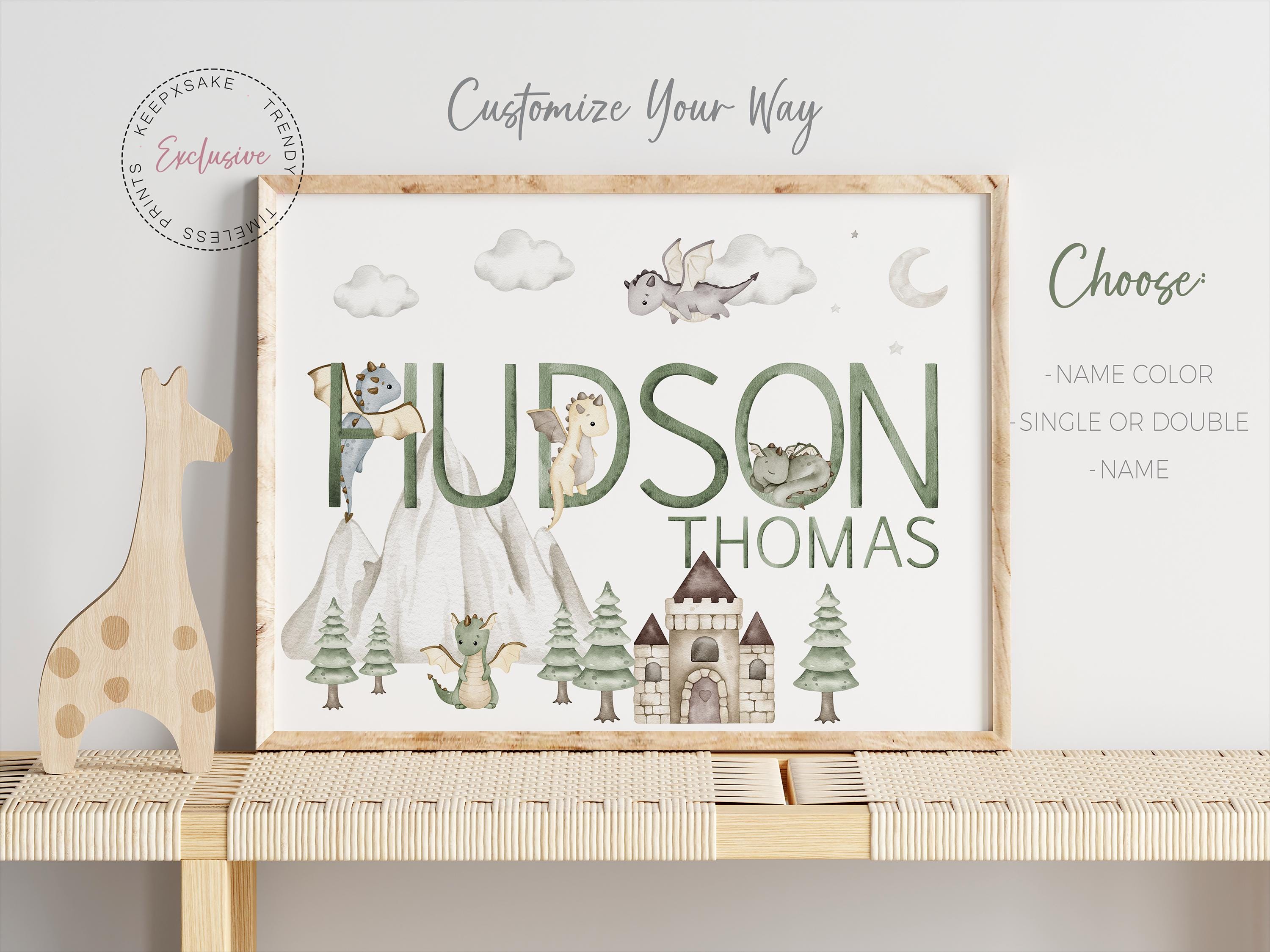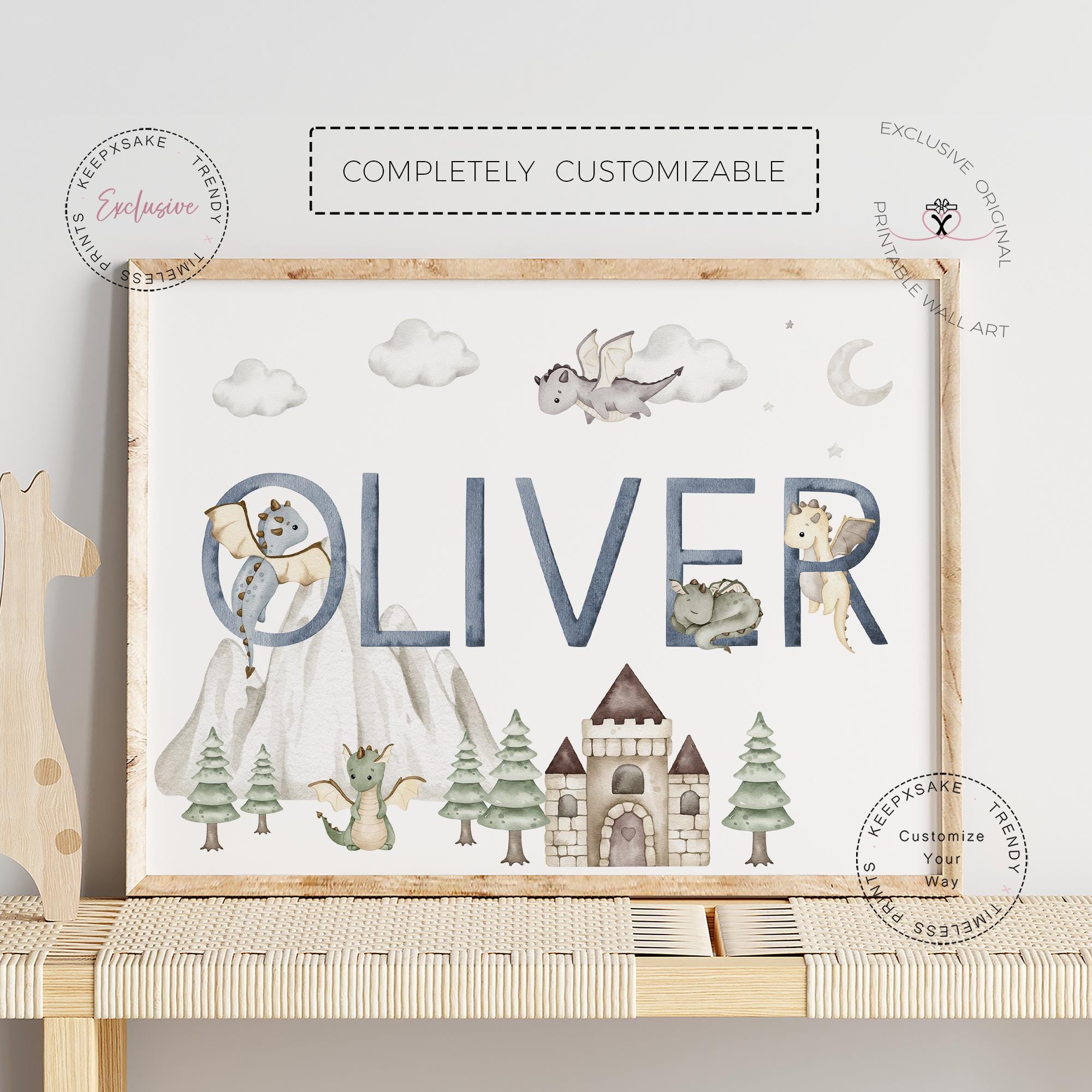 Ignite your little one’s imagination with this Personalized Dragon Castle Name Print, a whimsical addition to any nursery or playroom. Featuring friendly watercolor dragons, a fairytale castle, and dreamy forest mountains, this print turns your child’s name into a magical storybook keepsake. Perfect as a baby shower gift, fantasy-themed nursery centerpiece, or custom kids room wall art, this design brings warmth and wonder to your space.