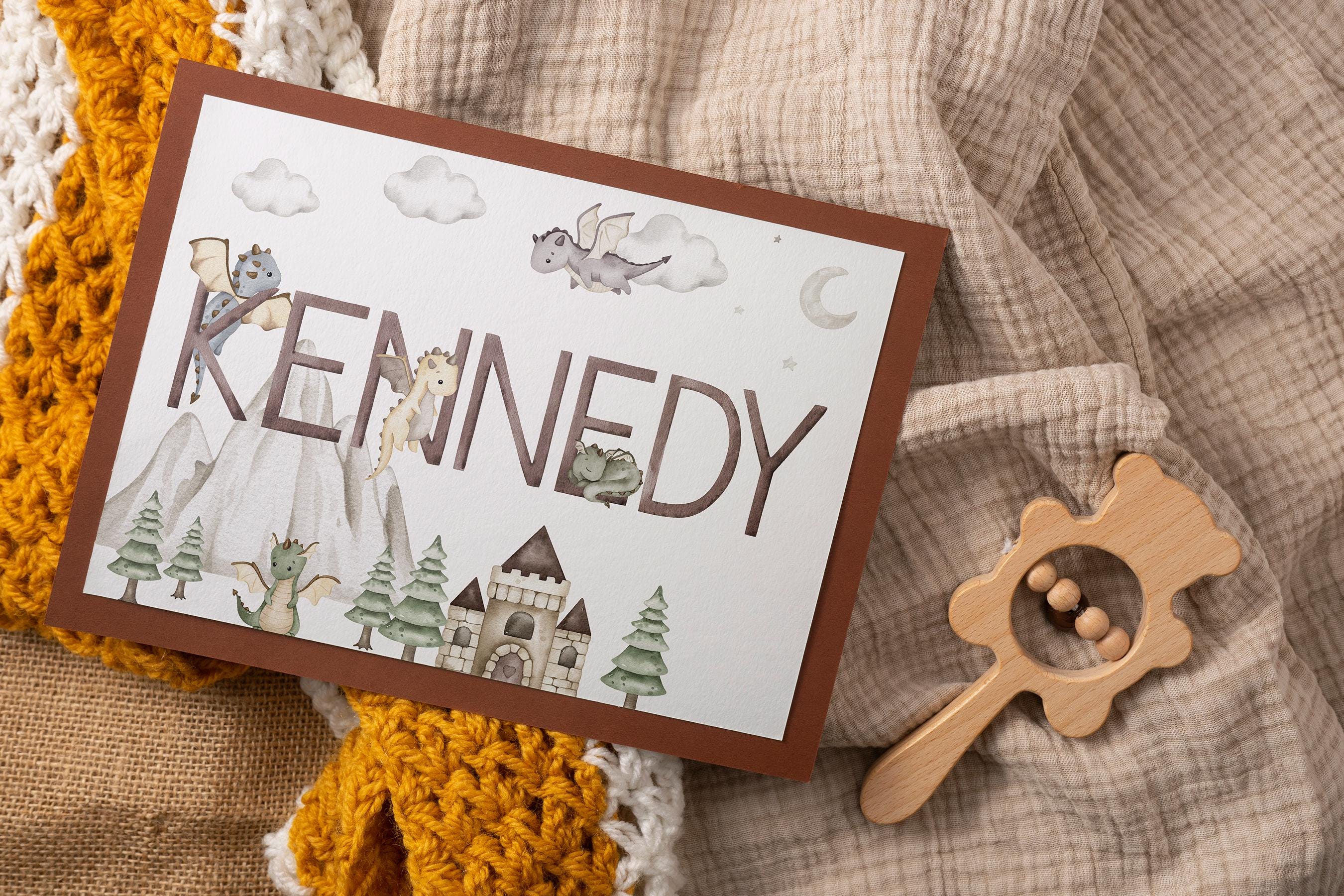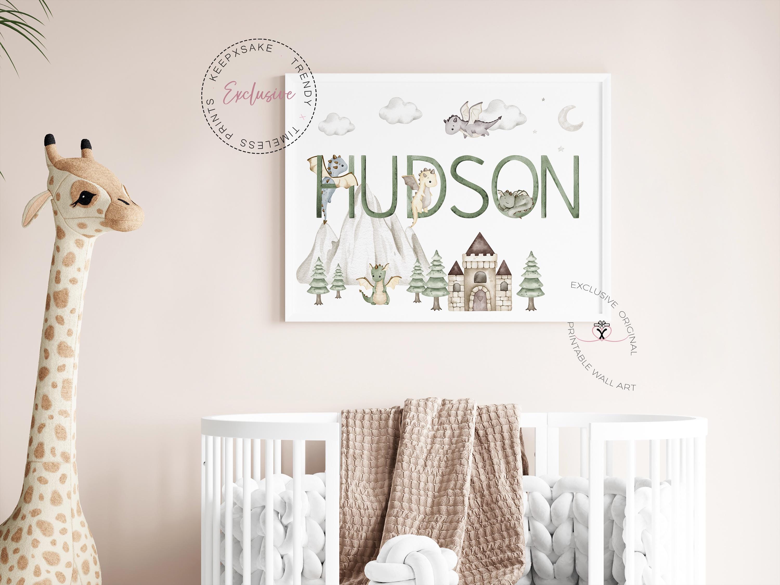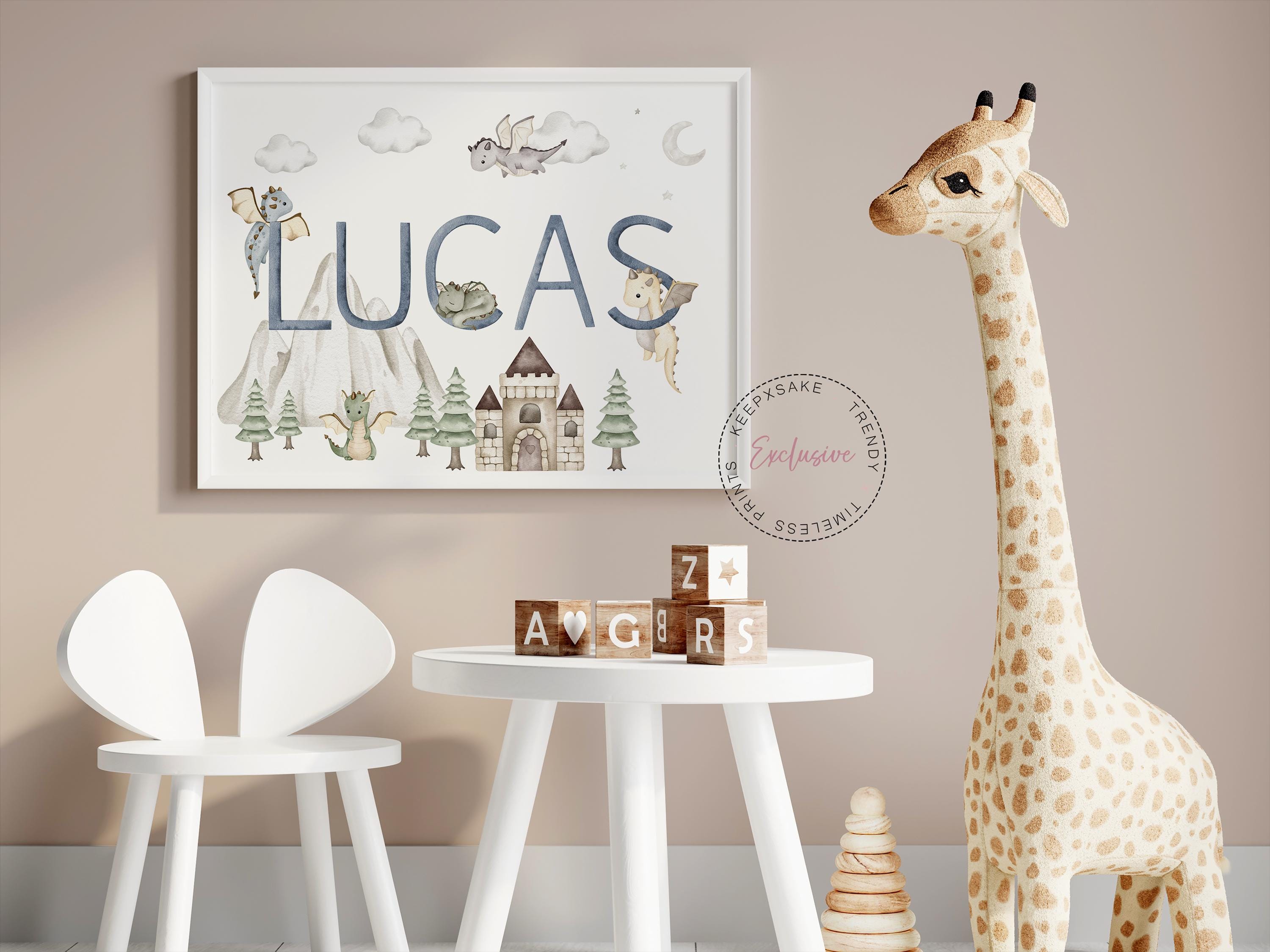 Ignite your little one’s imagination with this Personalized Dragon Castle Name Print, a whimsical addition to any nursery or playroom. Featuring friendly watercolor dragons, a fairytale castle, and dreamy forest mountains, this print turns your child’s name into a magical storybook keepsake. Perfect as a baby shower gift, fantasy-themed nursery centerpiece, or custom kids room wall art, this design brings warmth and wonder to your space.