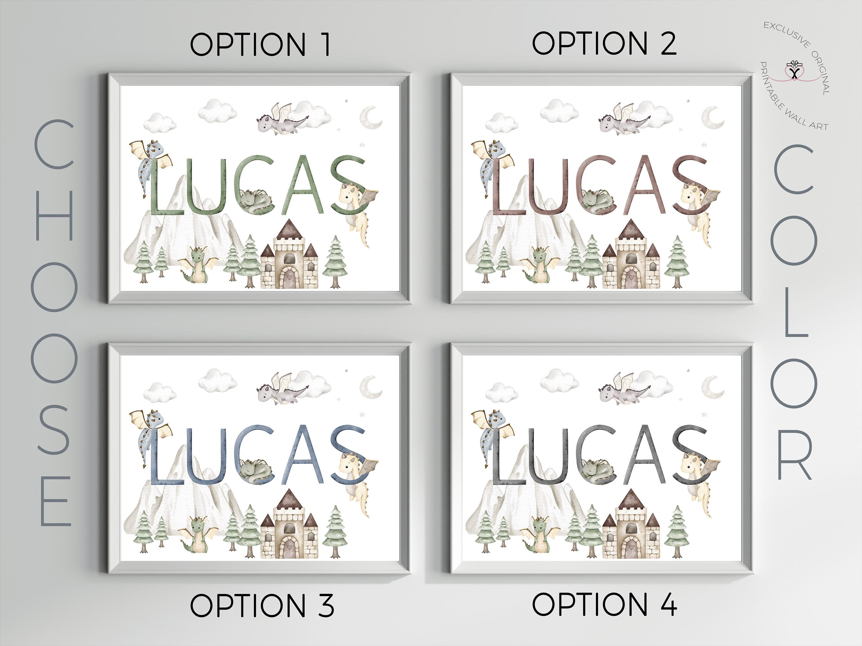 Personalized Dragon Castle Wall Art – watercolor fantasy print with custom name for boys room or nursery. Printable Wall Art Gift