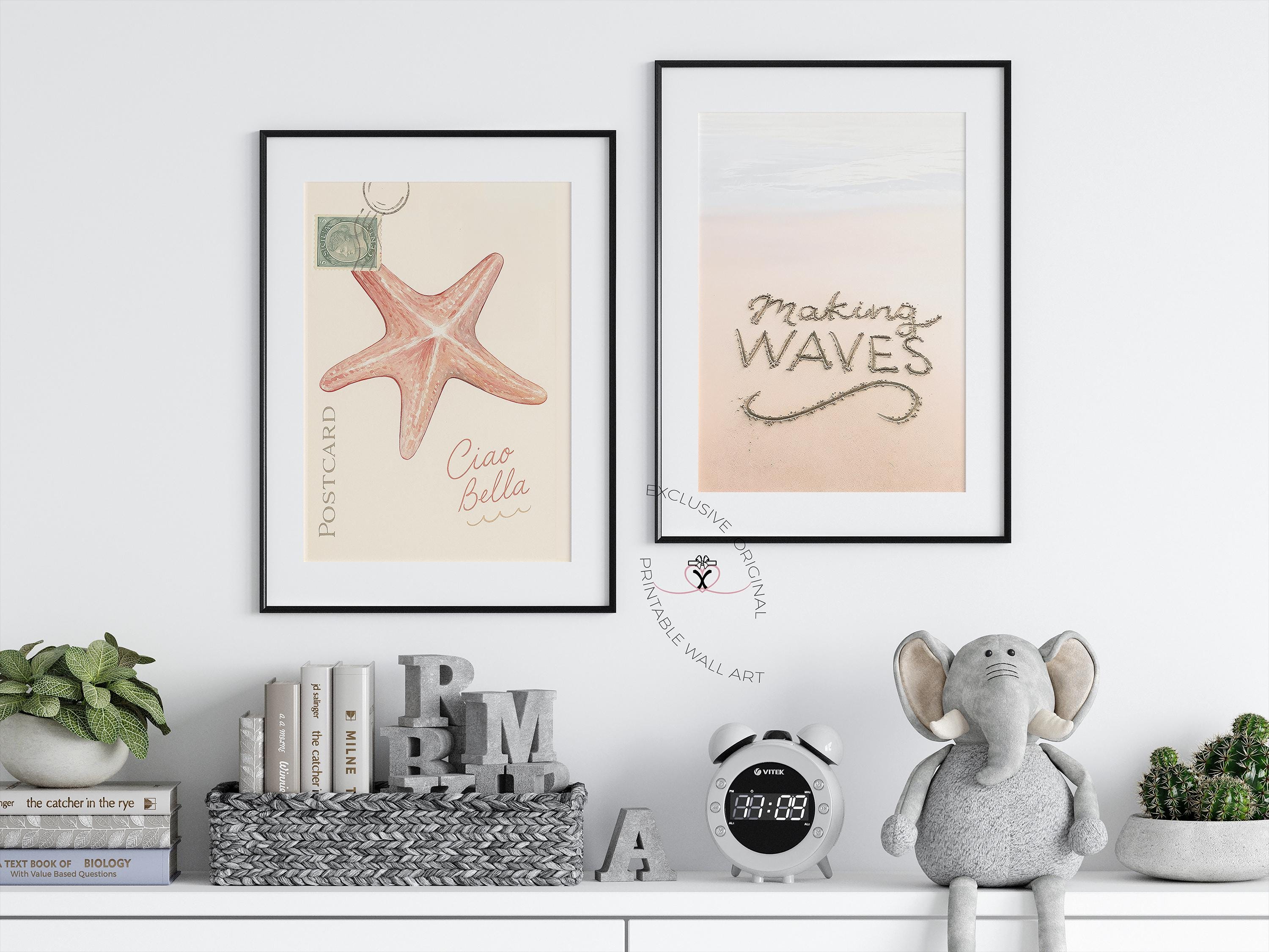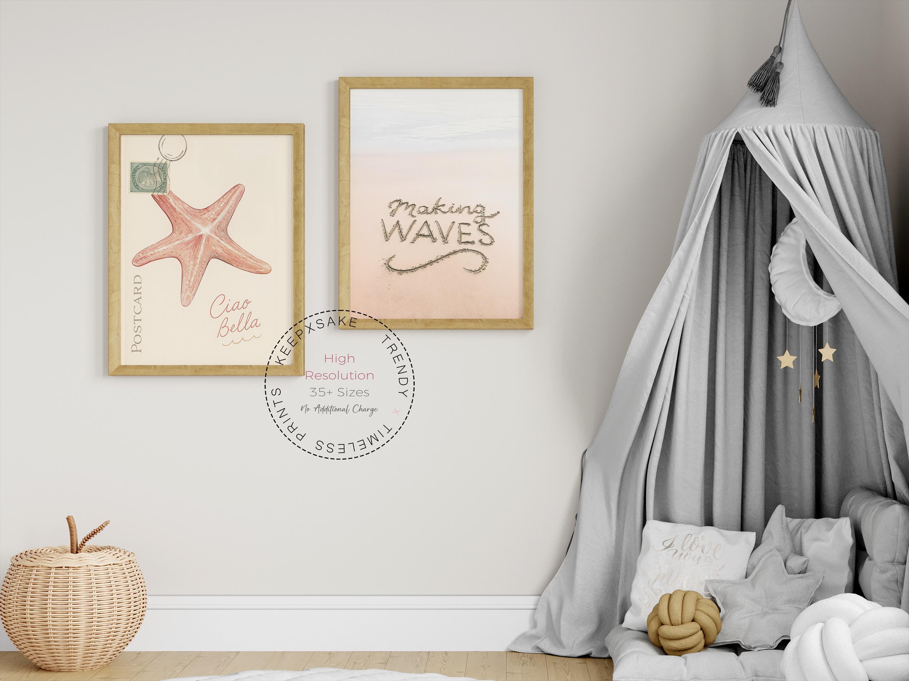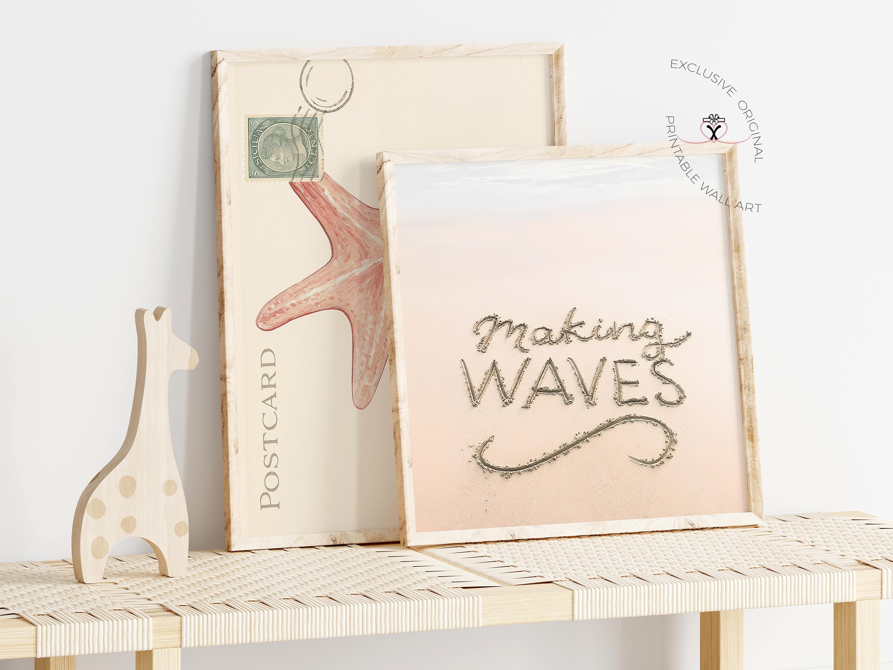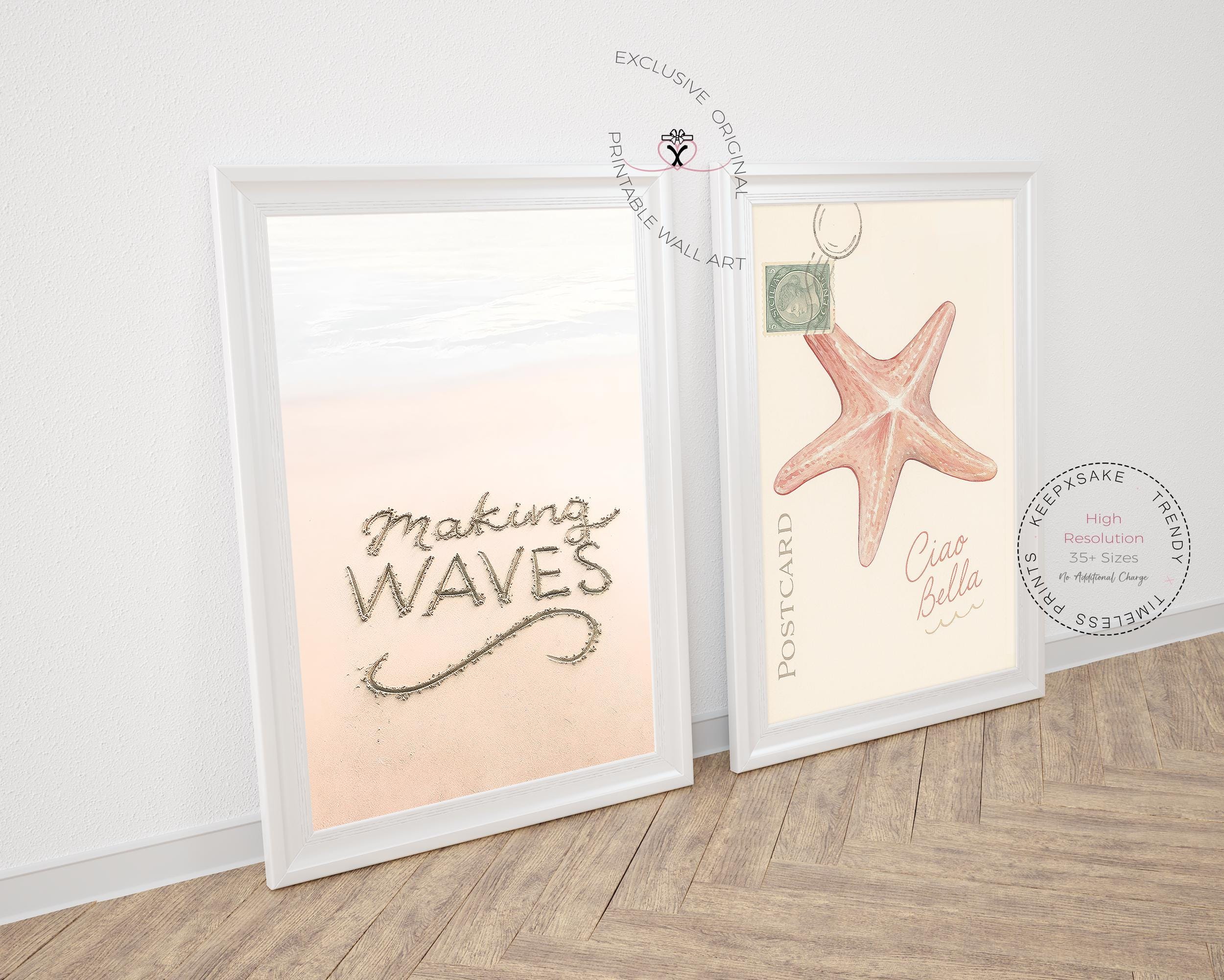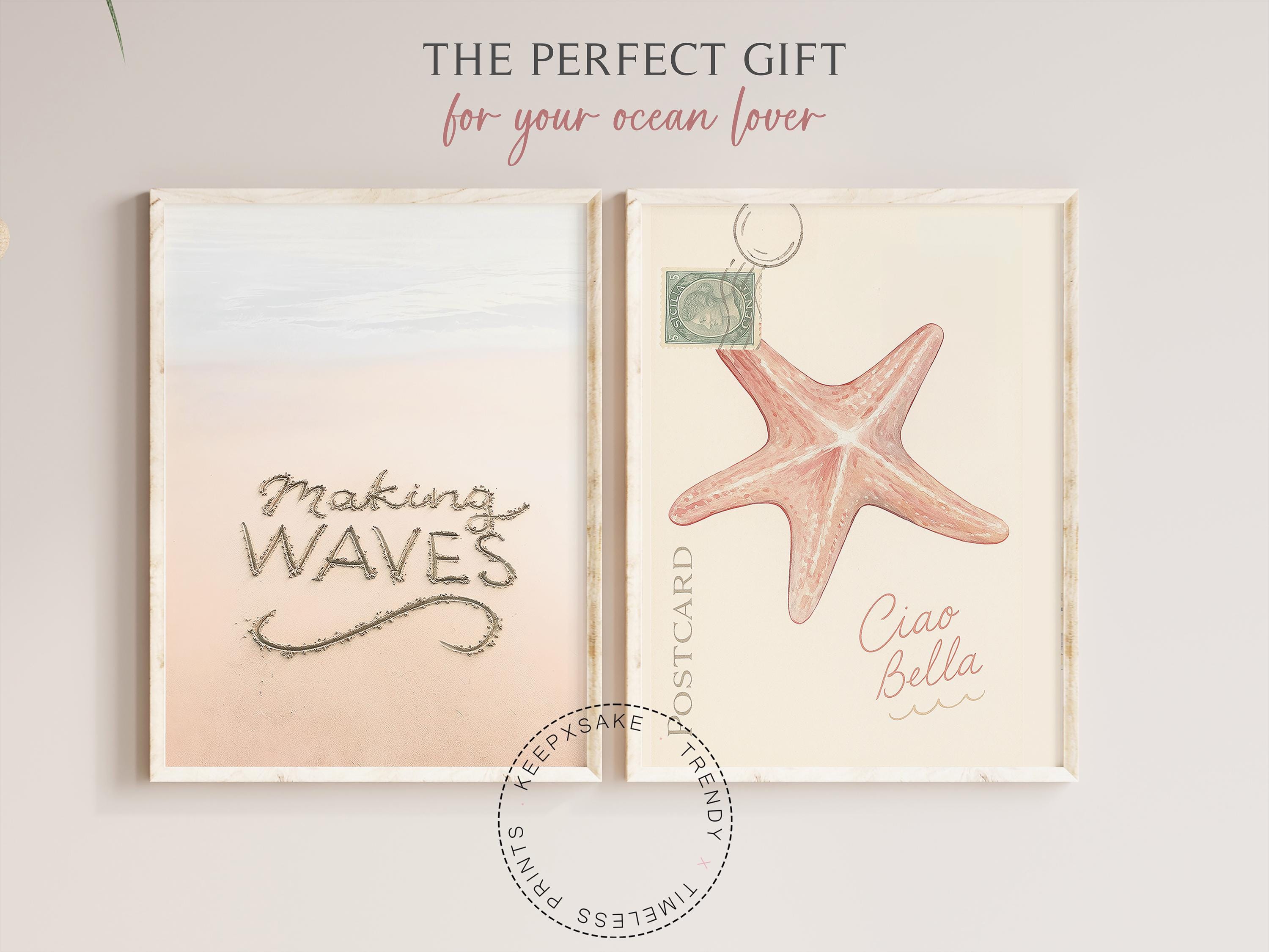 Exclusive Coastal Wall Art Set of 2– “Ciao Bella” & “Making Waves” prints in soft beach tones. Watercolor starfish & sand typography for relaxed coastal decor