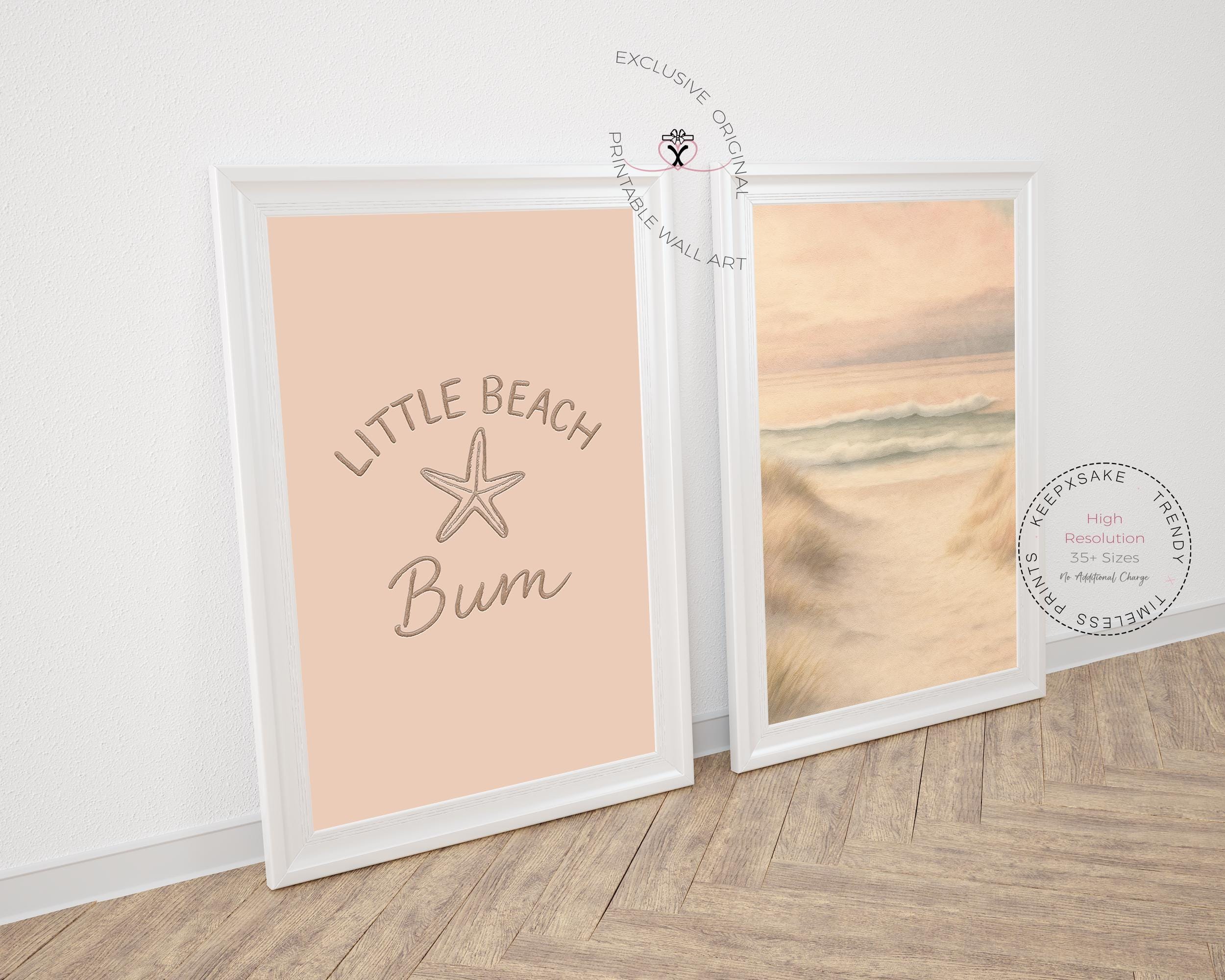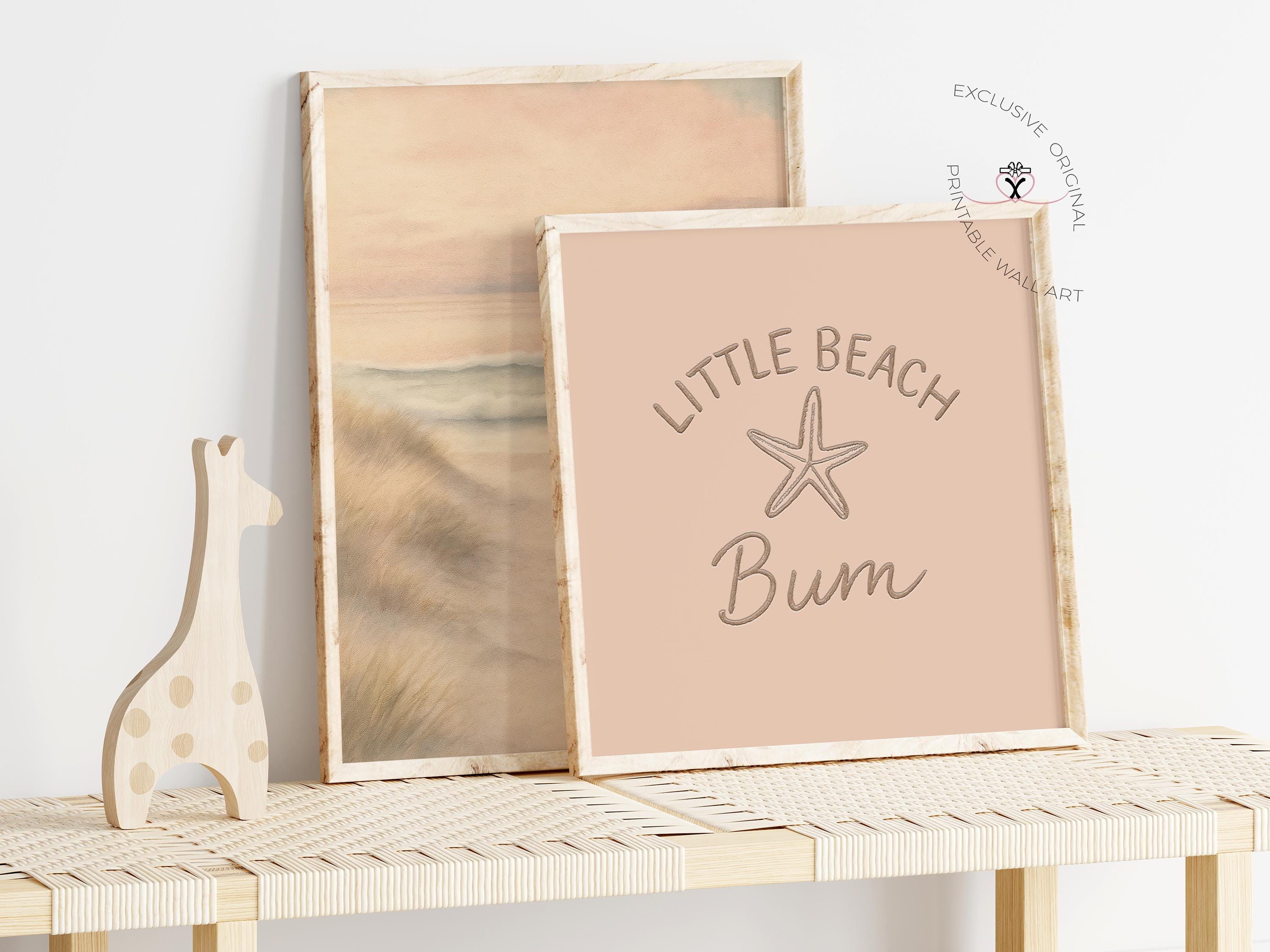 Exclusive Beach Nursery Wall Art – “Little Beach Bum” quote & pastel dunes print in soft neutral tones. Coastal baby room digital download decor.