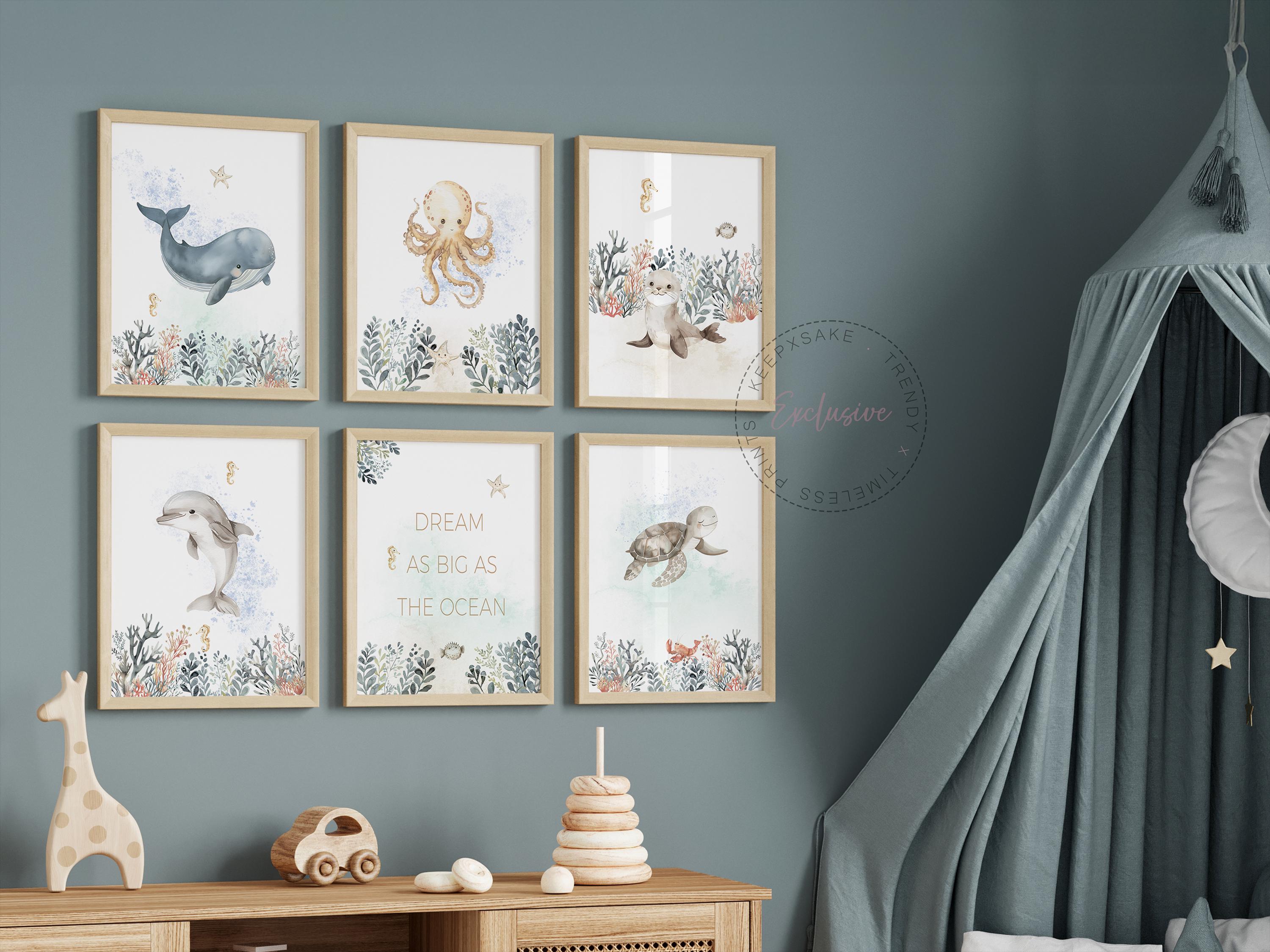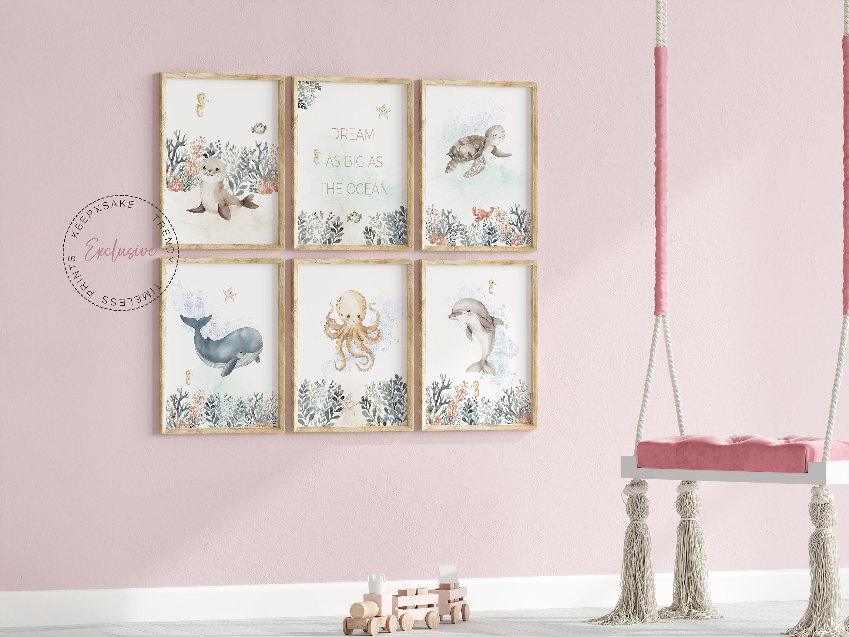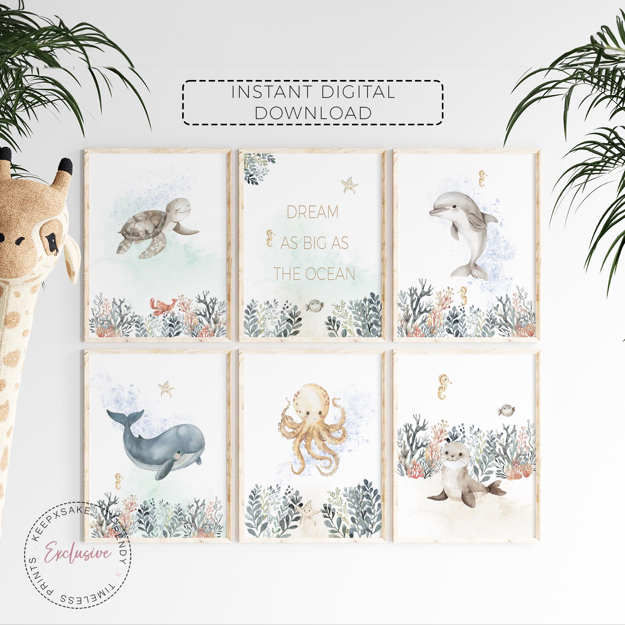 Exclusive Whales, turtles, dolphins & sea life in soft watercolor tones — a dreamy ocean nursery print set that inspires your little one to “Dream Big