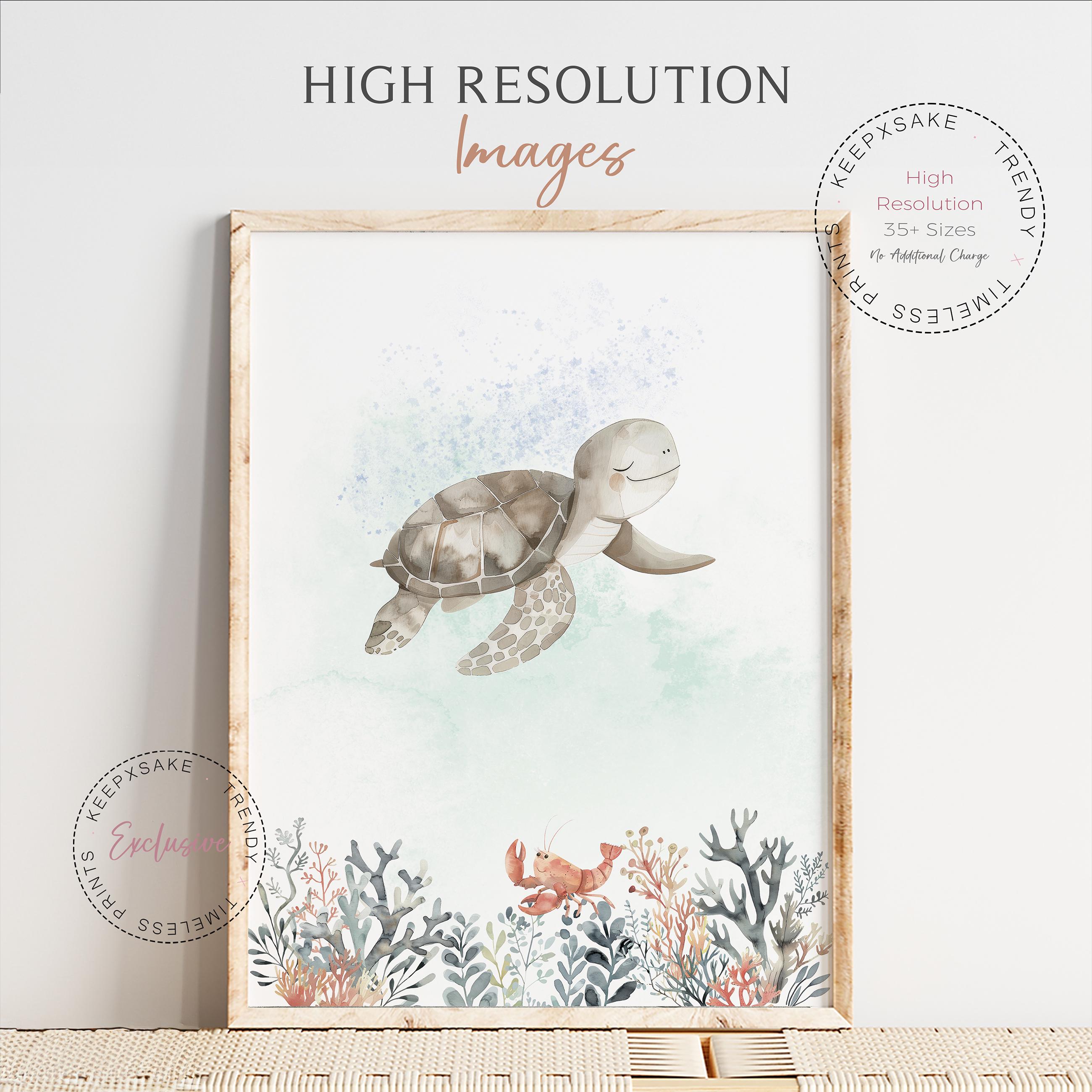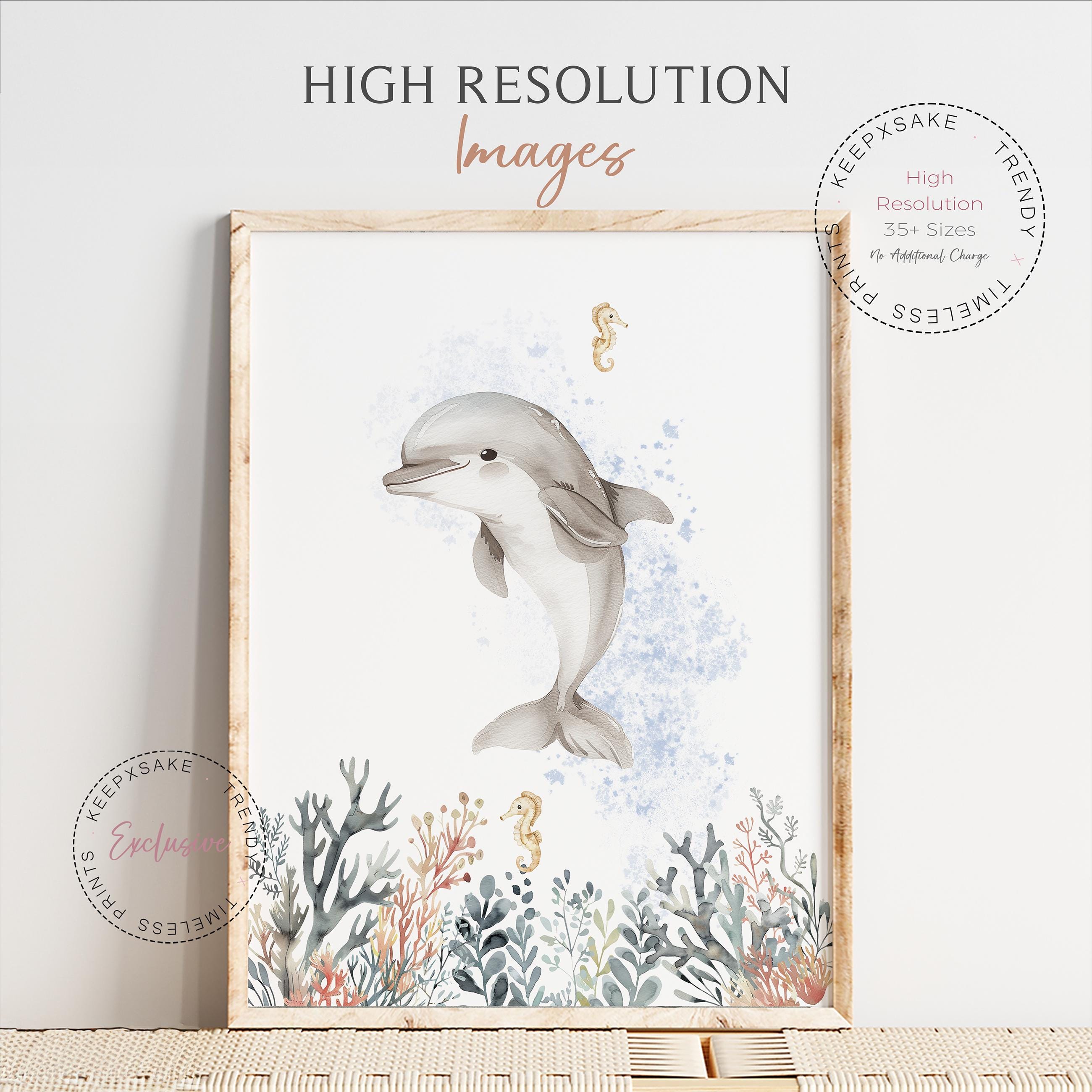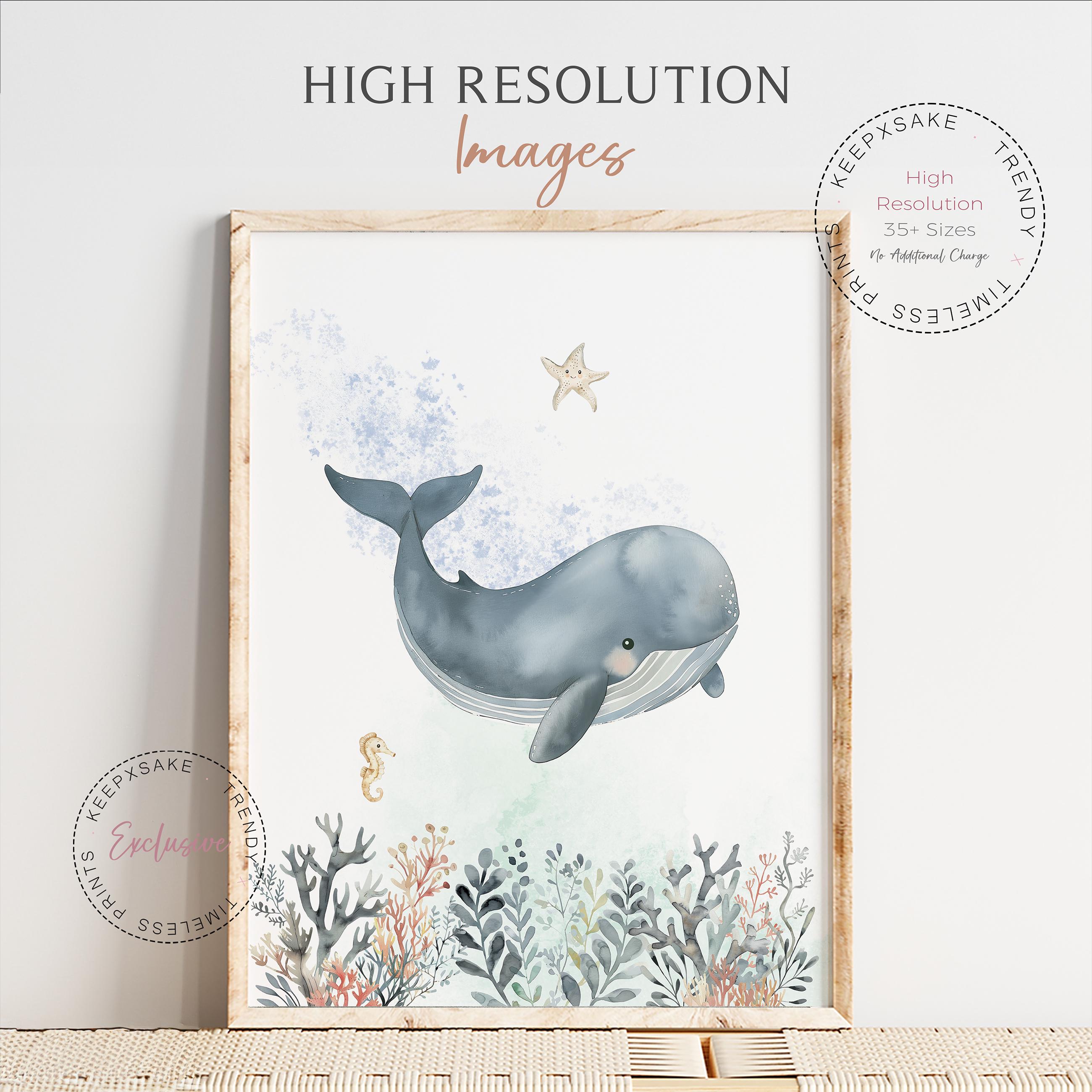 Exclusive Whales, turtles, dolphins & sea life in soft watercolor tones — a dreamy ocean nursery print set that inspires your little one to “Dream Big