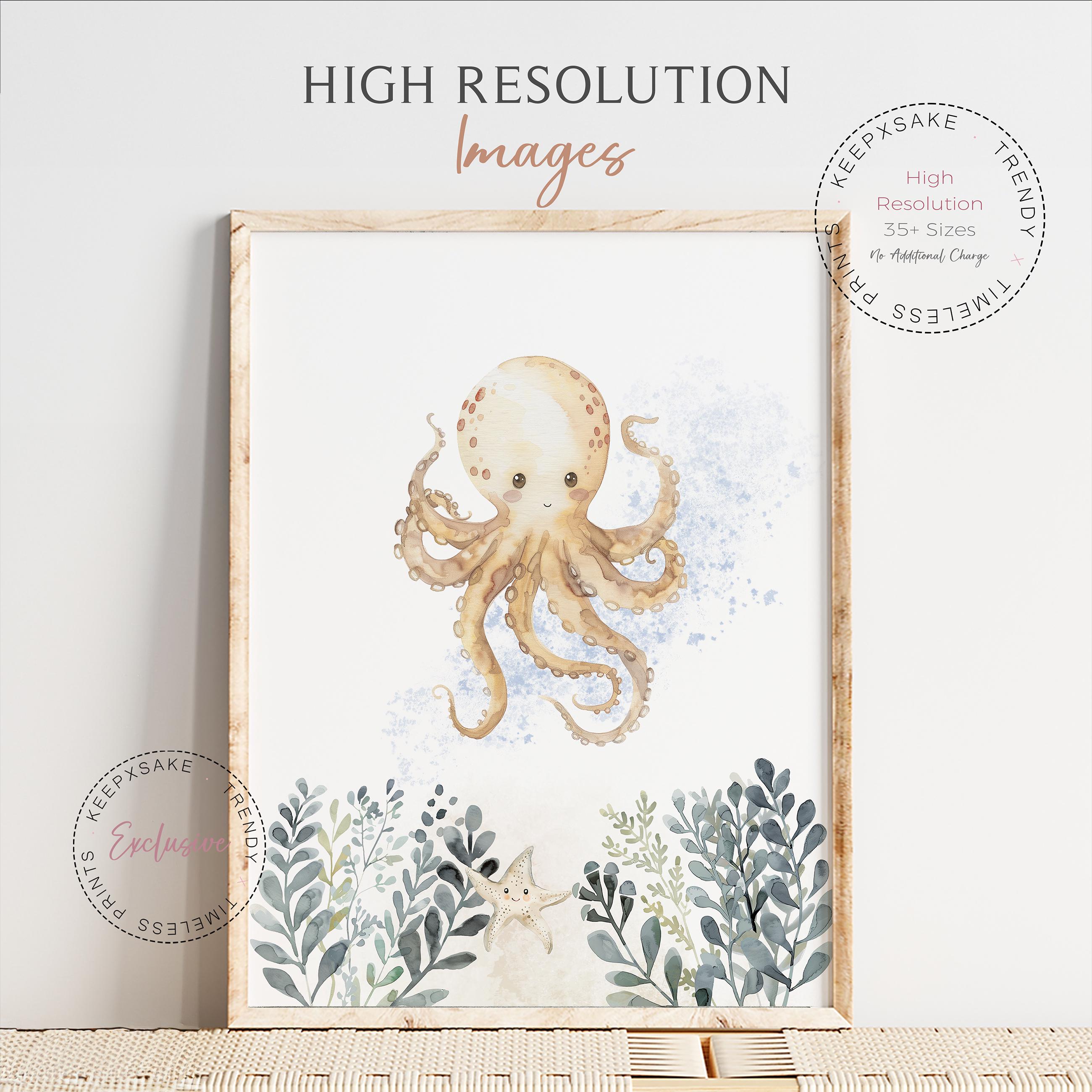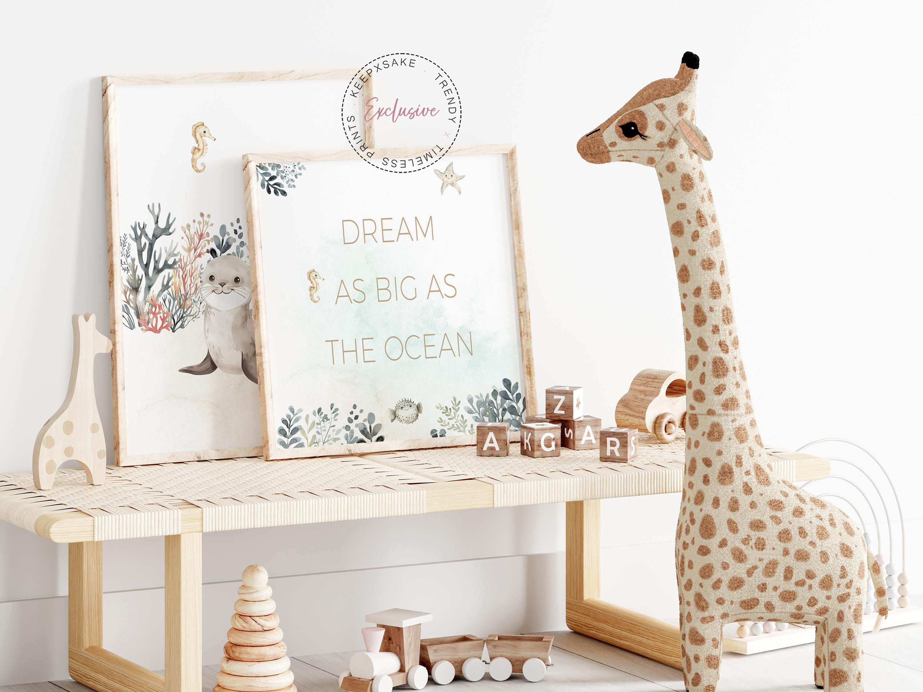 Dive into a world of gentle watercolor seas with this Ocean Animal Nursery Wall Art Set from the KEEPxSAKE Coastal Collection. Featuring watercolor sea friends — a dolphin, whale, turtle, octopus, and otter — this set captures the magic of the ocean in soothing, modern tones. The center print reads “Dream as big as the ocean” — a reminder for your little one to reach for their dreams. Designed in soft watercolor hues of blue, sand, and coral, this collection brings calm coastal charm to any nursery or playroom.