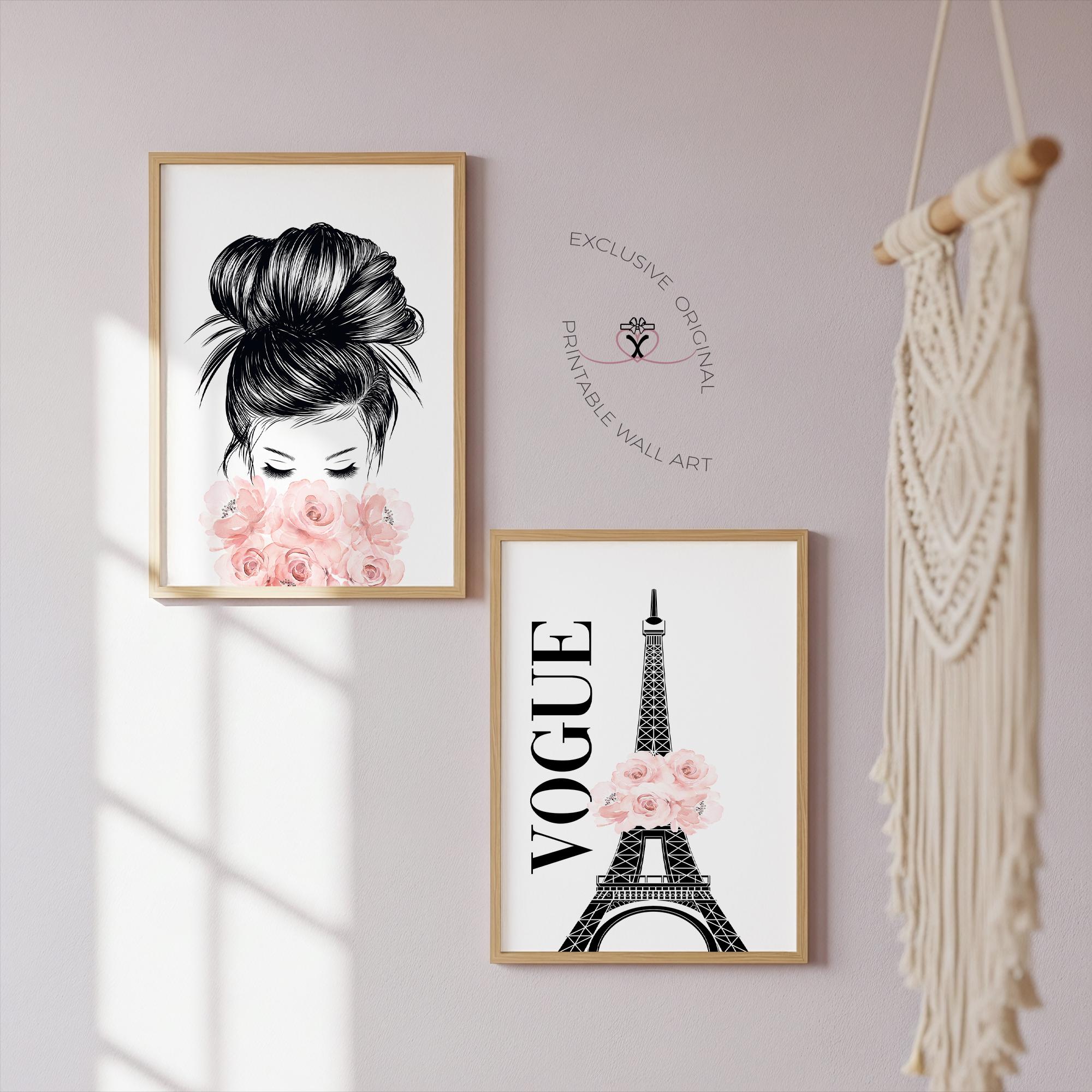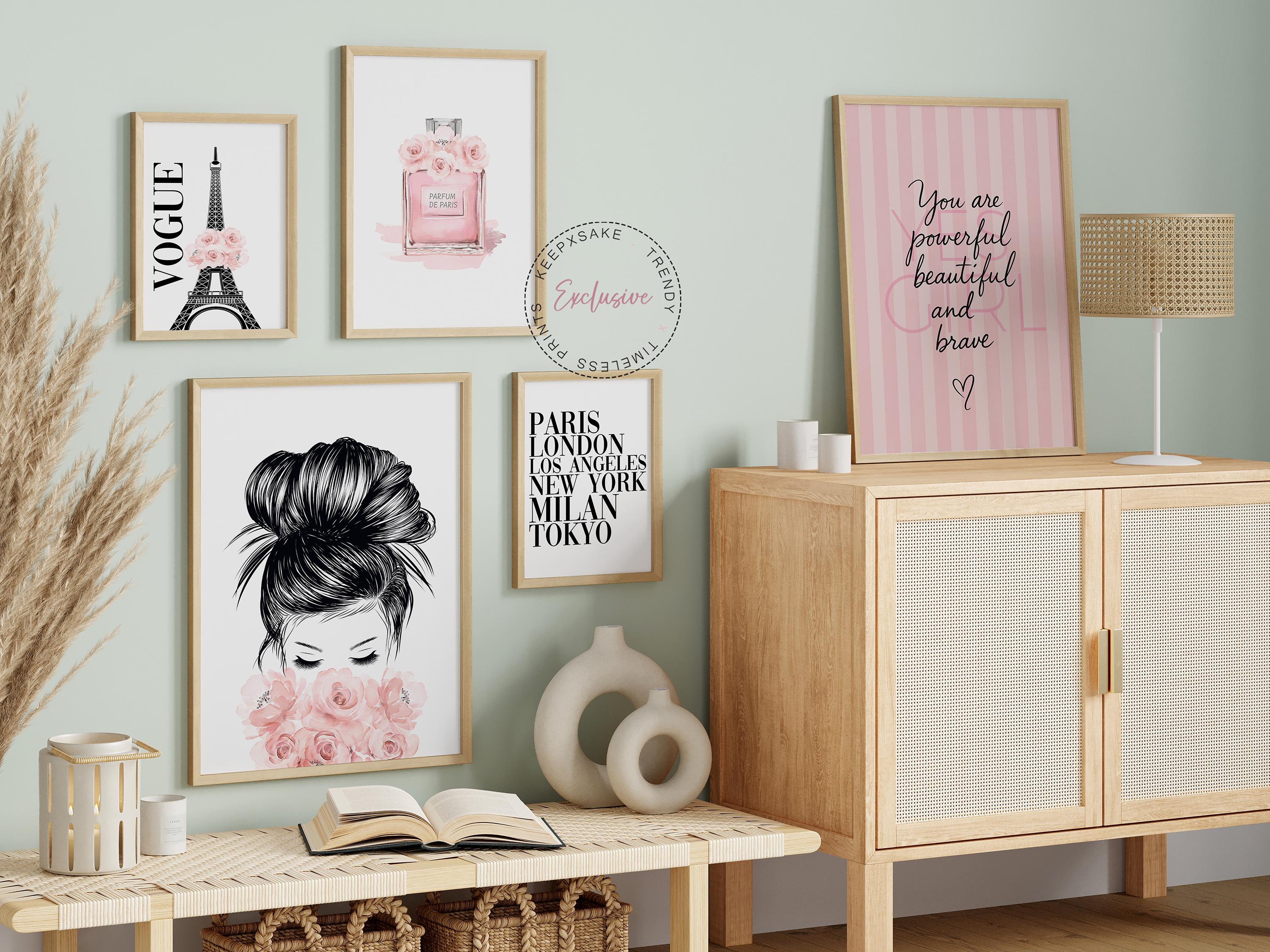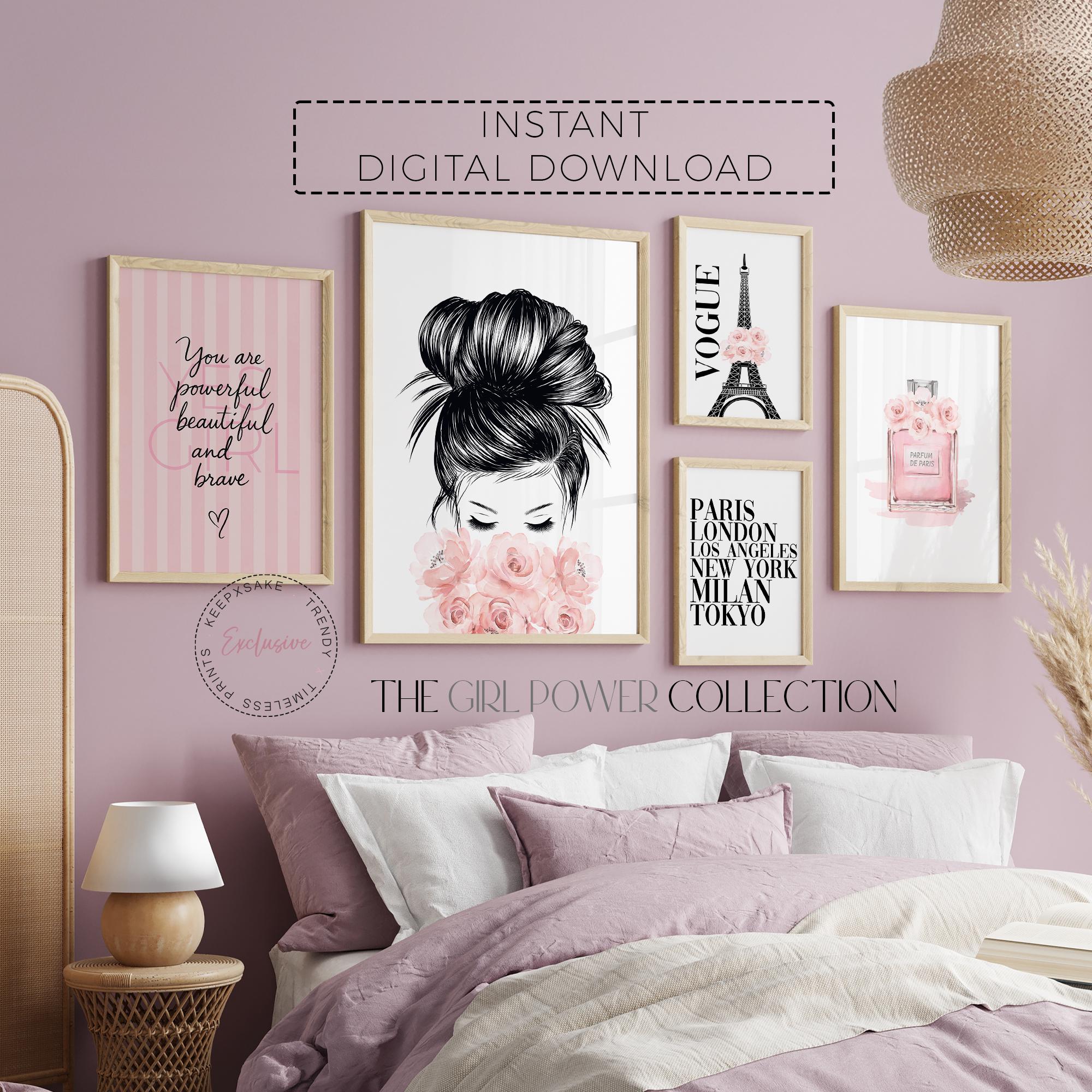Exclusive Chic pink fashion wall art set featuring Paris, perfume, Vogue style, and inspirational quotes. Perfect for teen rooms, bedrooms & girl boss spaces