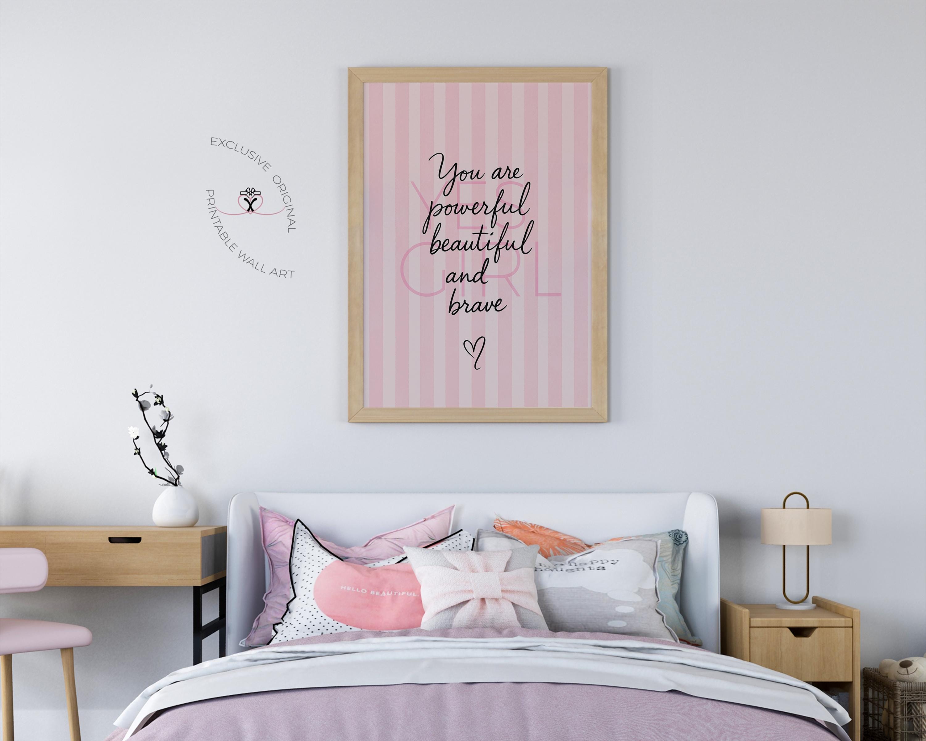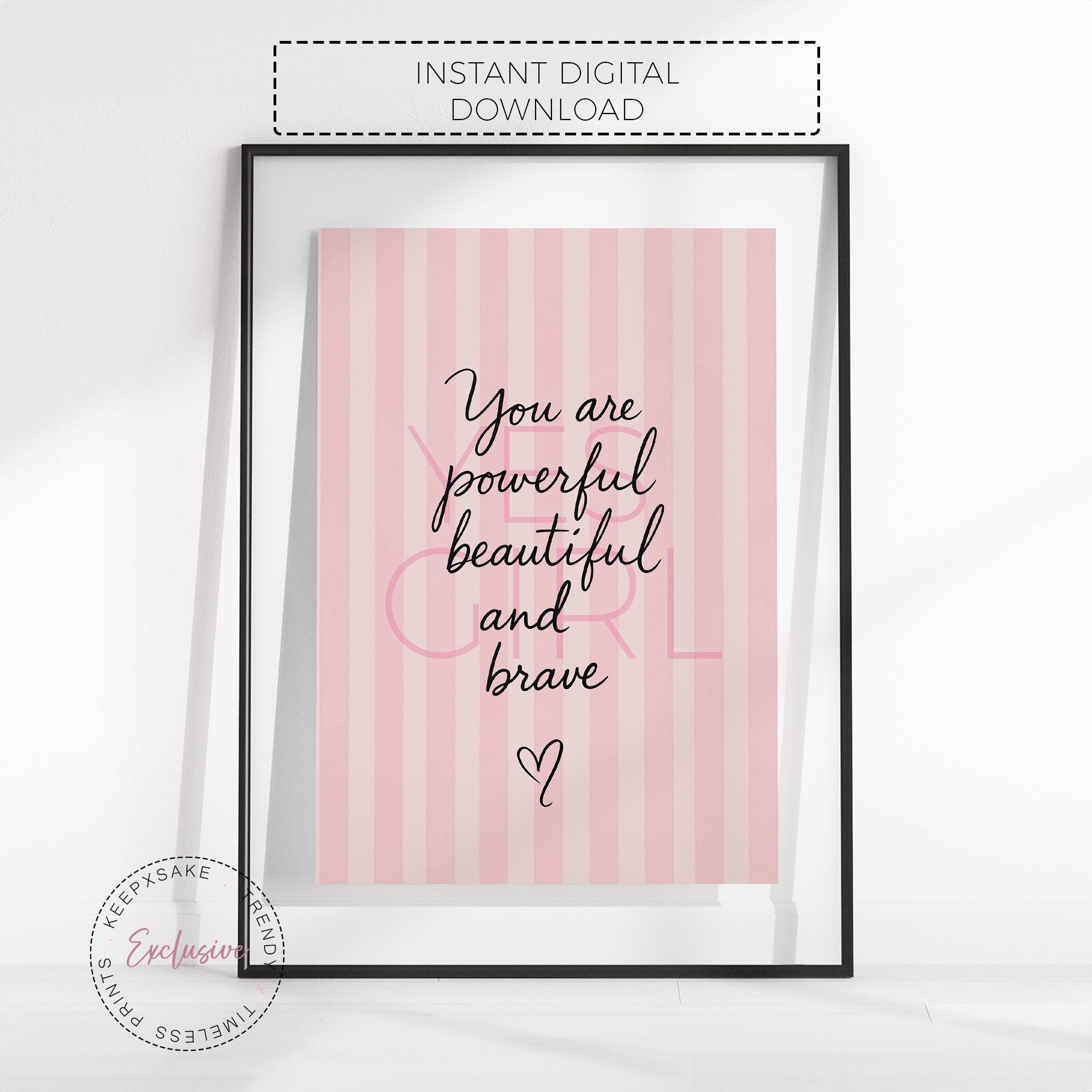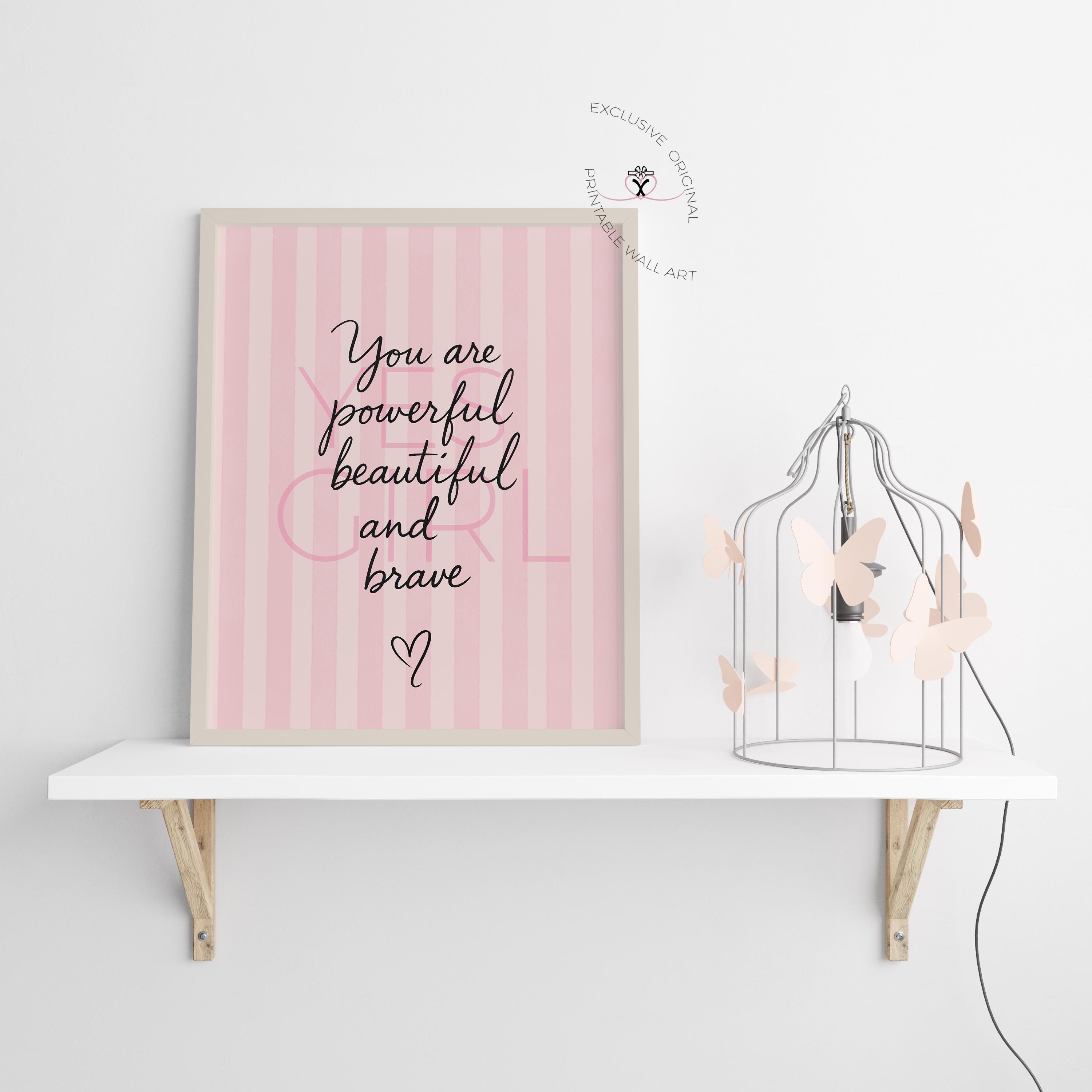 Exclusive Blush Pink “Yes Girl” fashion-style print with the quote You are powerful, beautiful and brave. Perfect for stylish nurseries & girl bedrooms