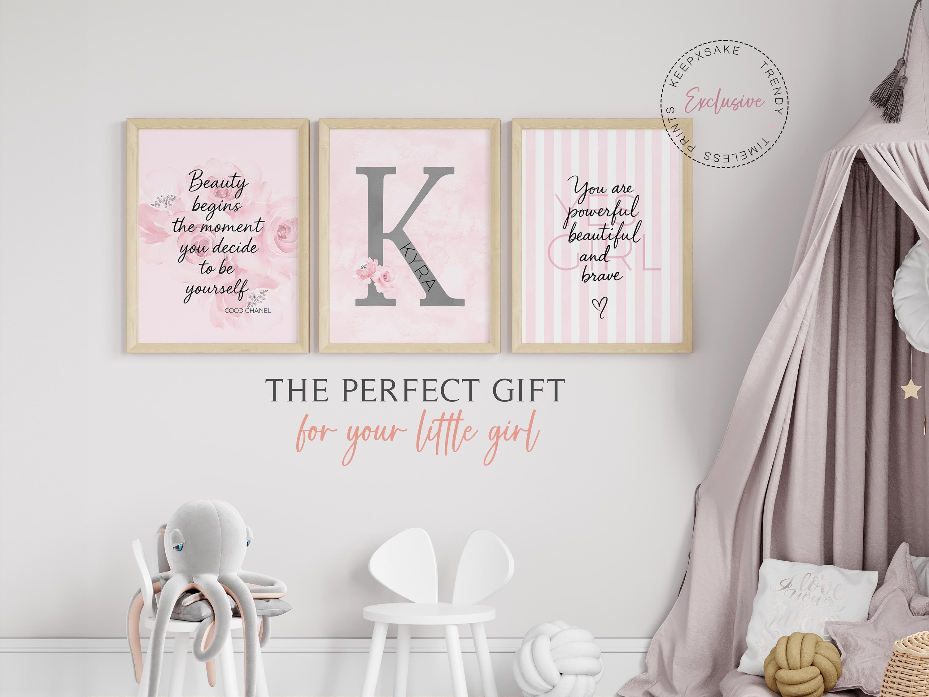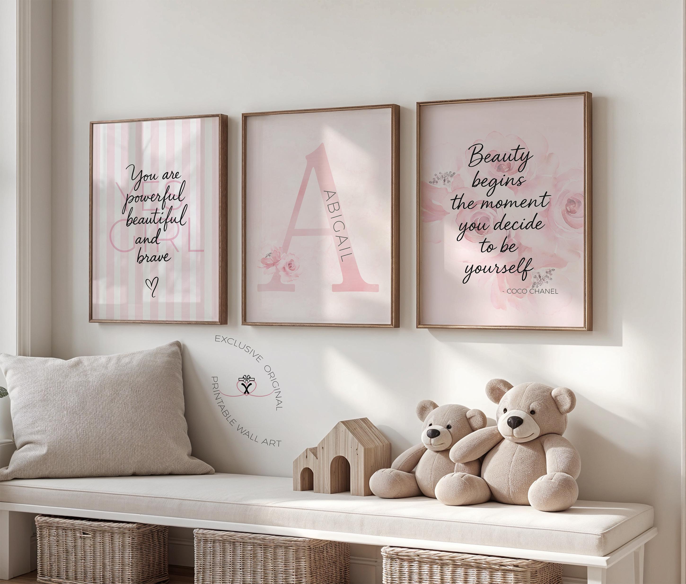 Exclusive Chic pink fashion-inspired wall art trio for girls & teens, featuring beauty quotes and a personalized initial—perfect modern bedroom art.