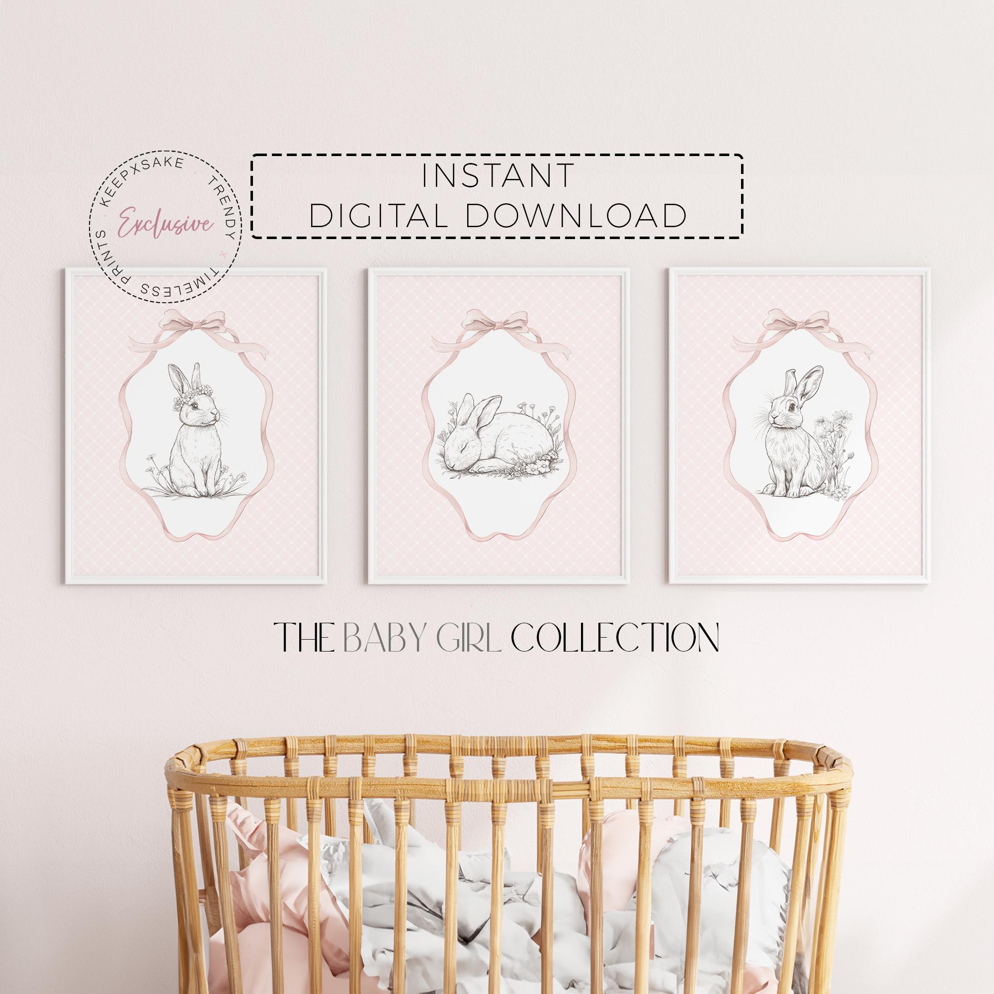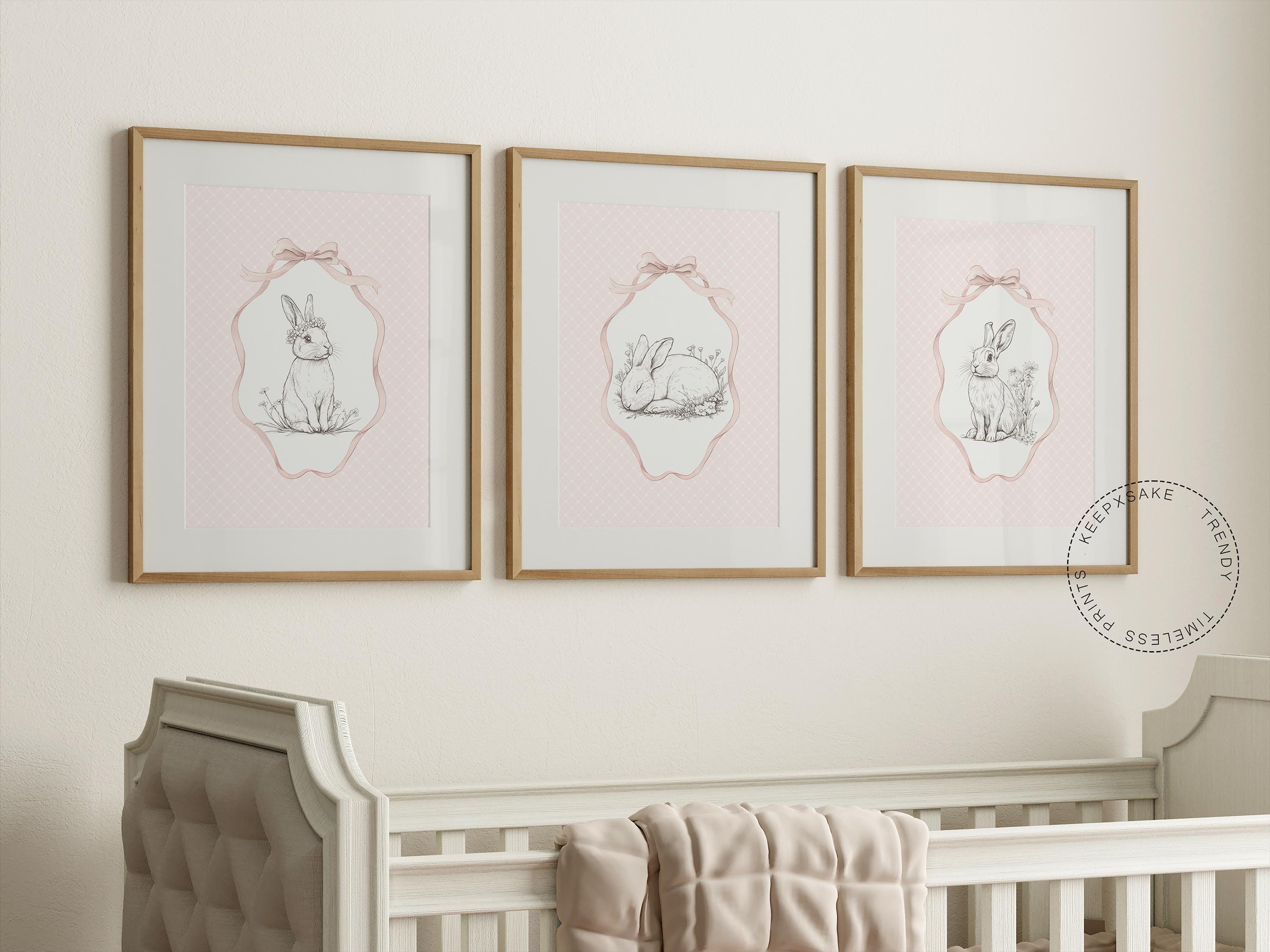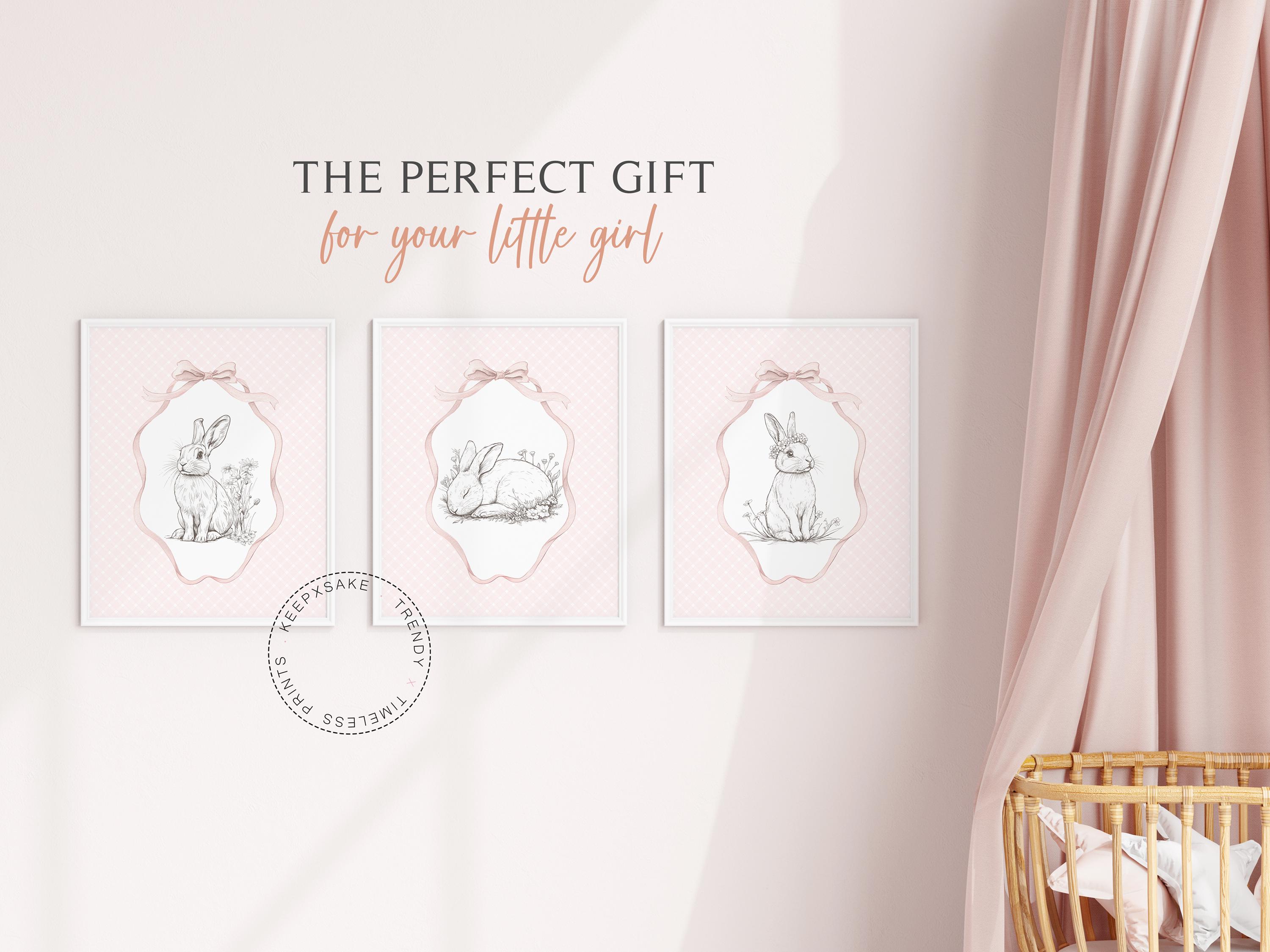 Create a soft, dreamy space with this beautiful cottagecore bunny wall art trio. Each illustration features delicate, hand-drawn rabbits framed with a pastel pink bow and subtle gingham texture — the perfect blend of vintage charm and modern baby-girl style. Designed in a feminine palette, this set adds a gentle, whimsical cottagecore touch to nurseries, playrooms, and baby girl bedrooms. The timeless sketch style and soft blush tones make it easy to style with wicker cribs, neutral décor, florals, and rustic natural textures.