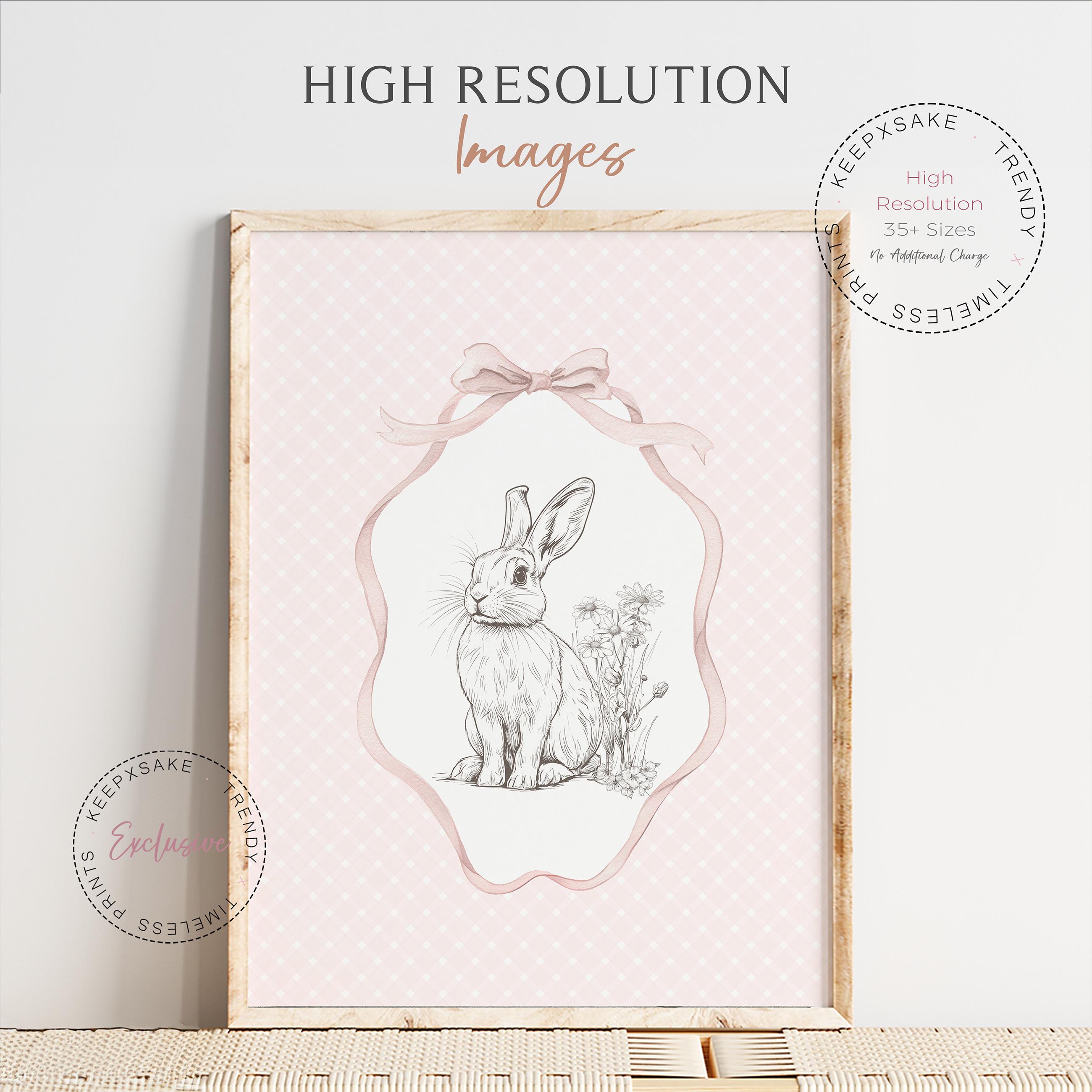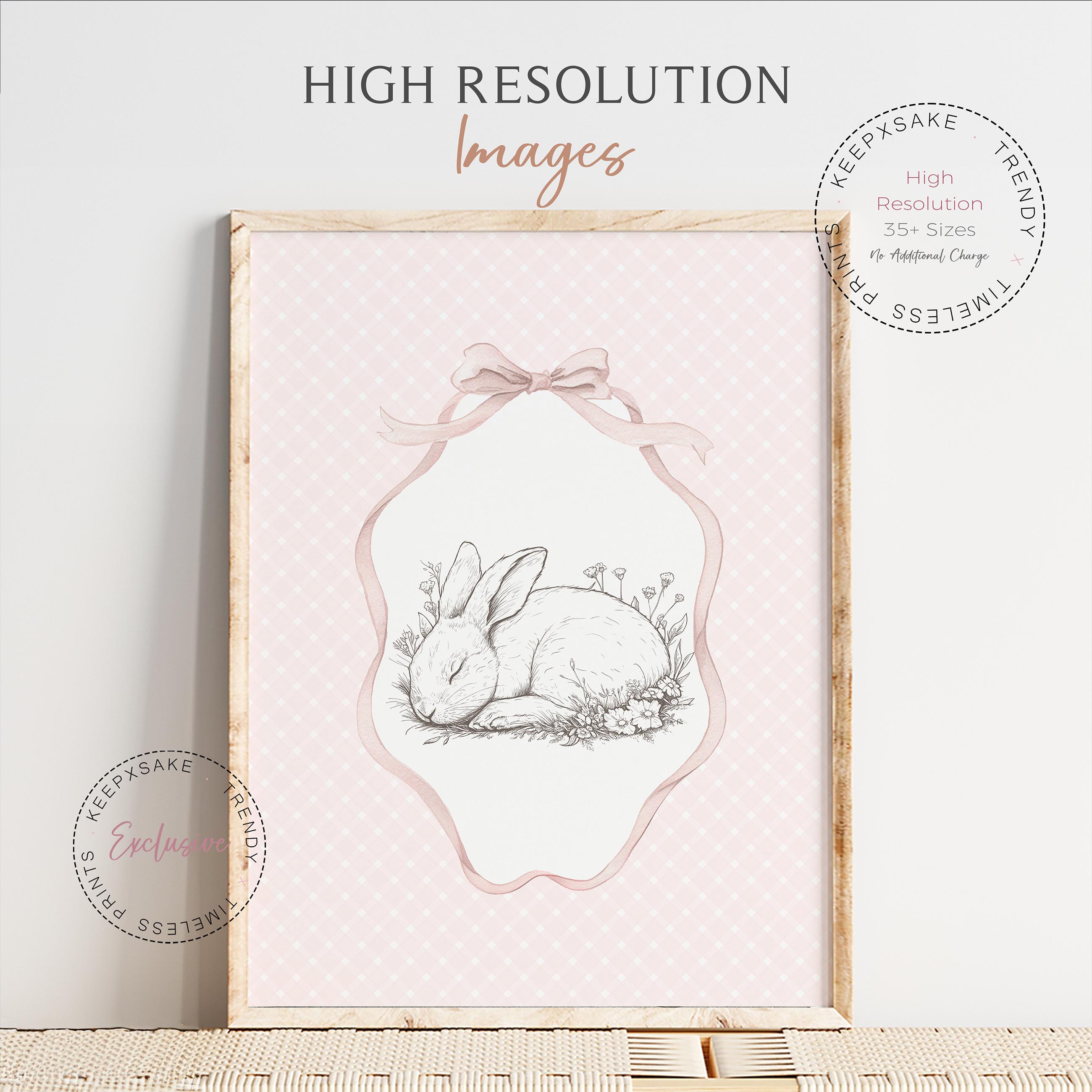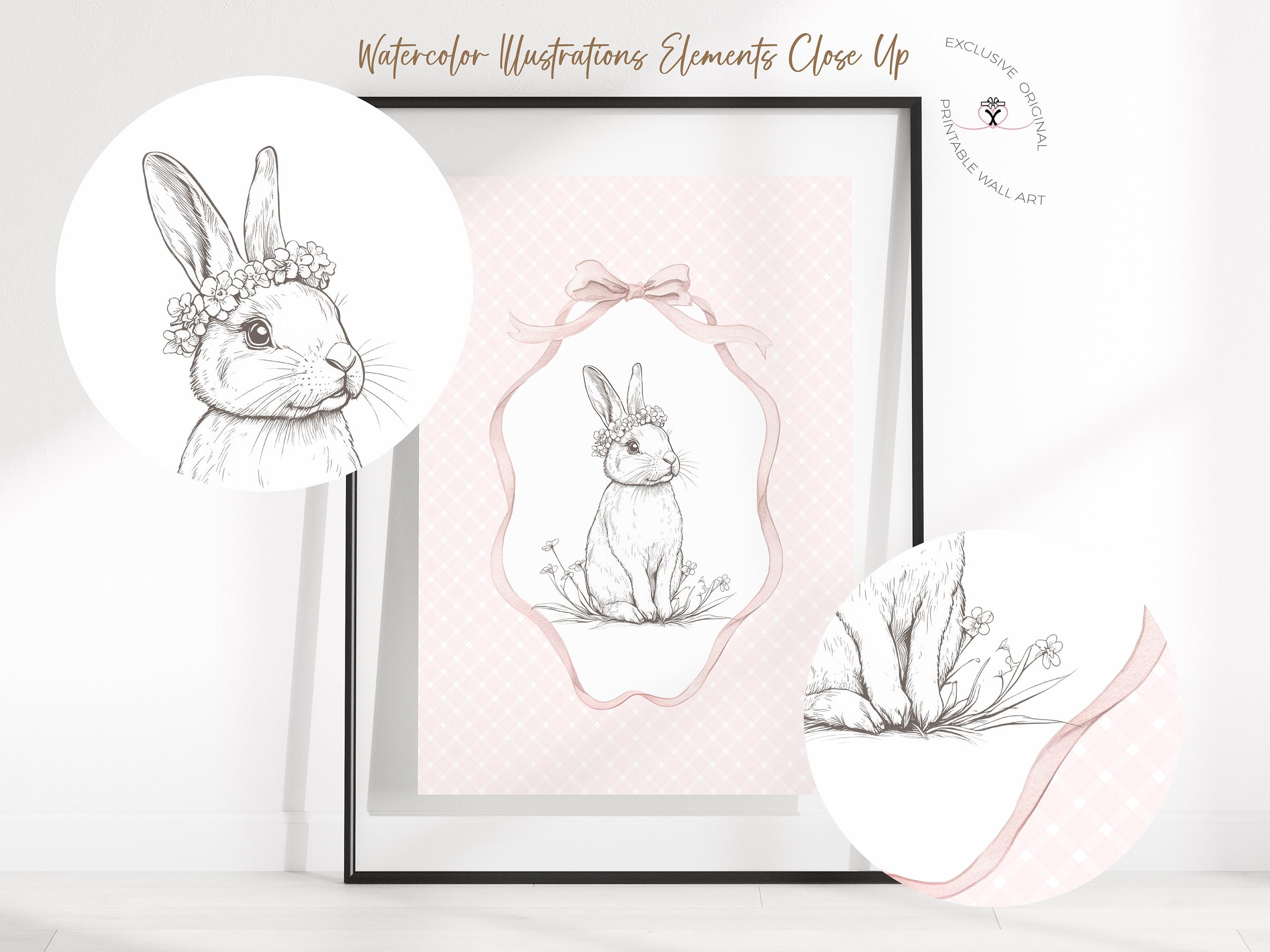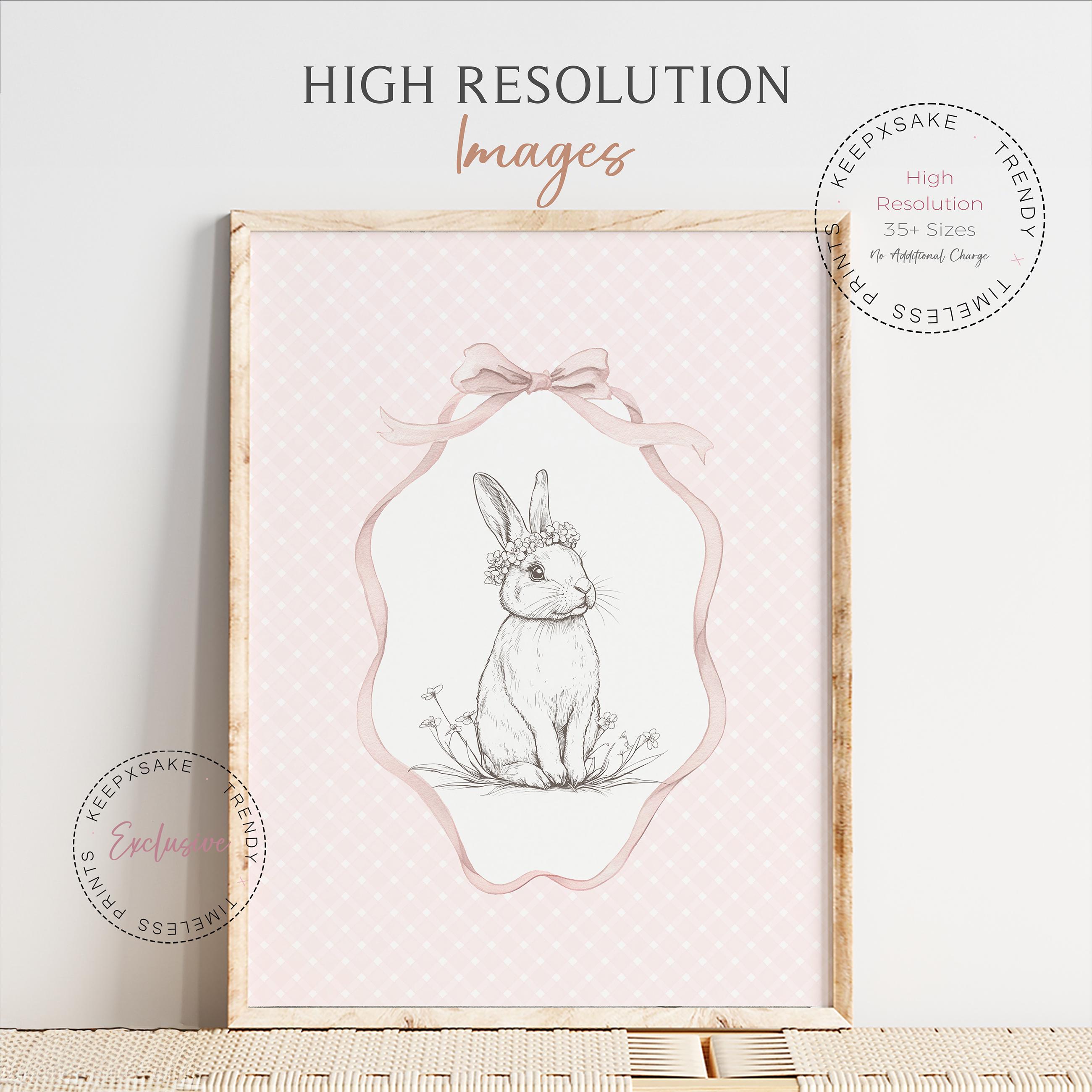 Create a soft, dreamy space with this beautiful cottagecore bunny wall art trio. Each illustration features delicate, hand-drawn rabbits framed with a pastel pink bow and subtle gingham texture — the perfect blend of vintage charm and modern baby-girl style. Designed in a feminine palette, this set adds a gentle, whimsical cottagecore touch to nurseries, playrooms, and baby girl bedrooms. The timeless sketch style and soft blush tones make it easy to style with wicker cribs, neutral décor, florals, and rustic natural textures.