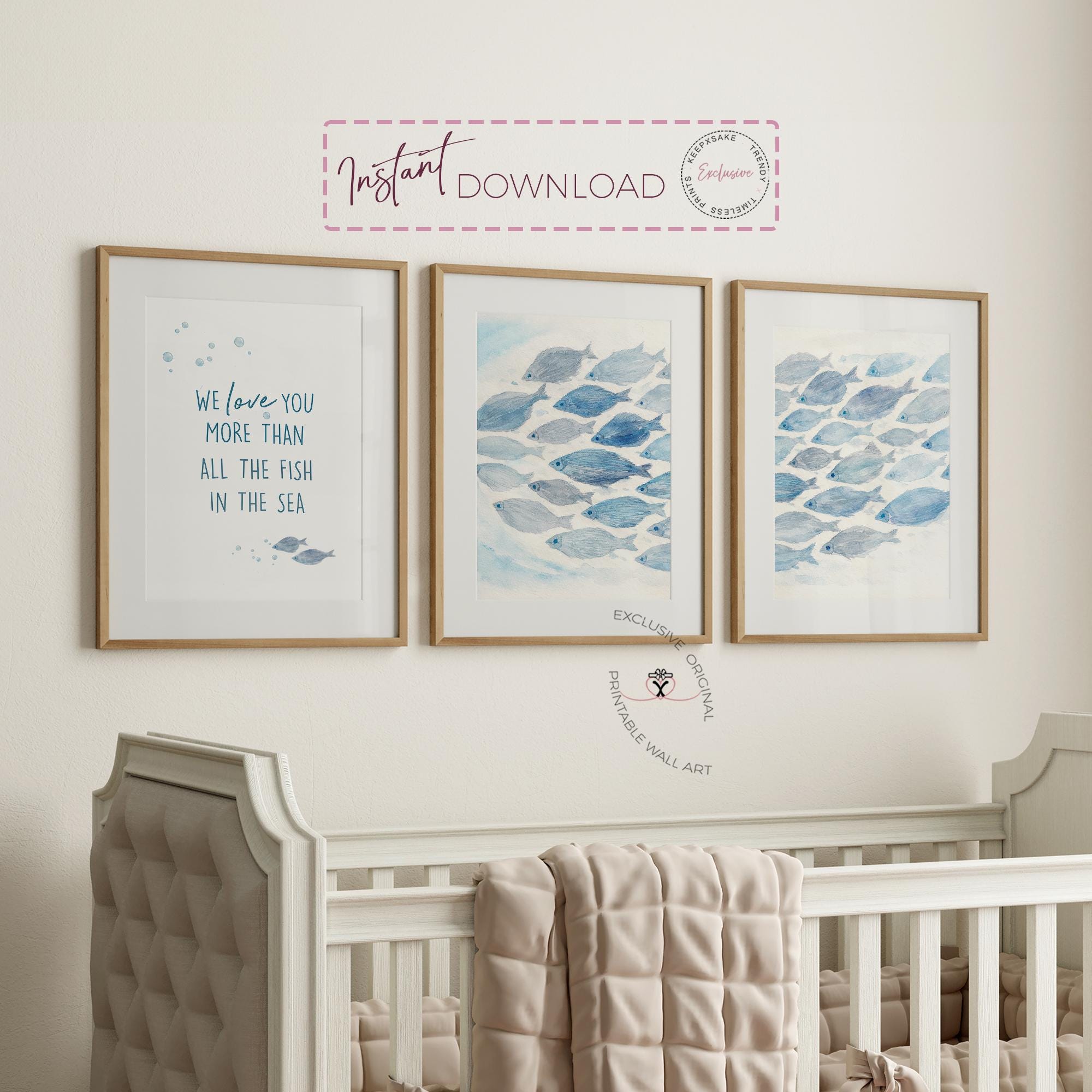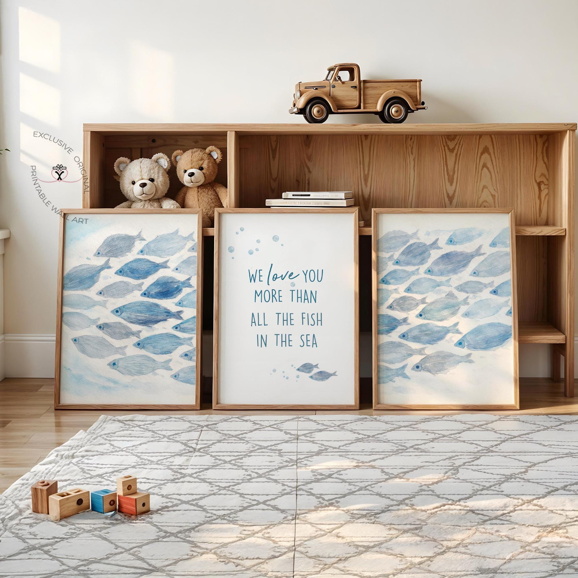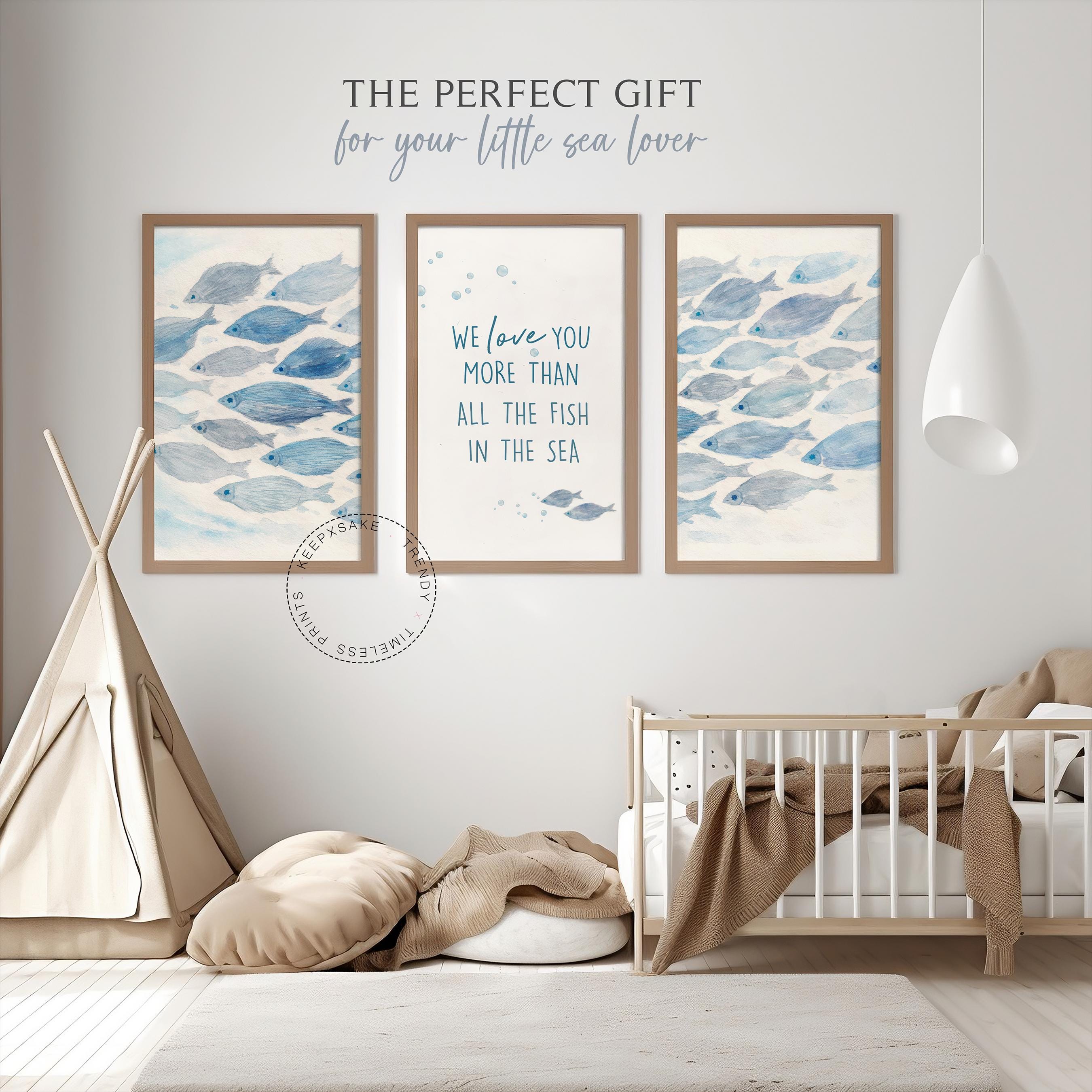 Each of our printable designs is made with love to help you create a space that feels soft, personal, and timeless. Create a calm, dreamy space with this watercolor ocean nursery wall art set, featuring soft blue fish swimming together and the heartfelt quote: “We love you more than all the fish in the sea.”