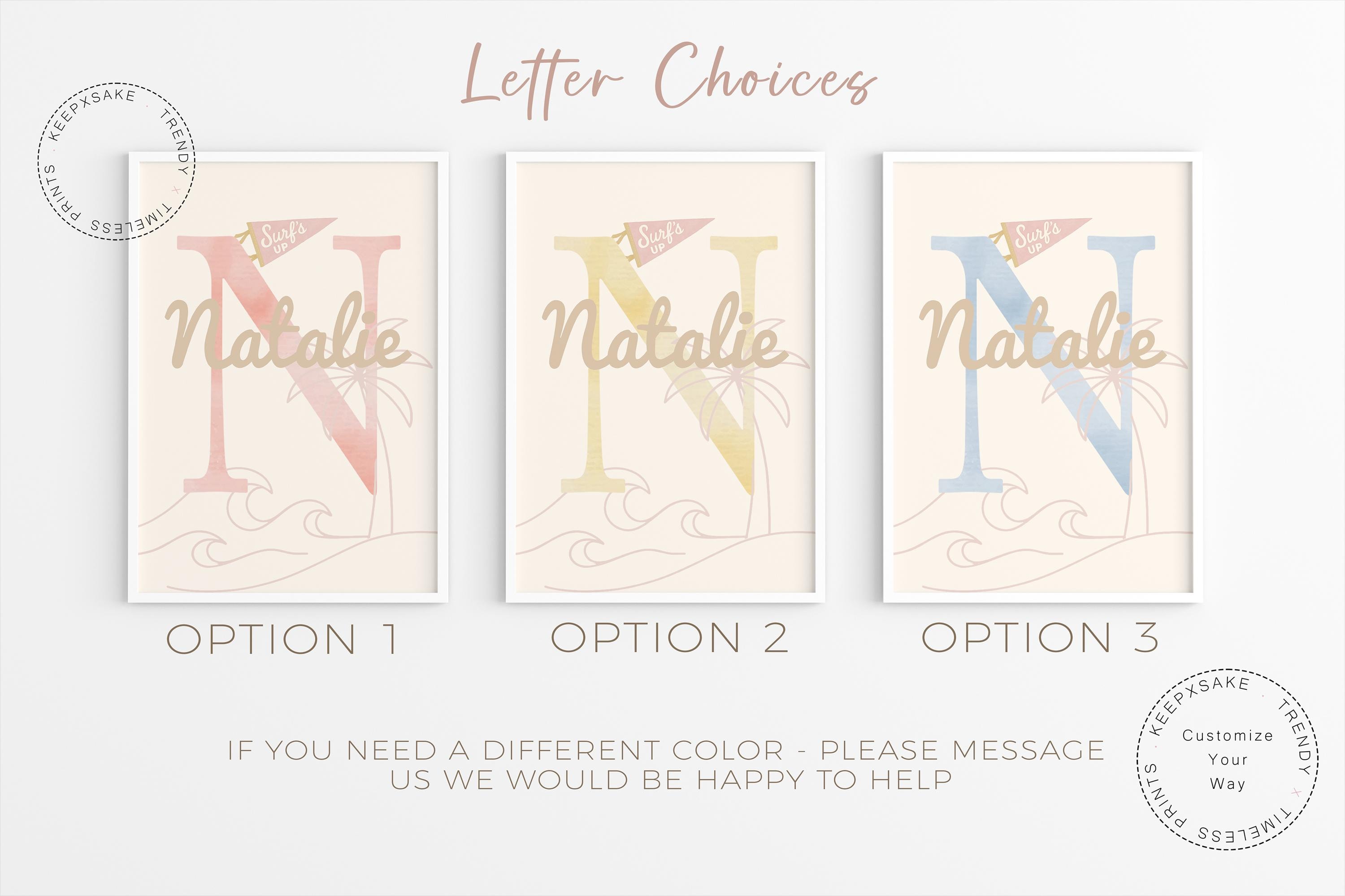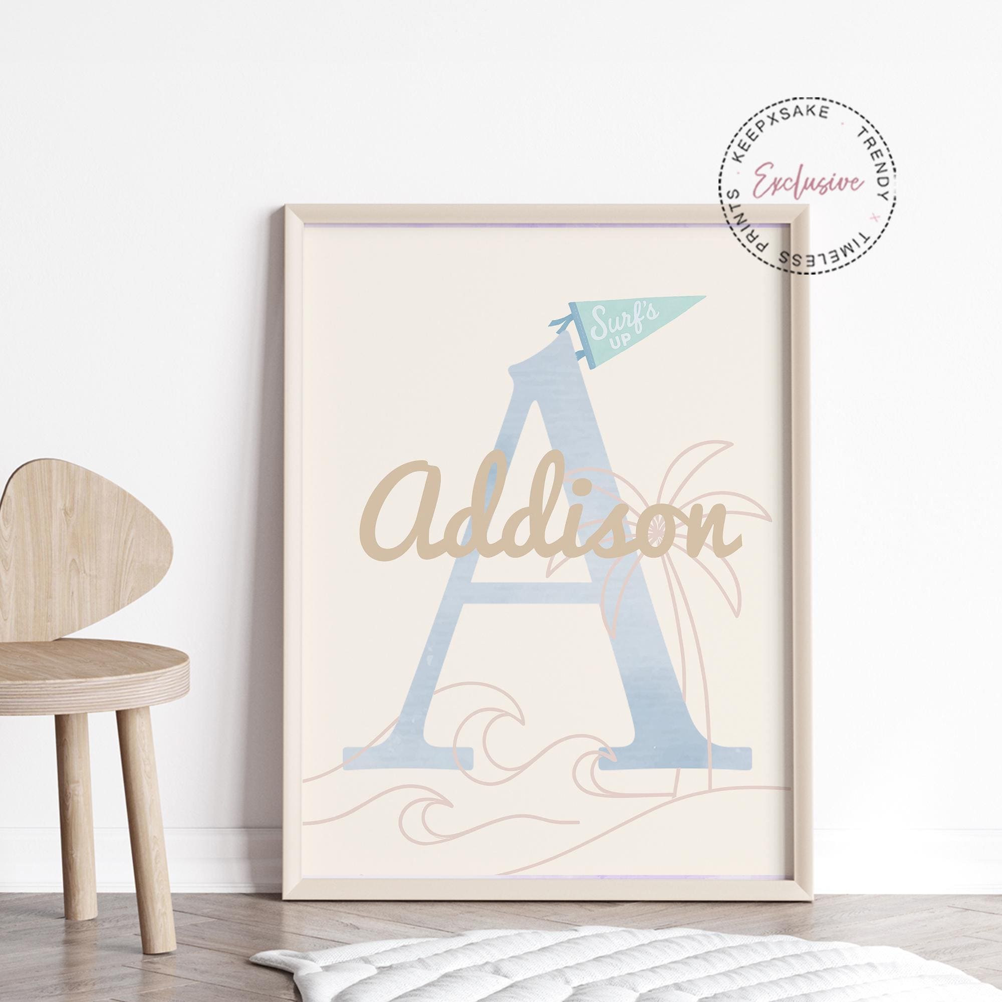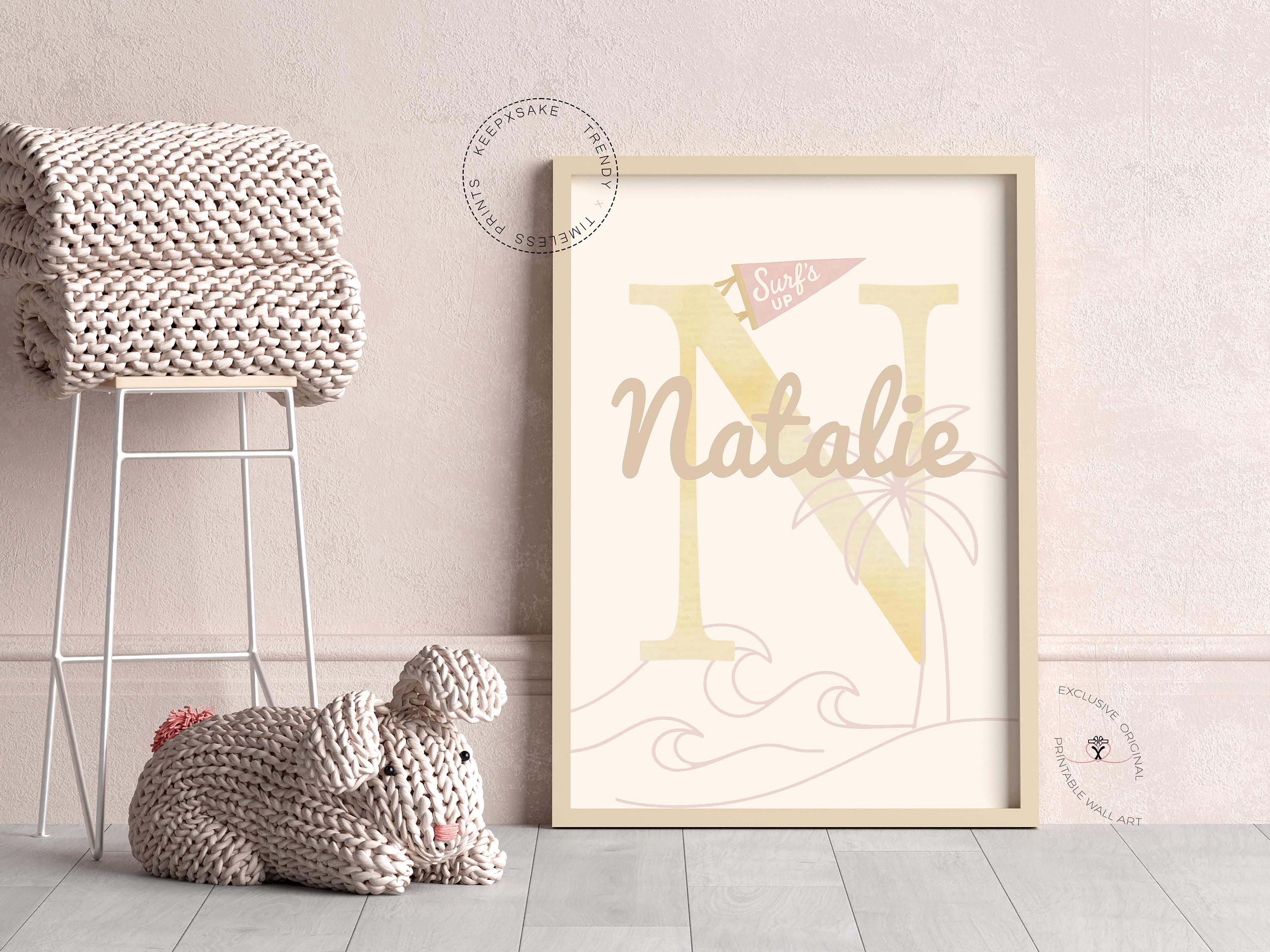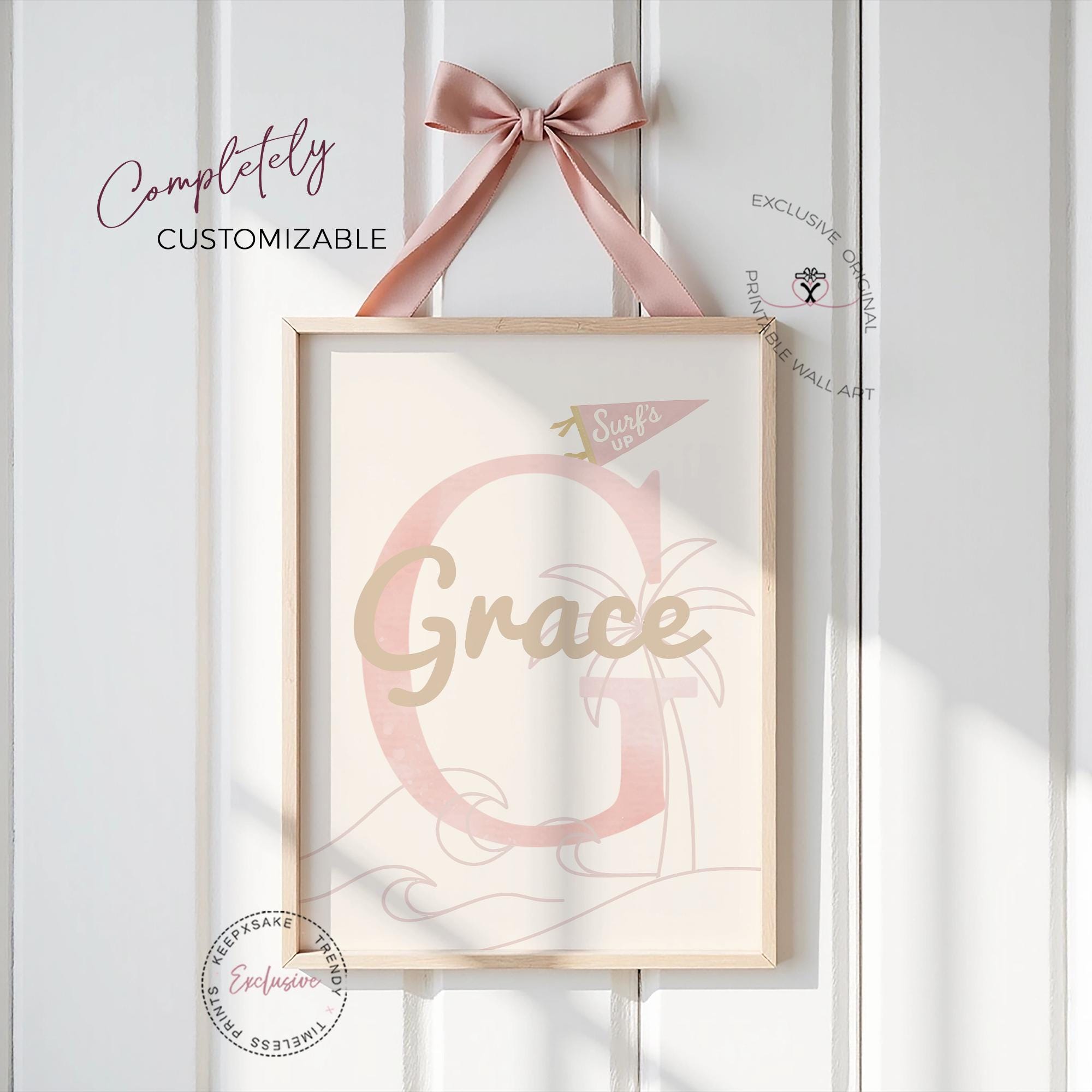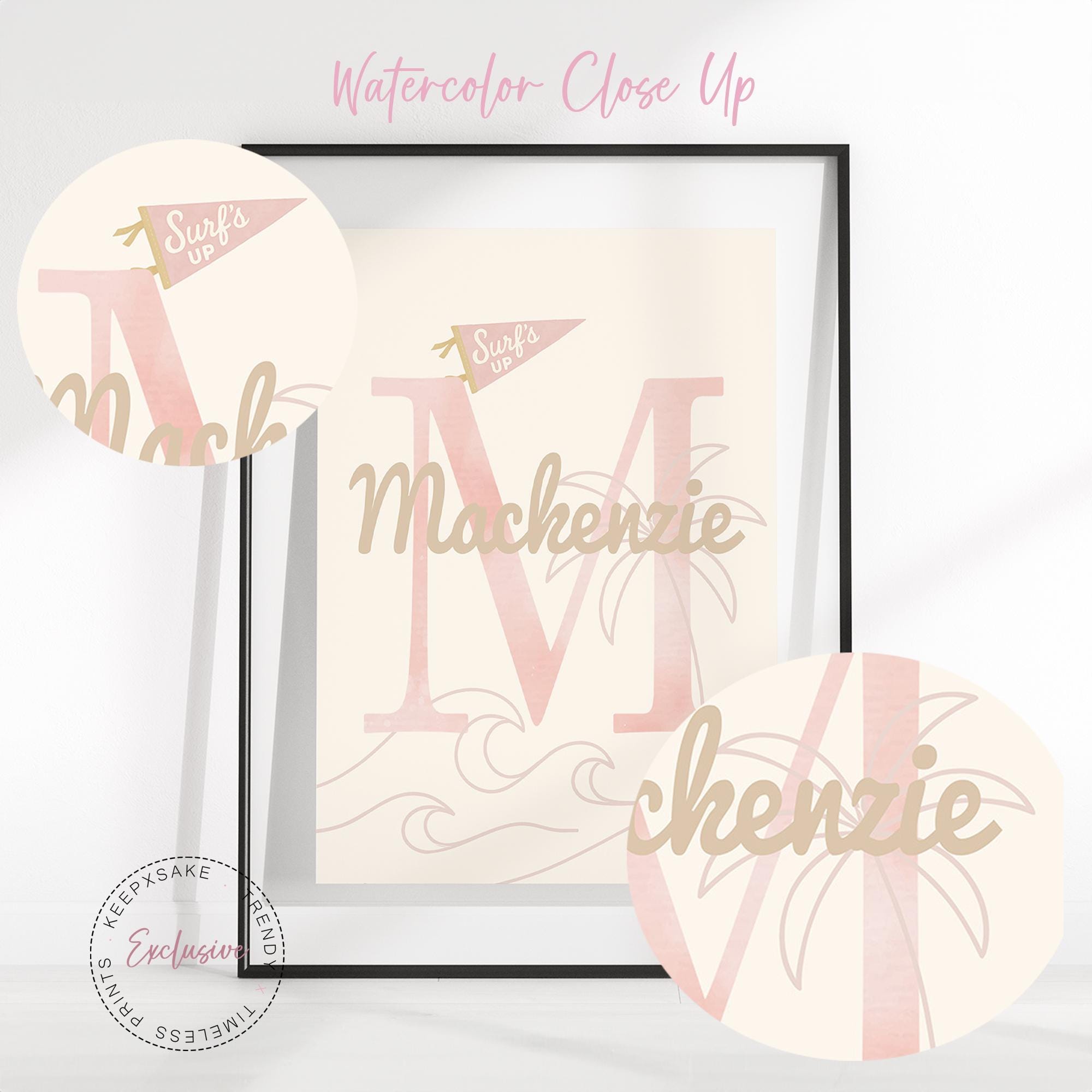 Bring calm coastal charm into your child’s space with this personalized surfer girl name print, designed with a soft watercolor initial and gentle beach details inspired by ocean days and salty air.