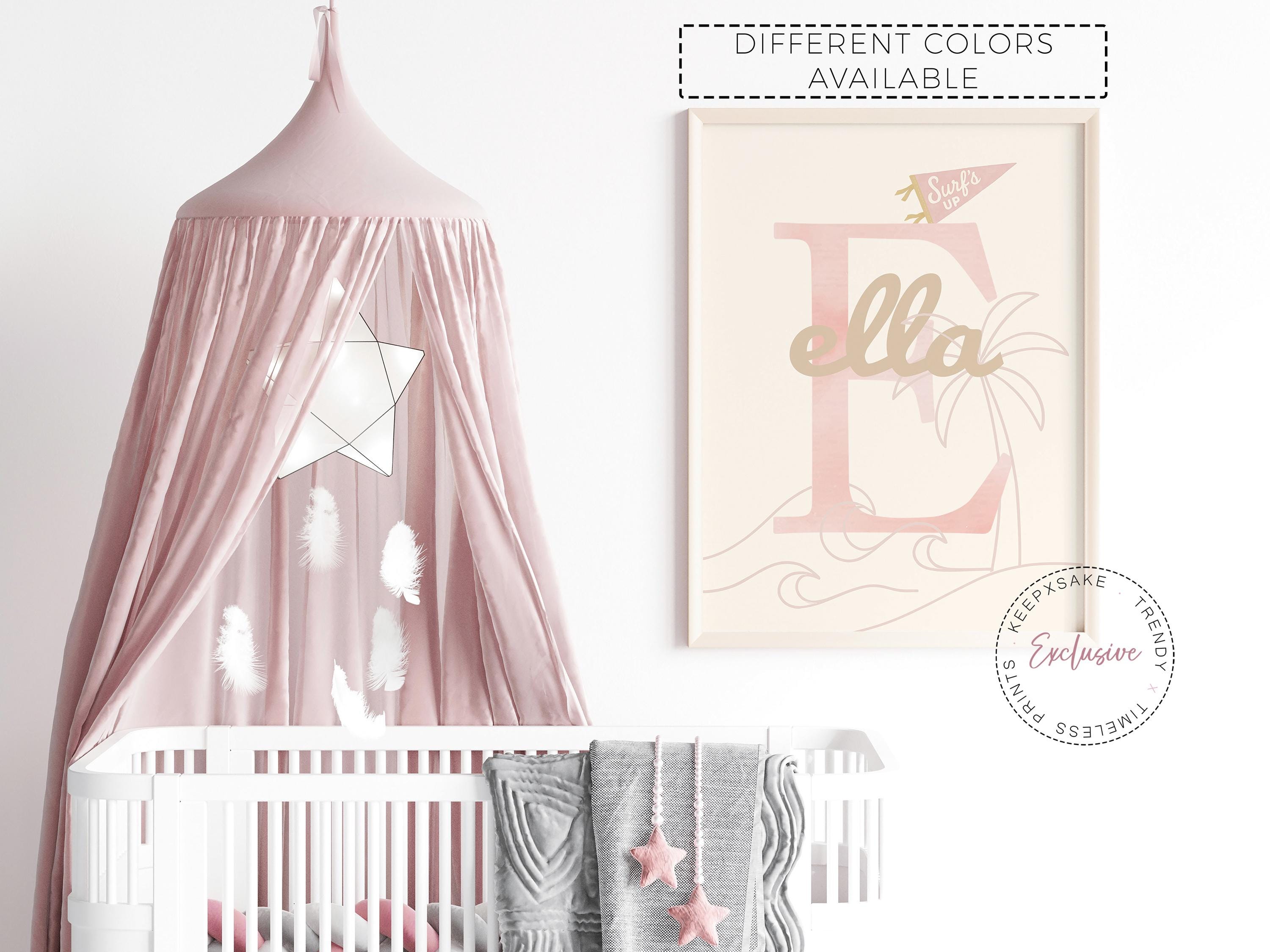 This custom wall art features your child’s name layered over a hand-painted letter, making it a meaningful keepsake for a surfer nursery, beach-themed bedroom, or relaxed coastal playroom. The neutral blush and sandy tones keep the design timeless, calming, and easy to style — perfect for modern nurseries and growing kids alike. Whether you’re decorating a surfer baby nursery, refreshing a toddler’s room, or gifting something personal and thoughtful, this piece blends personalization with effortless coastal style.