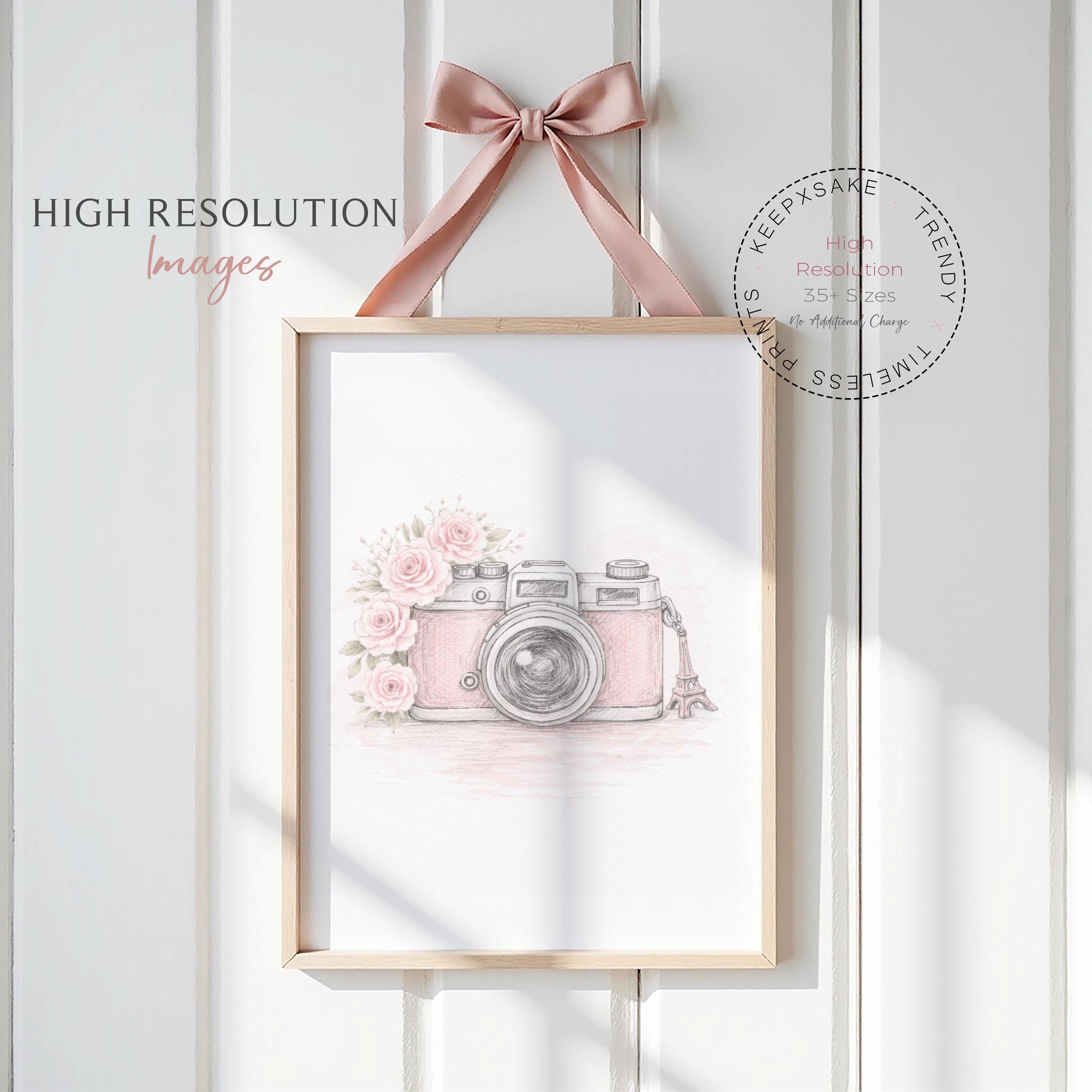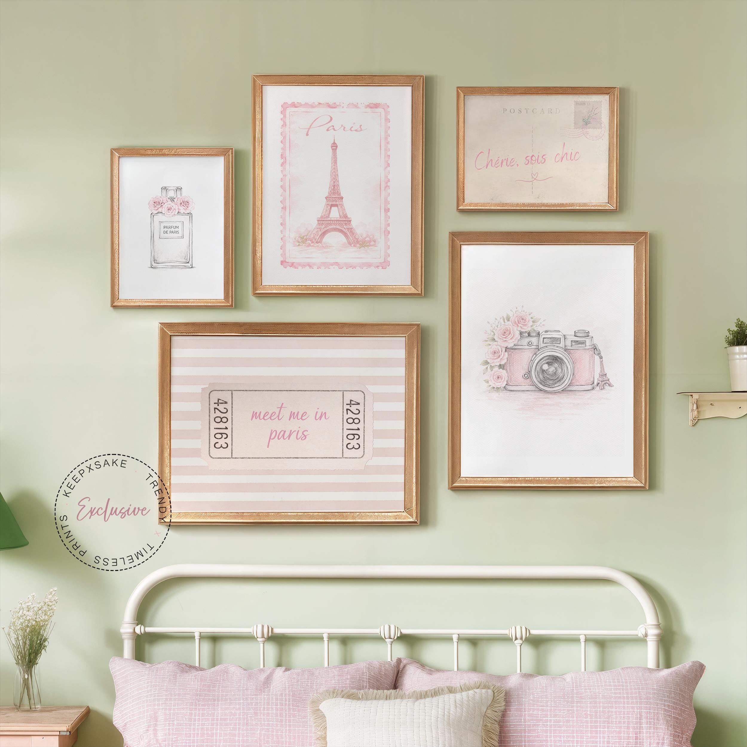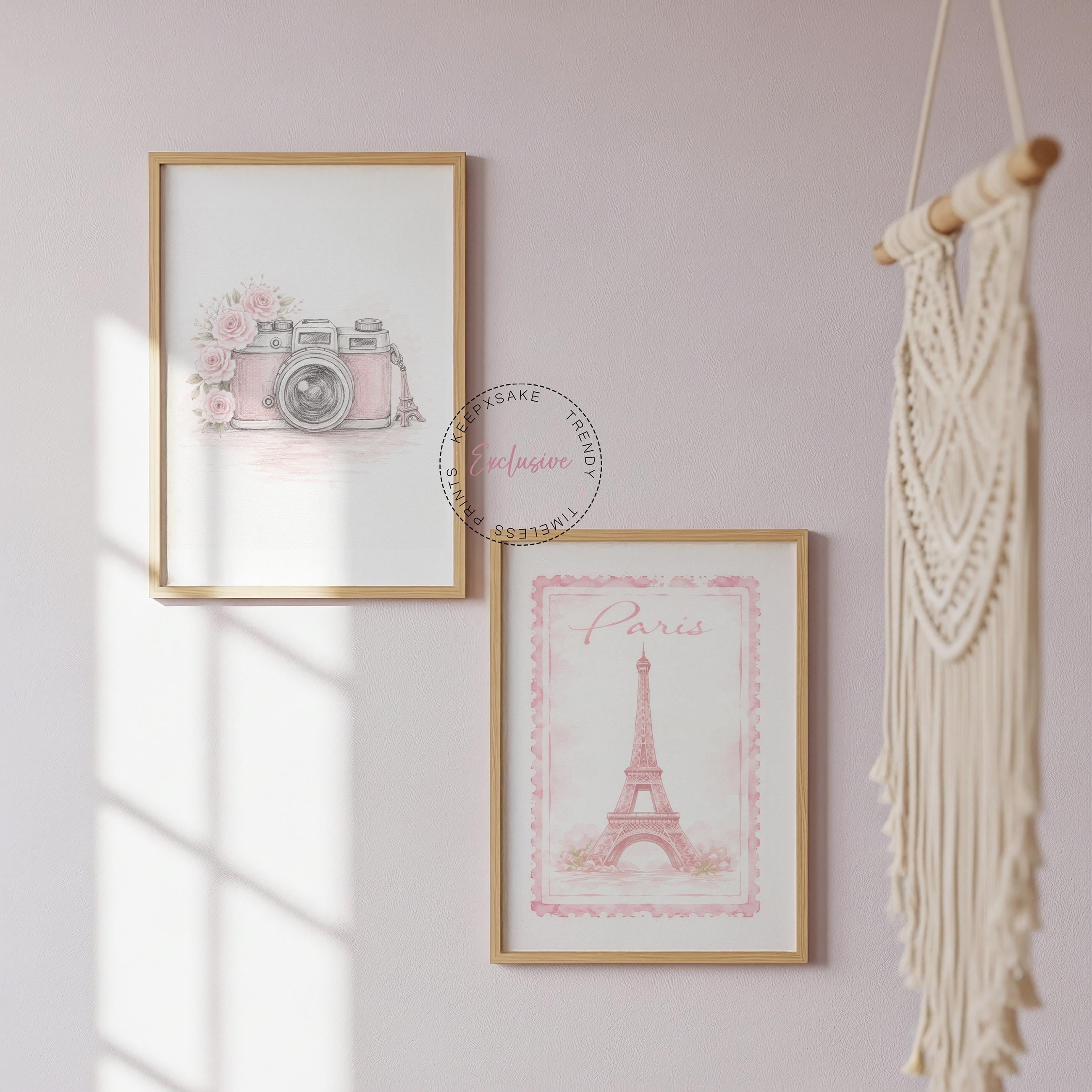 Bring soft Parisian charm to your little fashionista’s room with this elegant vintage-inspired Paris wall art set. Featuring delicate blush pink tones, a romantic Eiffel Tower illustration, chic fashion elements, and nostalgic postcard details, this printable decor set creates a timeless and feminine bedroom aesthetic.