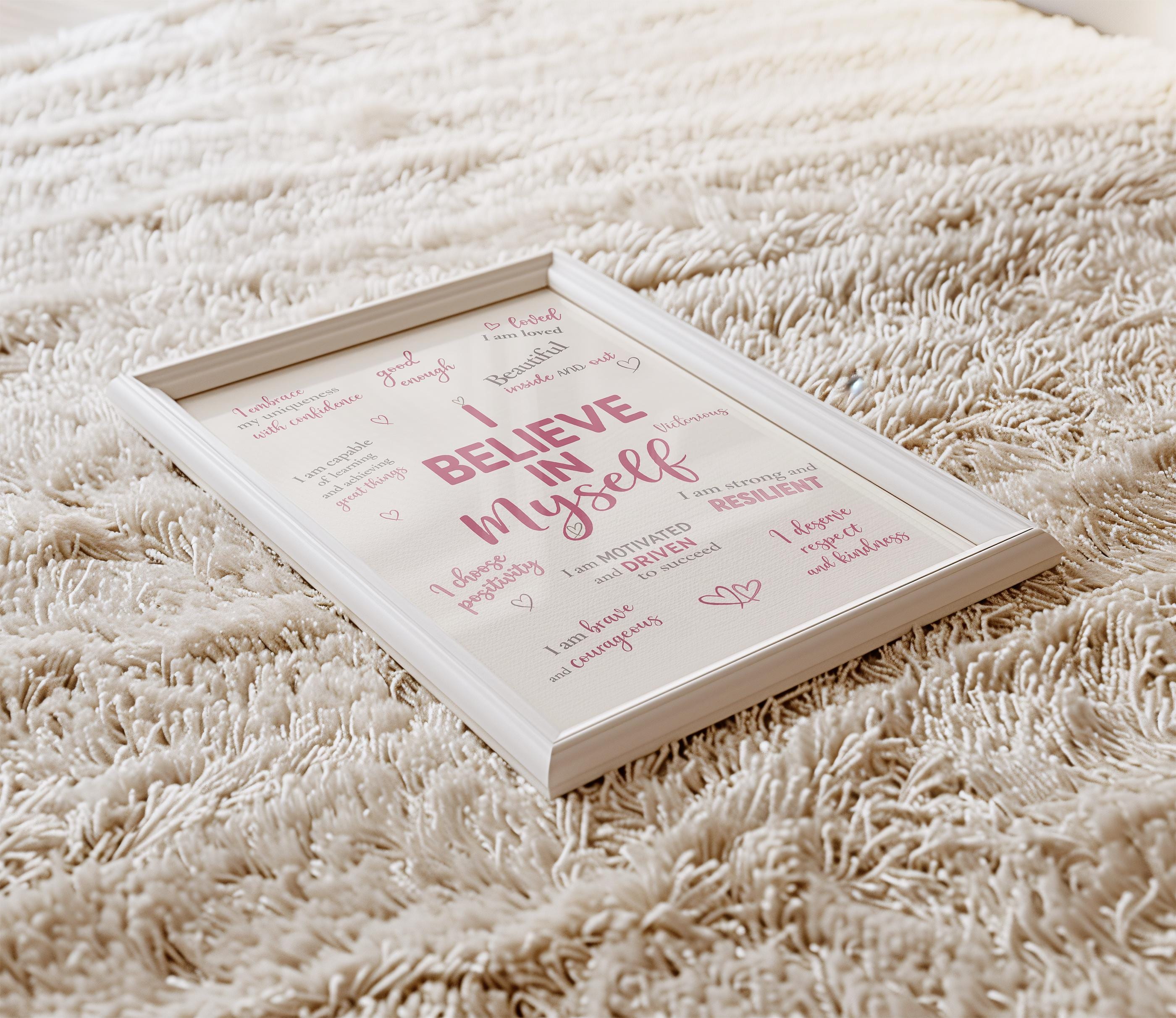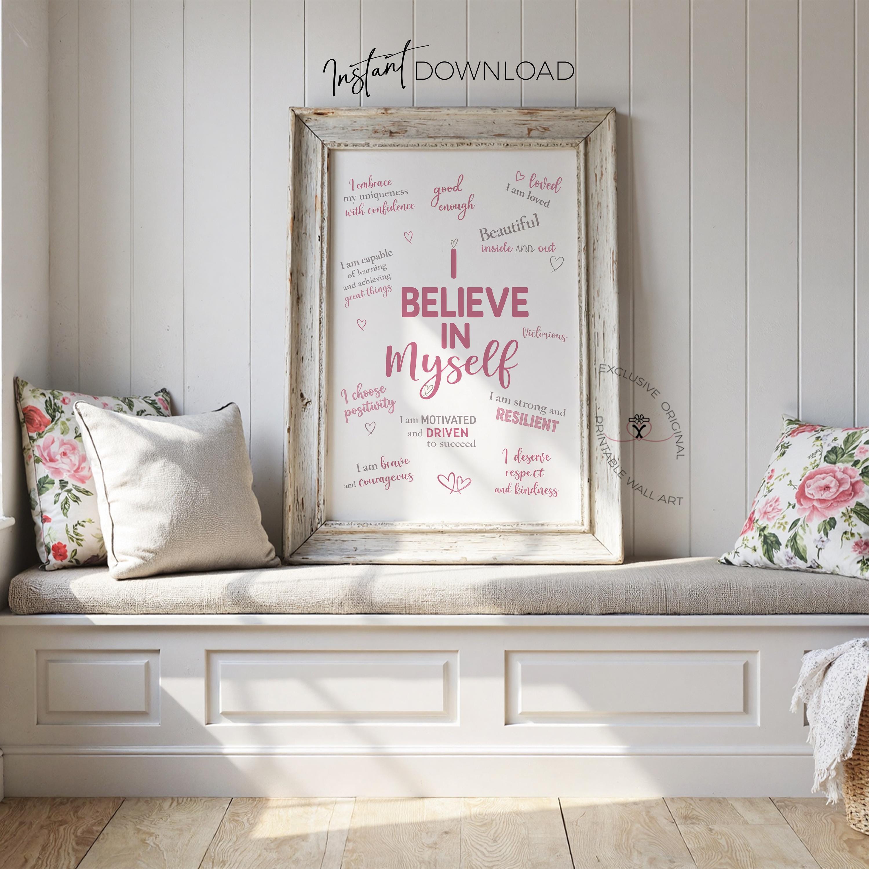 Encourage confidence, positivity, and self-belief with this beautiful tween girl affirmation wall art printable. Featuring soft pink tones and empowering phrases like “I Believe in Myself,” “I am strong and resilient,” and “I choose positivity,” this motivational print is perfect for creating an uplifting space for girls to grow, dream, and thrive.