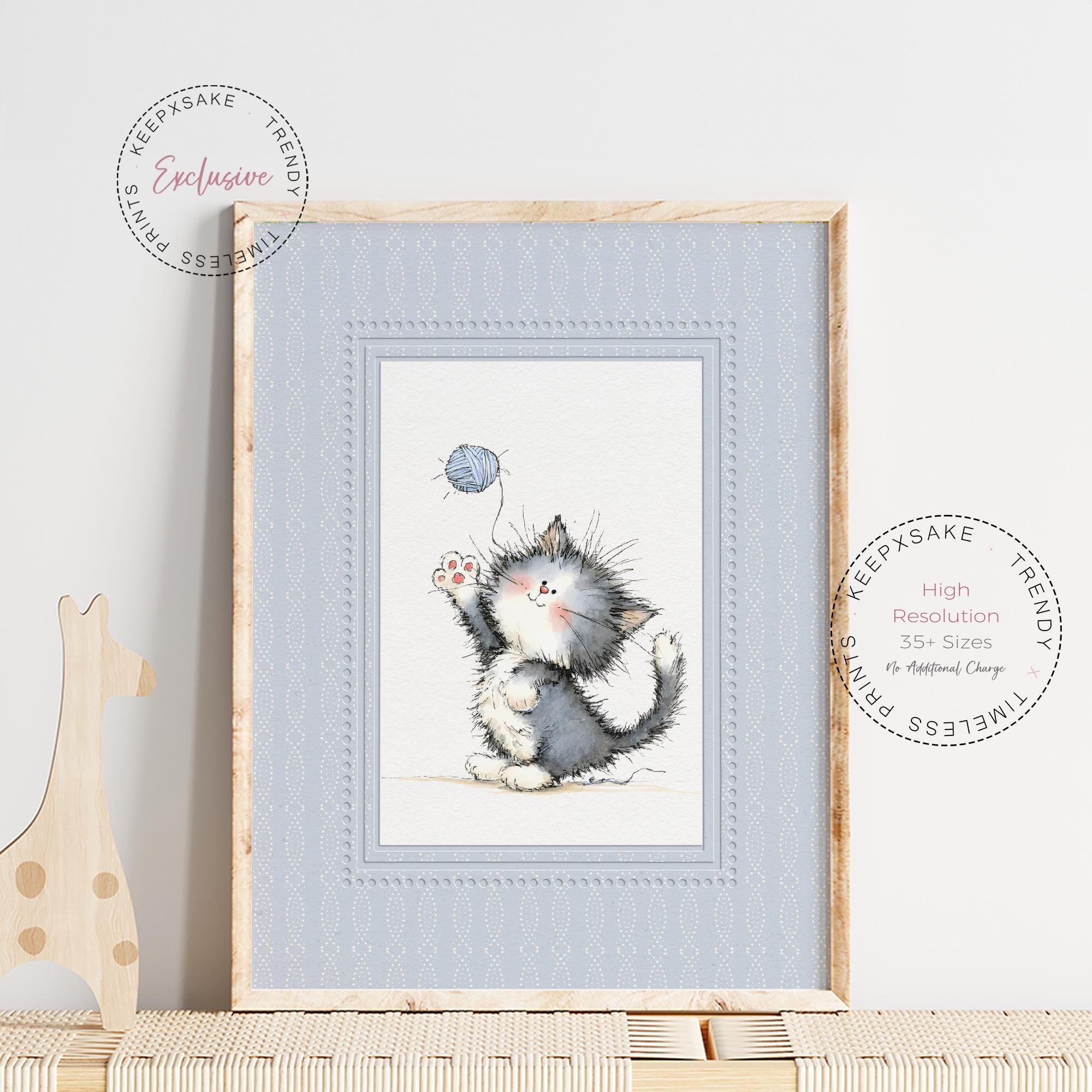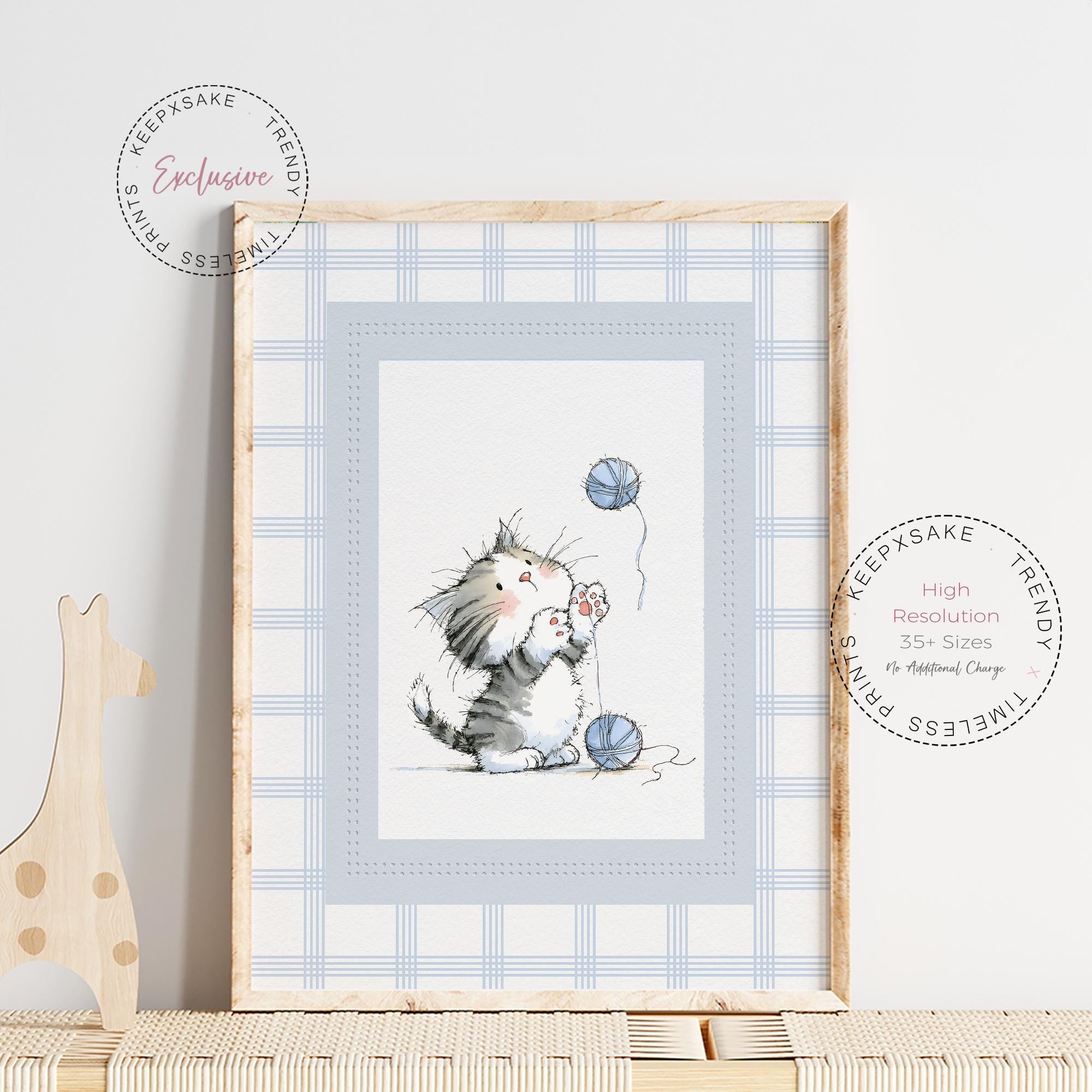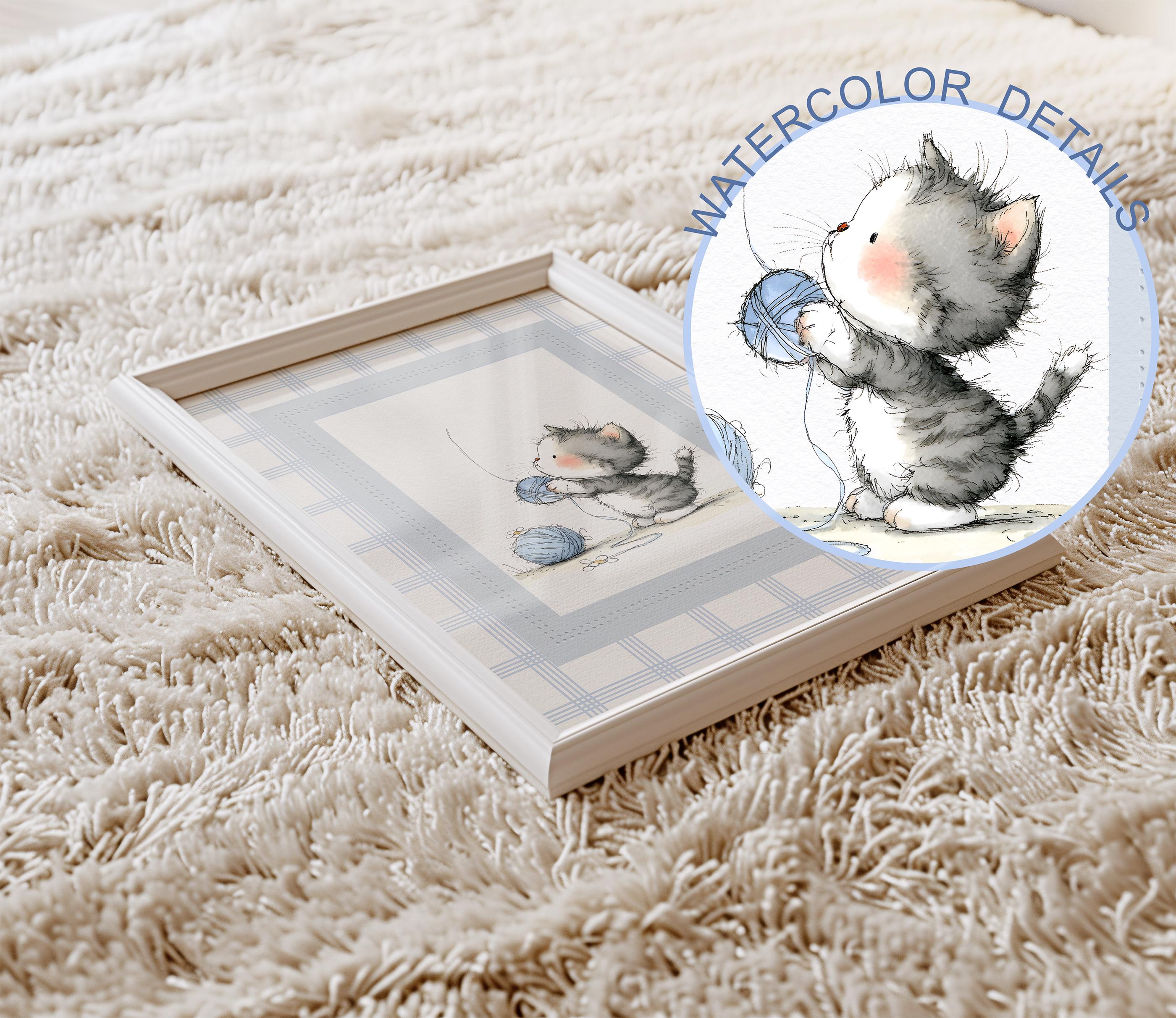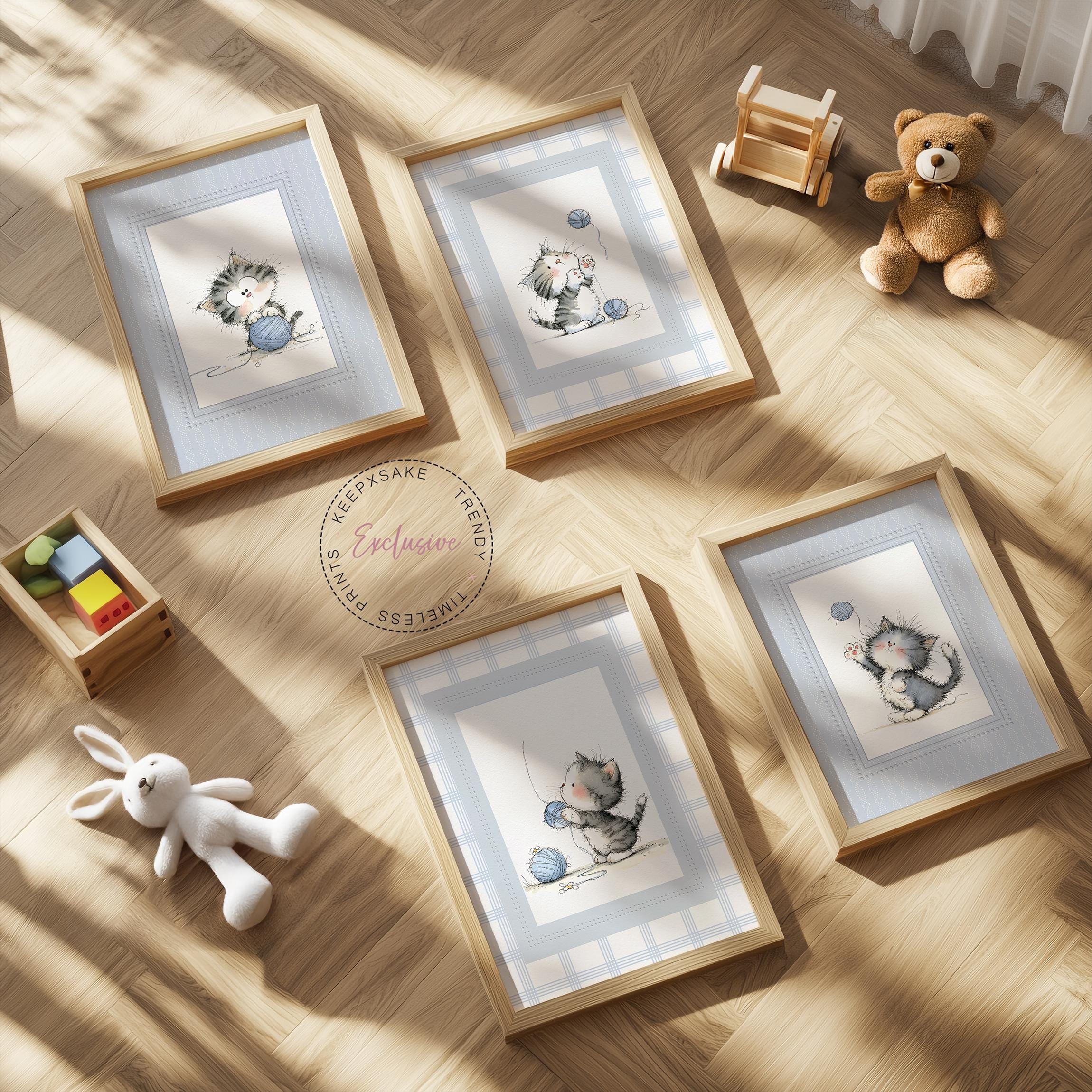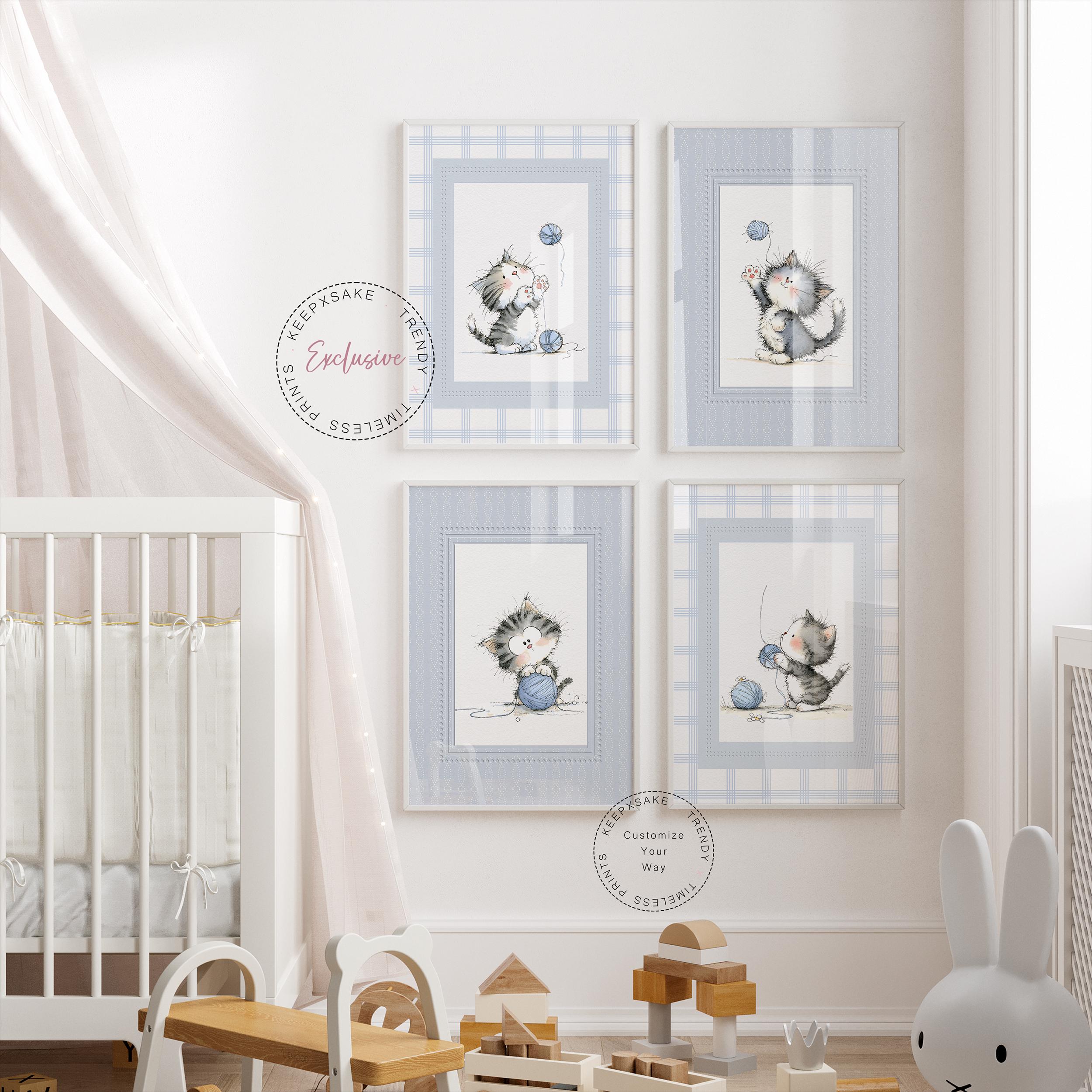 Create the sweetest little corner for your baby with this adorable set of four kitten nursery prints, designed in a soft vintage storybook style. Each illustration features a fluffy kitten playing with yarn in calming blue and neutral tones, making this set perfect for baby boy nurseries, cozy reading corners, or gentle woodland-inspired children’s rooms. The delicate watercolor textures and classic storybook charm bring warmth and personality to your nursery while maintaining a peaceful and soothing aesthetic that complements modern, neutral décor styles.