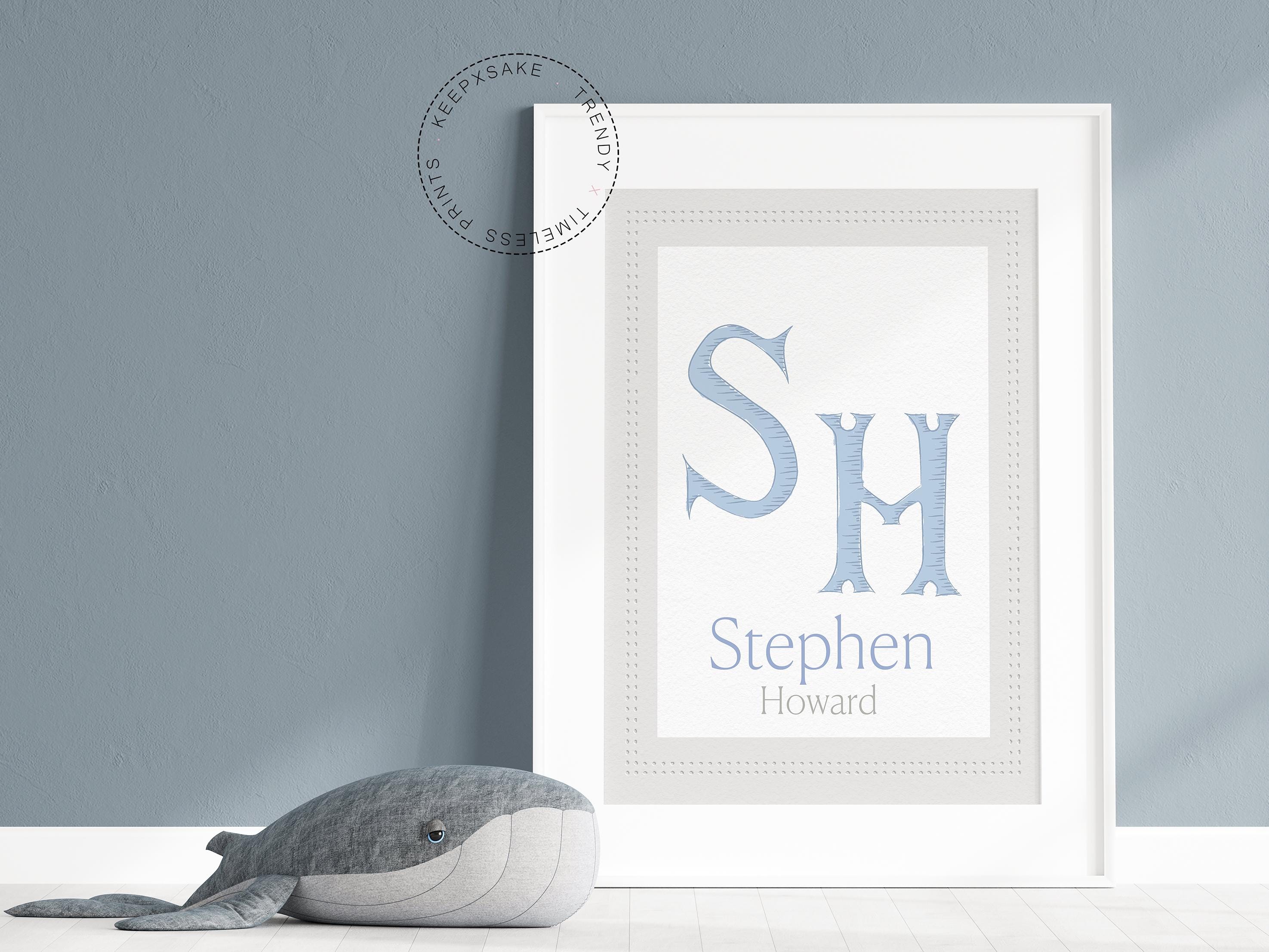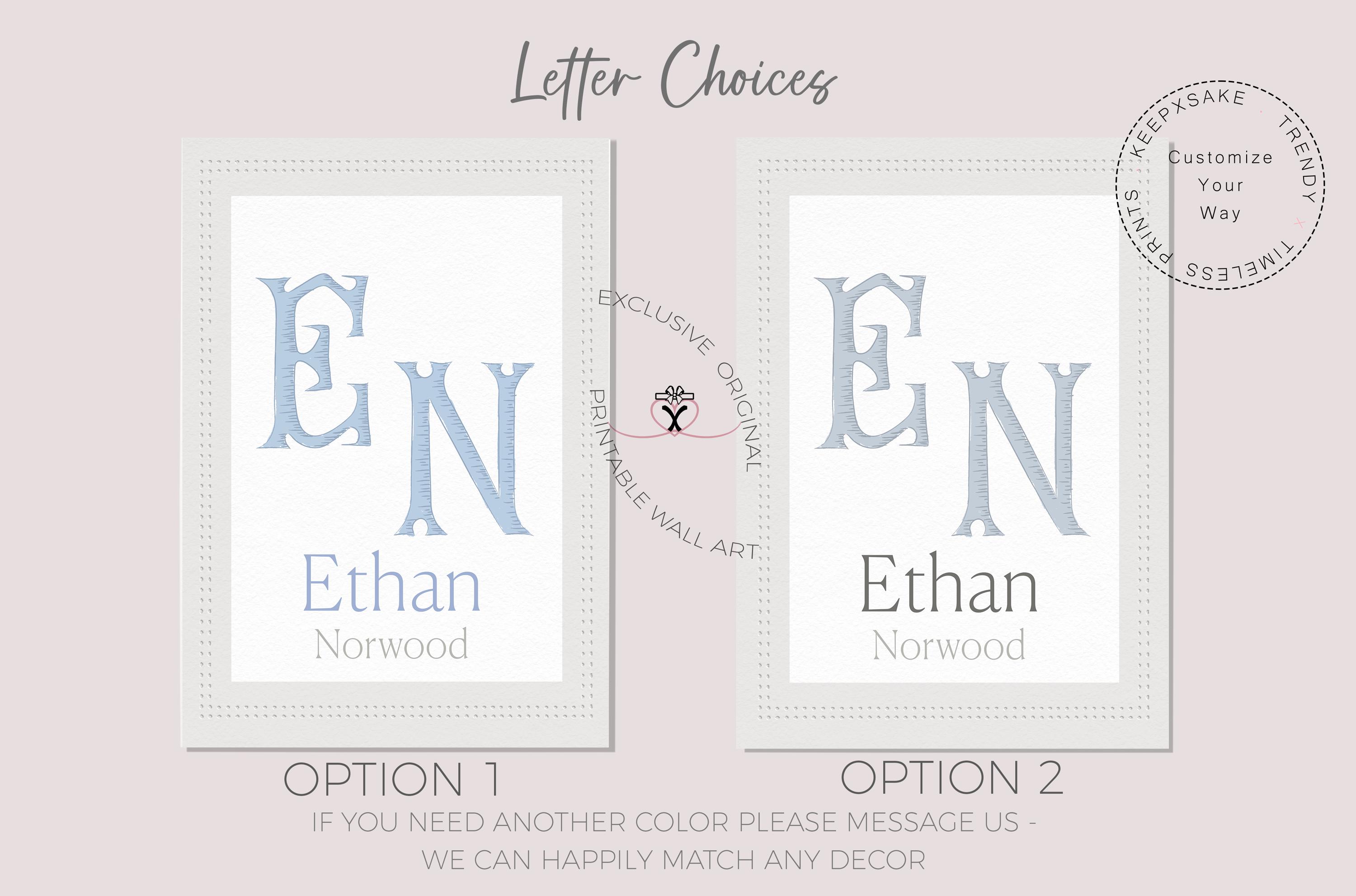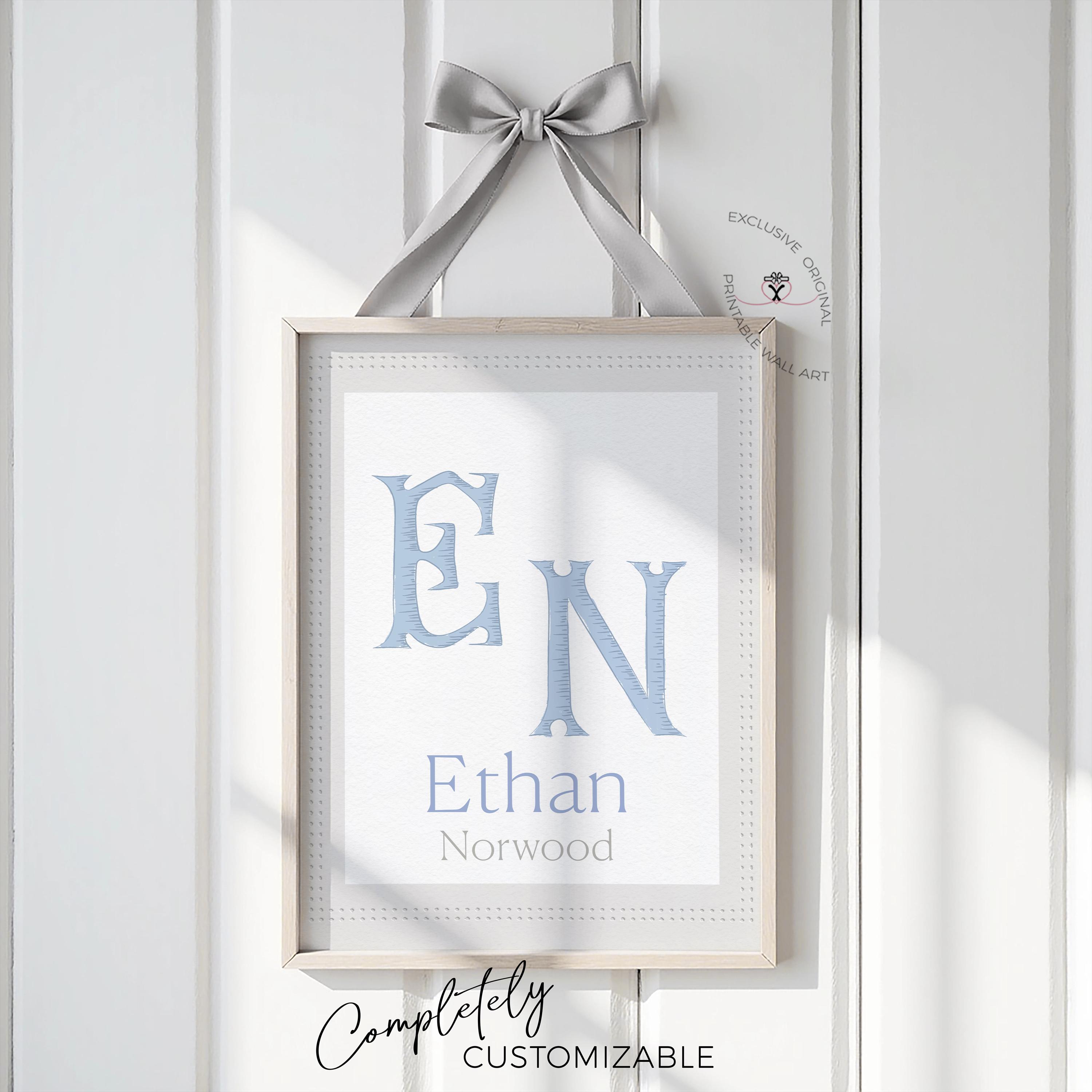 Create a meaningful keepsake for your little one with this personalized nursery name print, designed to add a timeless and elegant touch to your baby's room. This custom wall art features your child’s initial monogram paired with their full name, creating a beautiful focal point for nurseries, baby rooms, and children’s spaces. The soft blue tones and classic typography make this piece perfect for baby boy nurseries, neutral nursery themes, and traditional children’s décor.