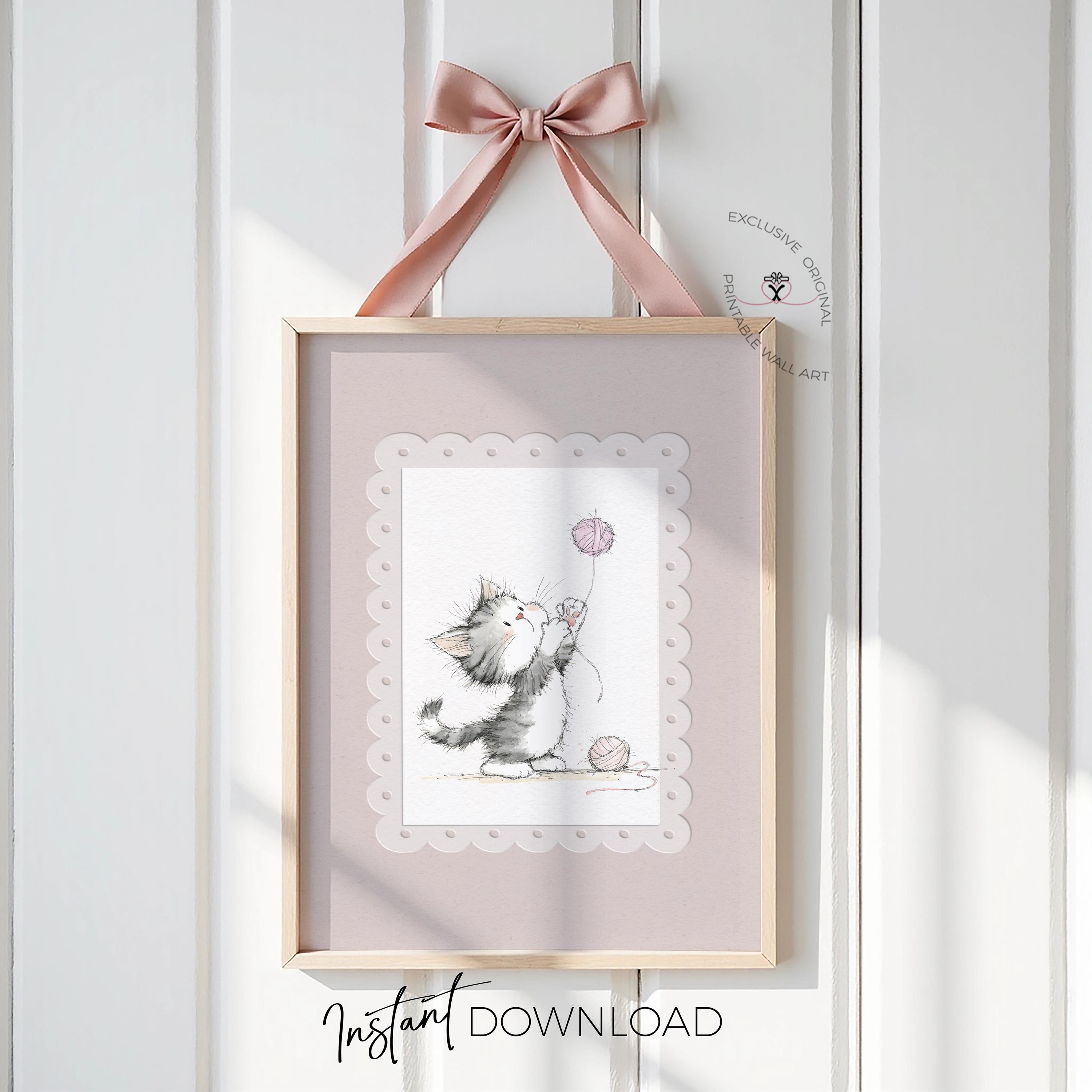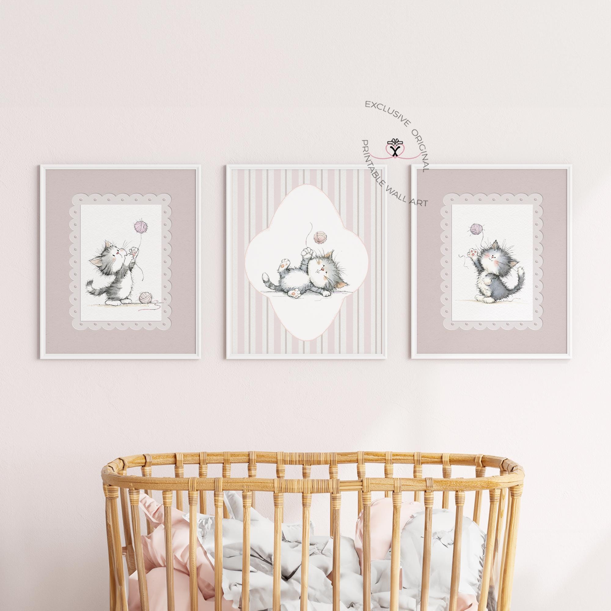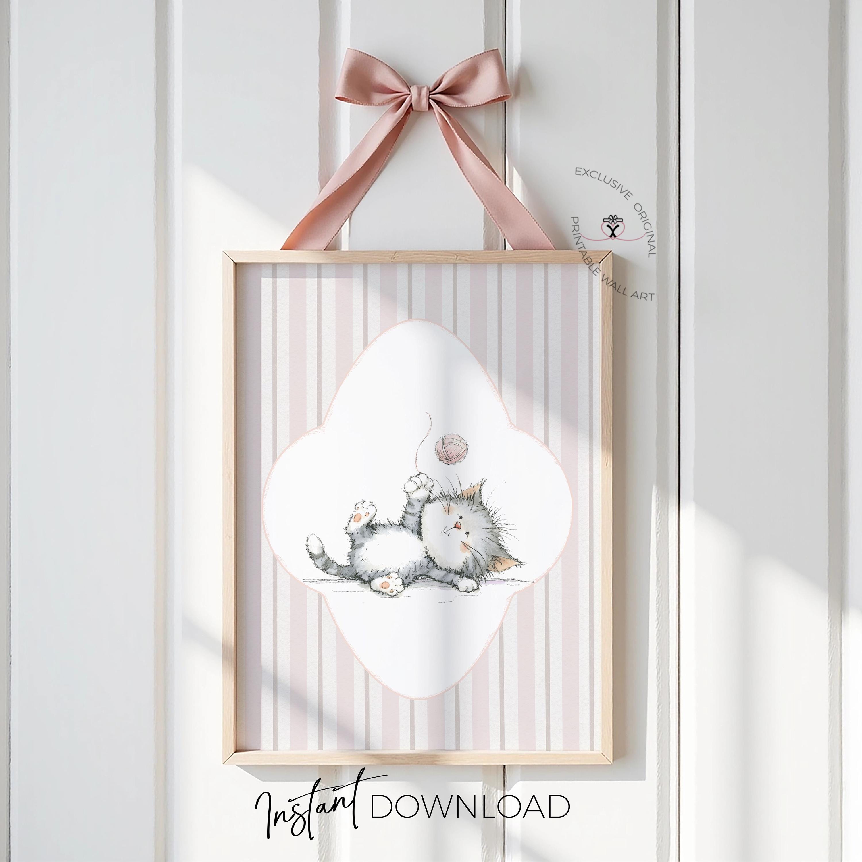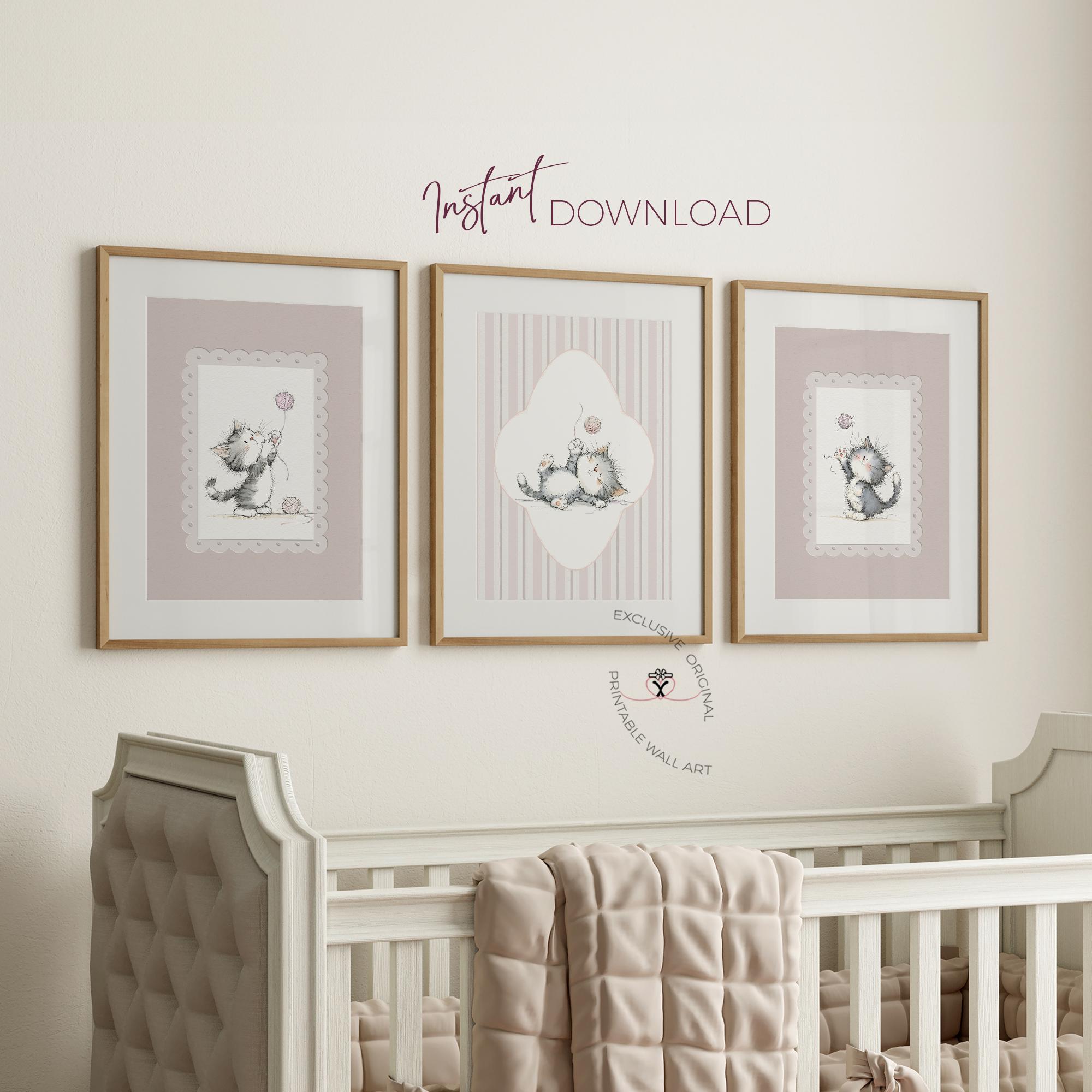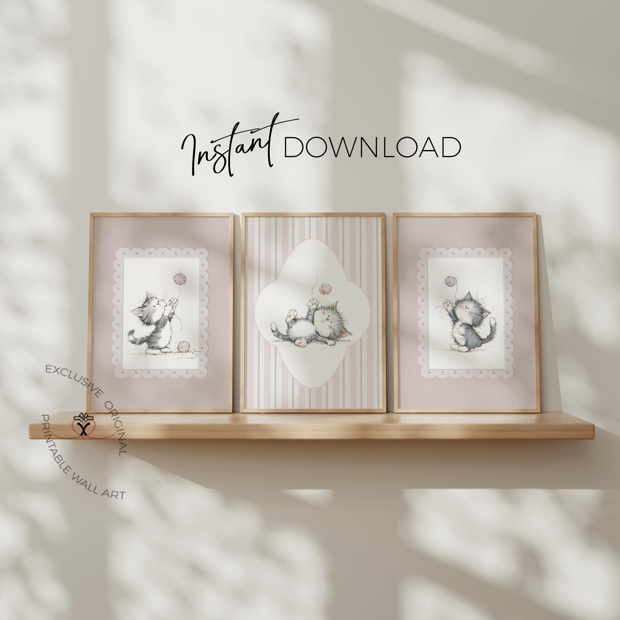 Create a soft, dreamy nursery with this adorable blush pink kitten wall art set. Featuring sweet playful kittens in delicate vintage-inspired illustrations, this printable artwork adds a gentle, whimsical charm to any baby girl nursery, toddler bedroom, or cozy cottagecore space.