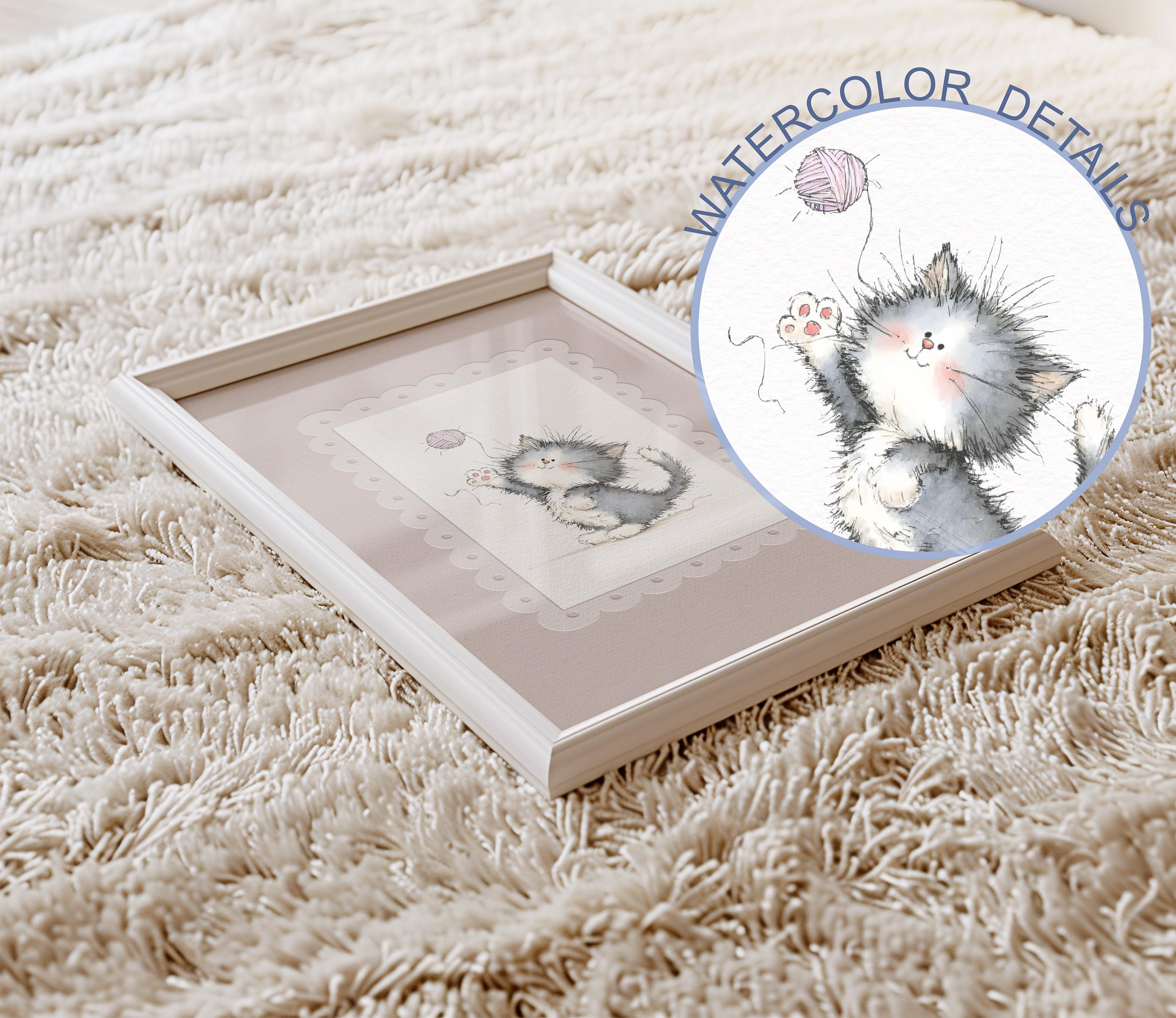 The soft blush tones, delicate frames, and charming kitten characters make this set perfect for creating a warm and comforting nursery environment while keeping a timeless aesthetic that grows with your child.