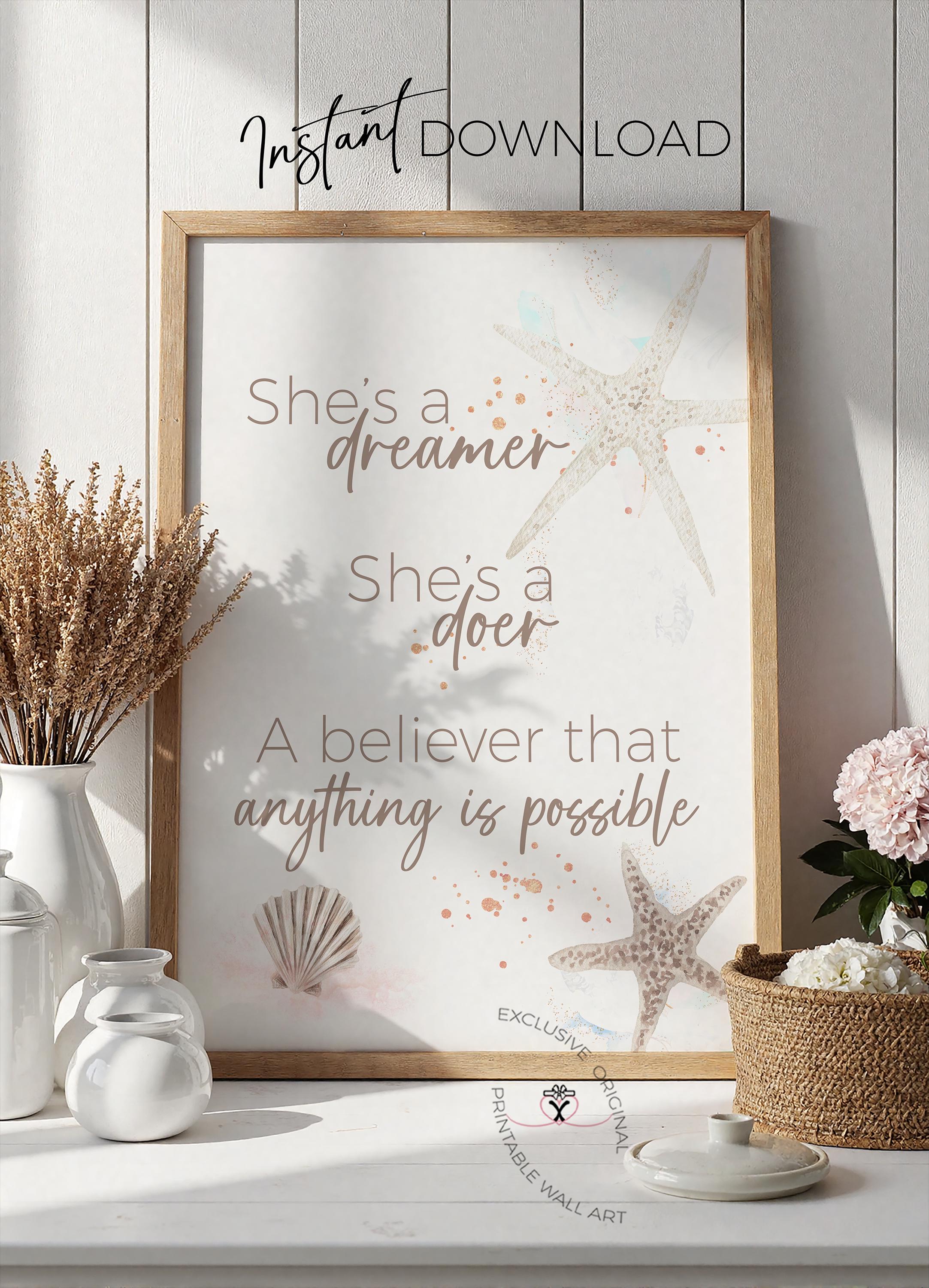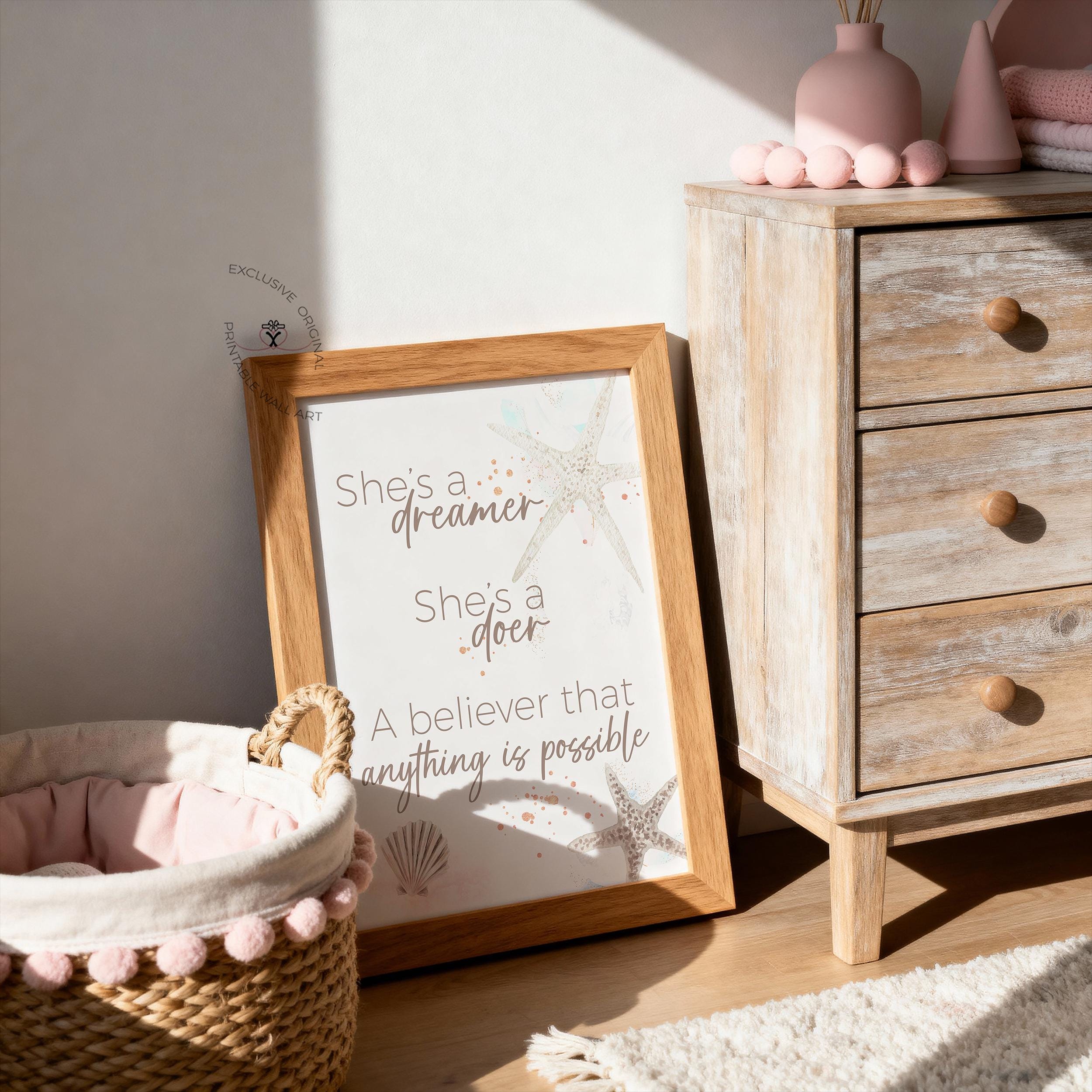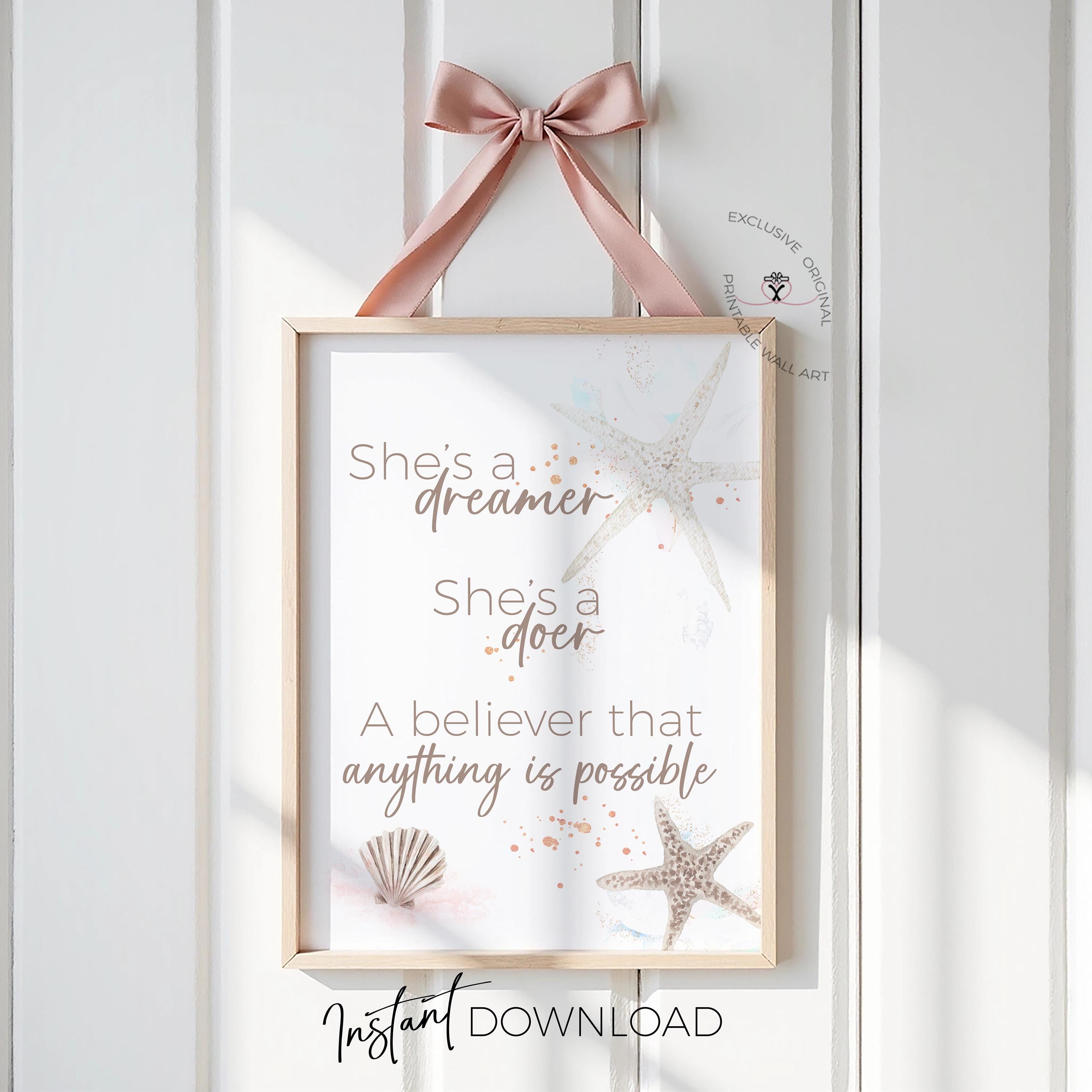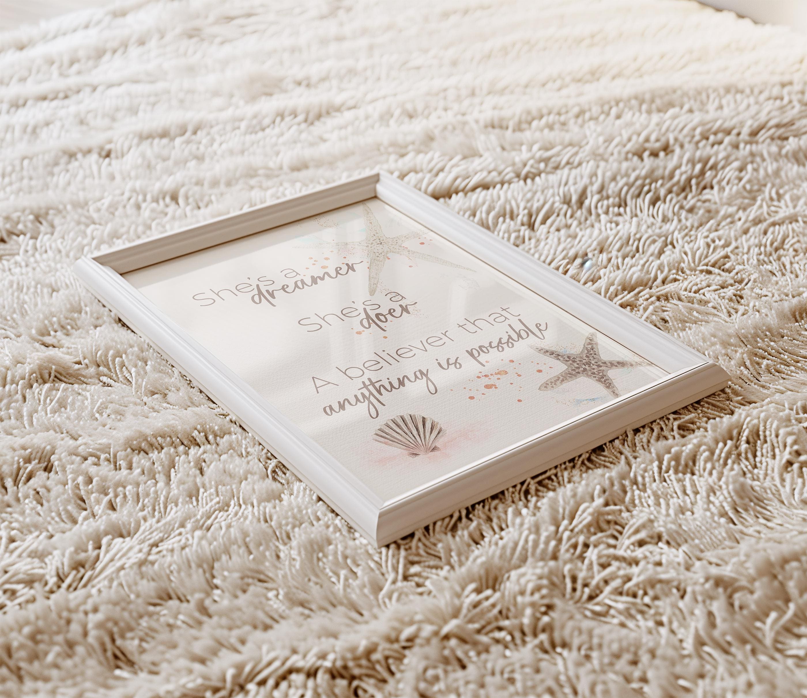 This dreamy coastal-inspired quote print was designed for girls who are growing into themselves — full of imagination, confidence, and big, beautiful dreams.